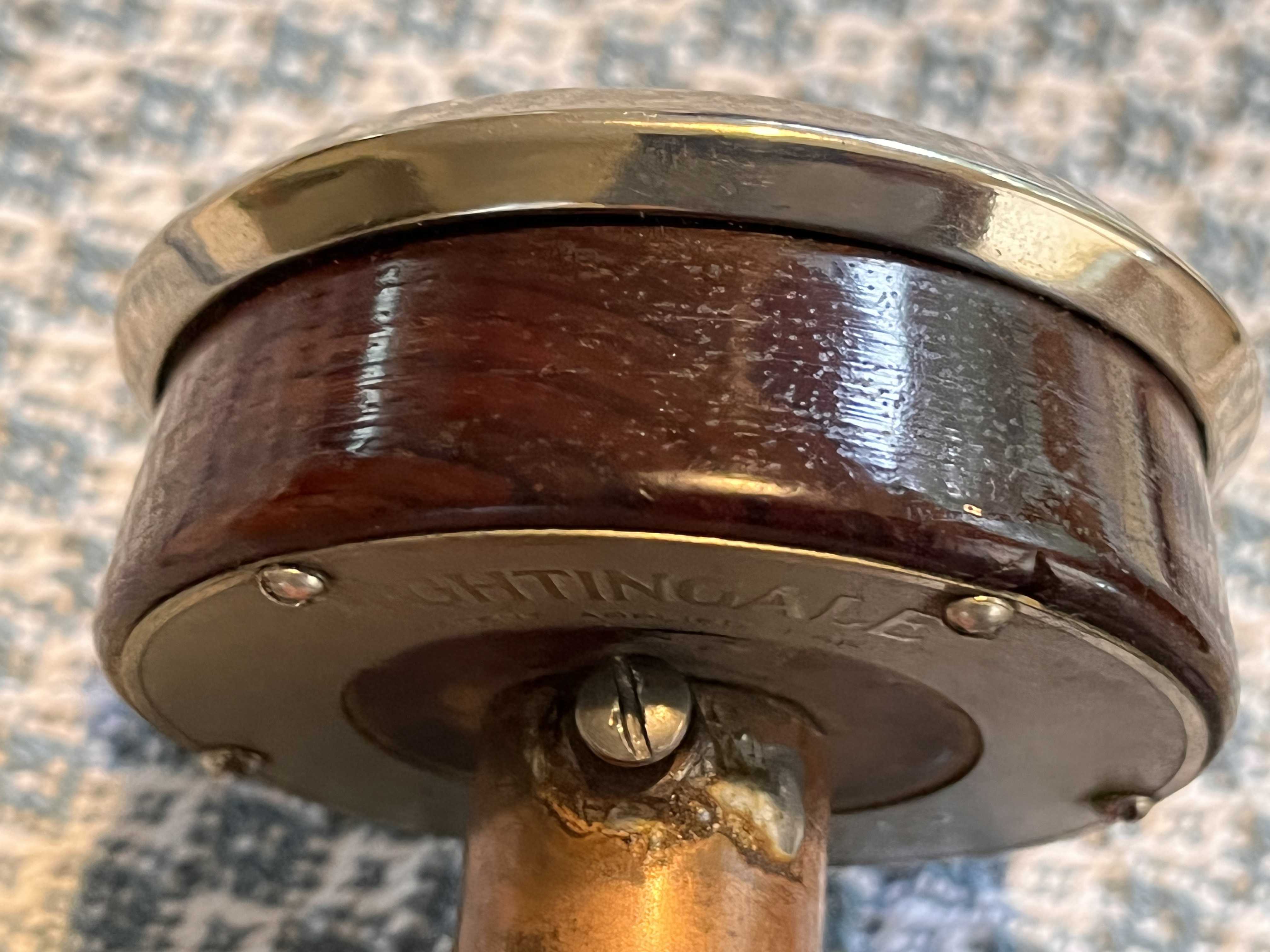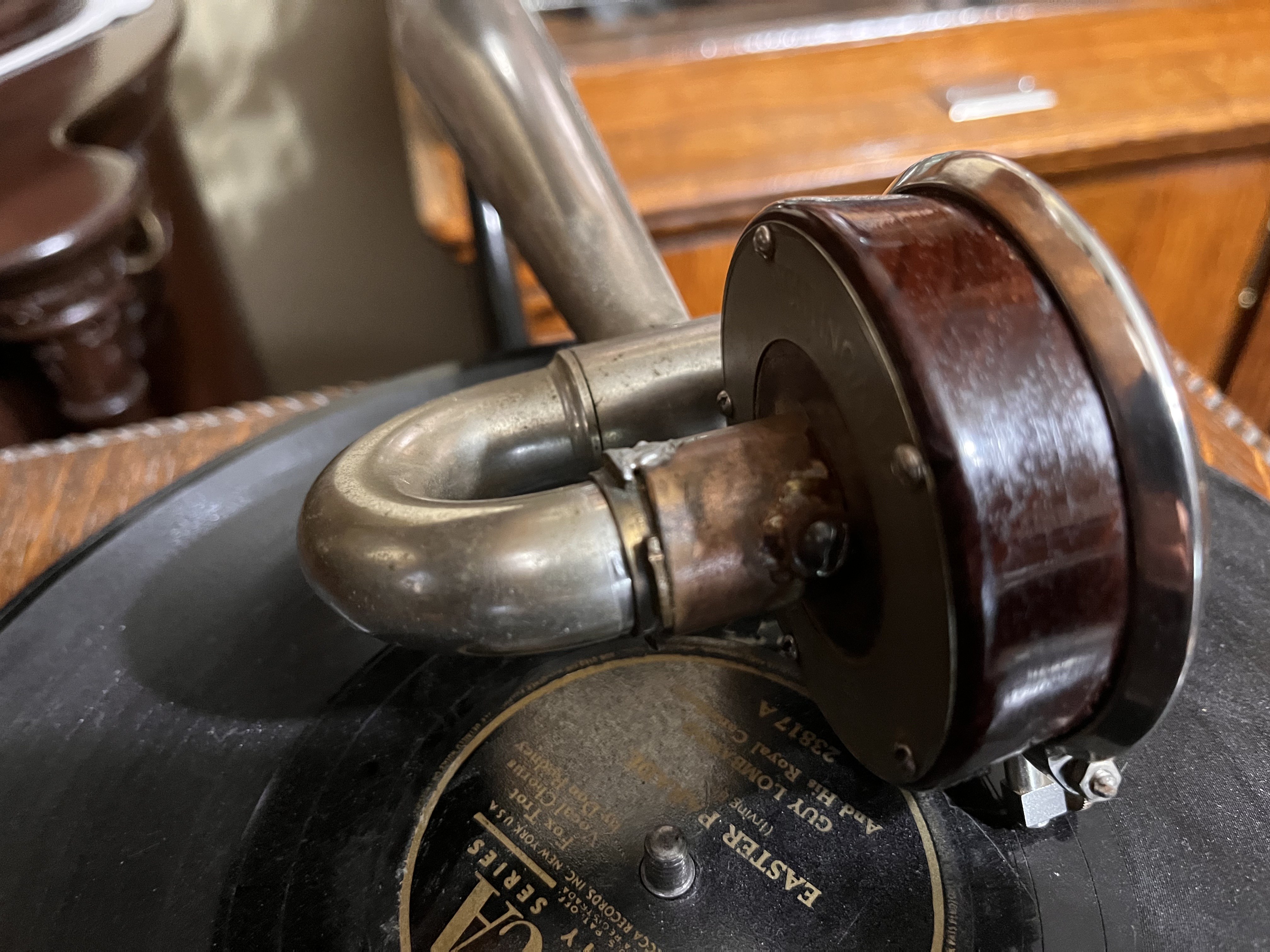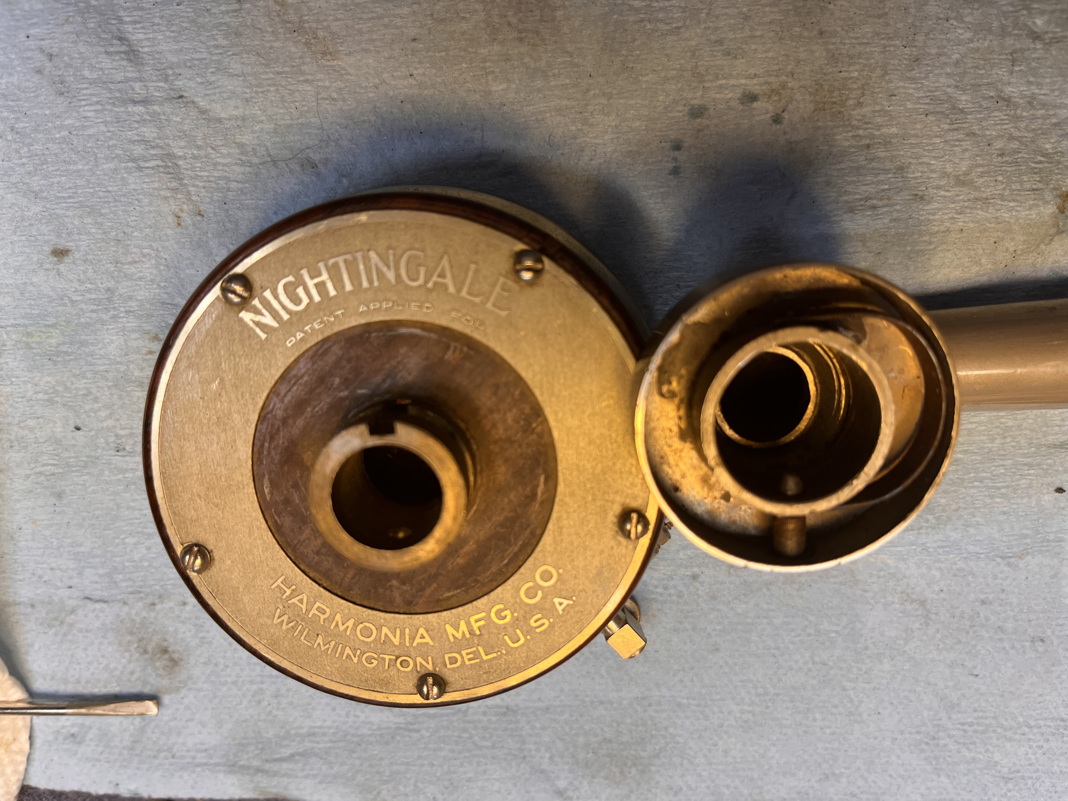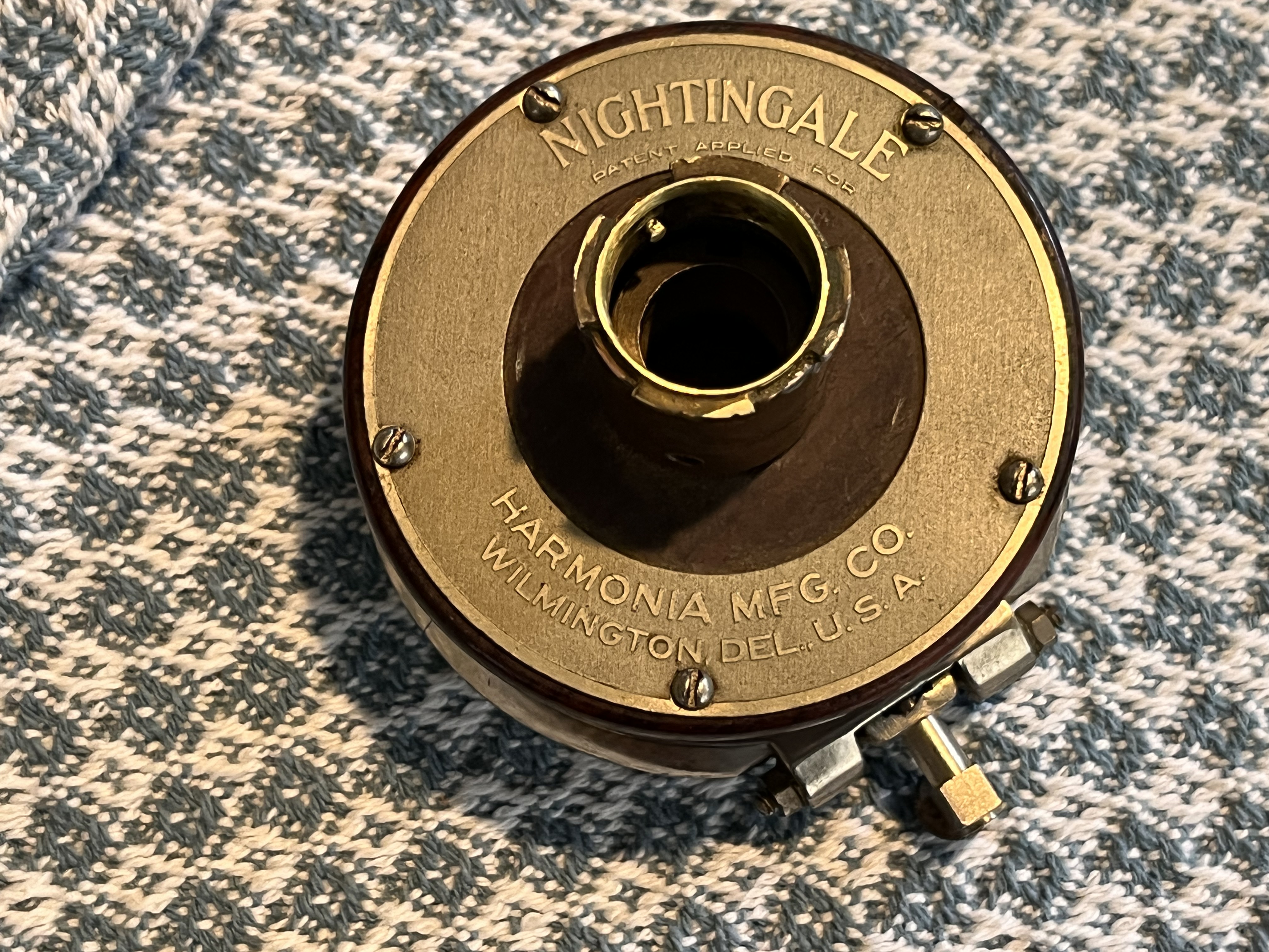 This is a very unusual reproducer. It has a large wood body and a nickel bezel. It is called the "Nighteingale" and is made by the Harmonia Mfg Co. in Wilmington Delaware. I have never seen one of these before. it is about 2 ¾" in diameter and 1" thick. The reproducer looks like it was originally made to play on Columbia phonographs and it easily goes on a Columbia tonearm and turns to snap into the playing position. Someone has made a clever adapter to let it also fit a Victor tonearm. It is in excellent condition and looks new. There is no damage and the wood body looks great. I compared it to both a Columbia and Victor reproducer on their respective machines. It was not too heavy for the machines. To my ear, it had a more mellow tone than either the Columbia or Victor reproducers. I have replaced the rubber gasket and it is nice and tight. As I said before, I believe it is pretty rare.