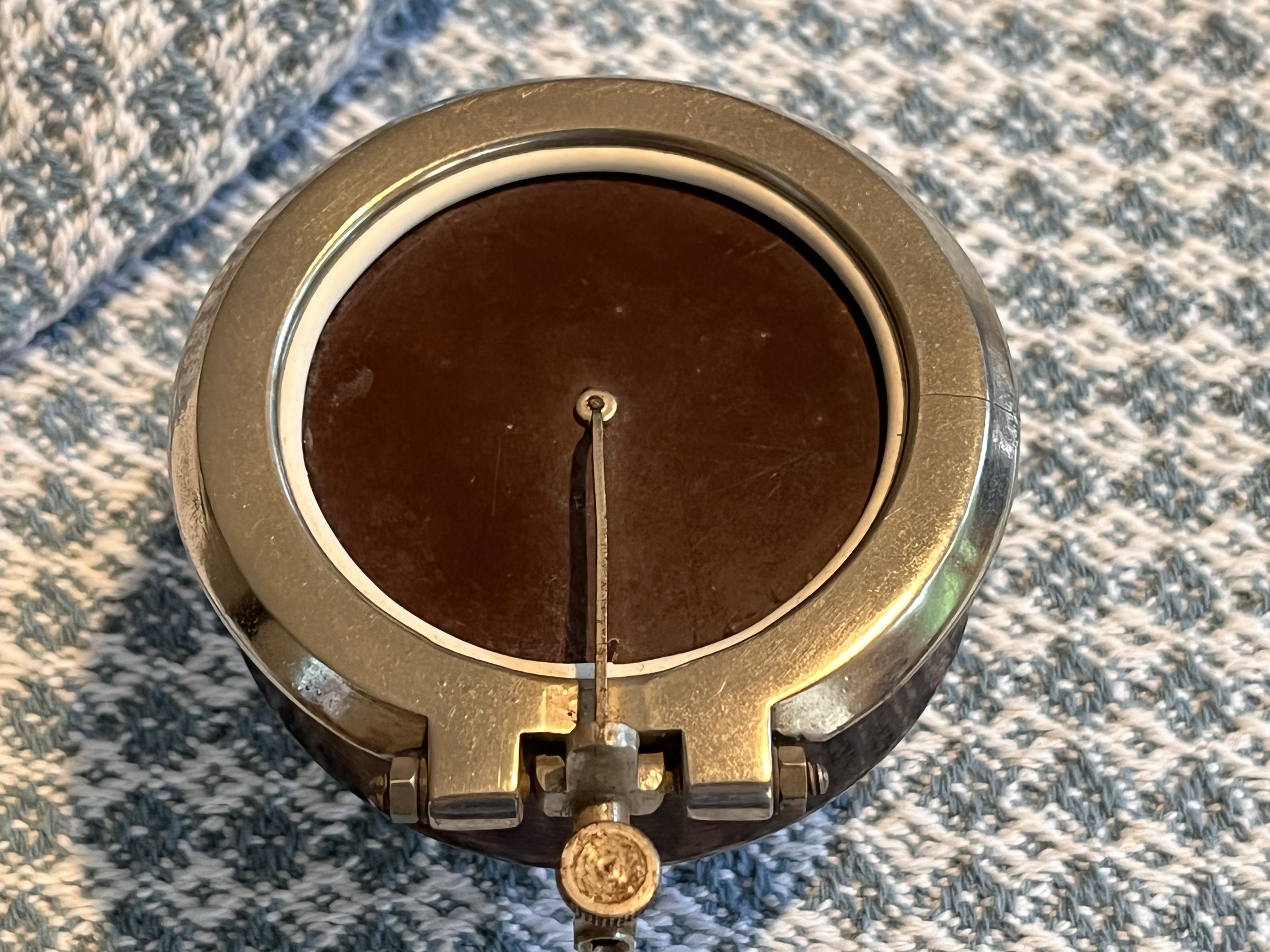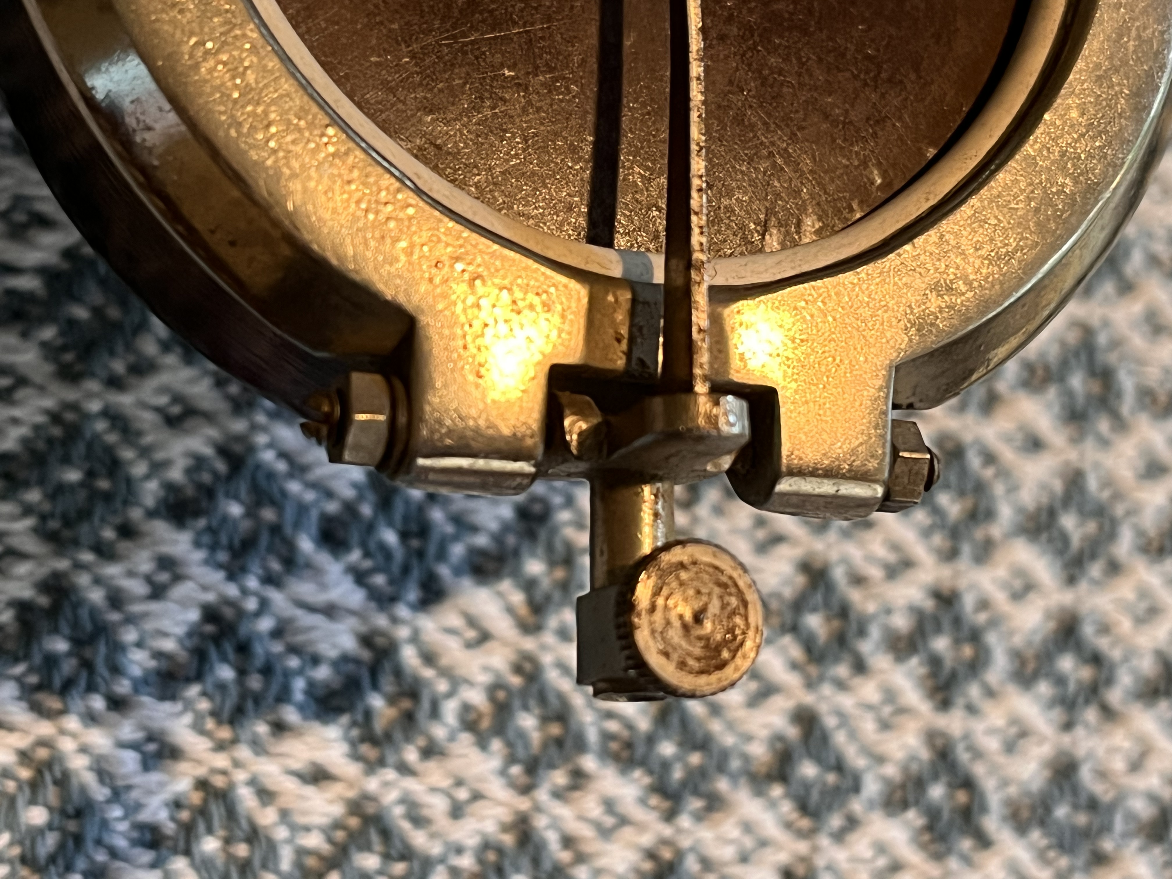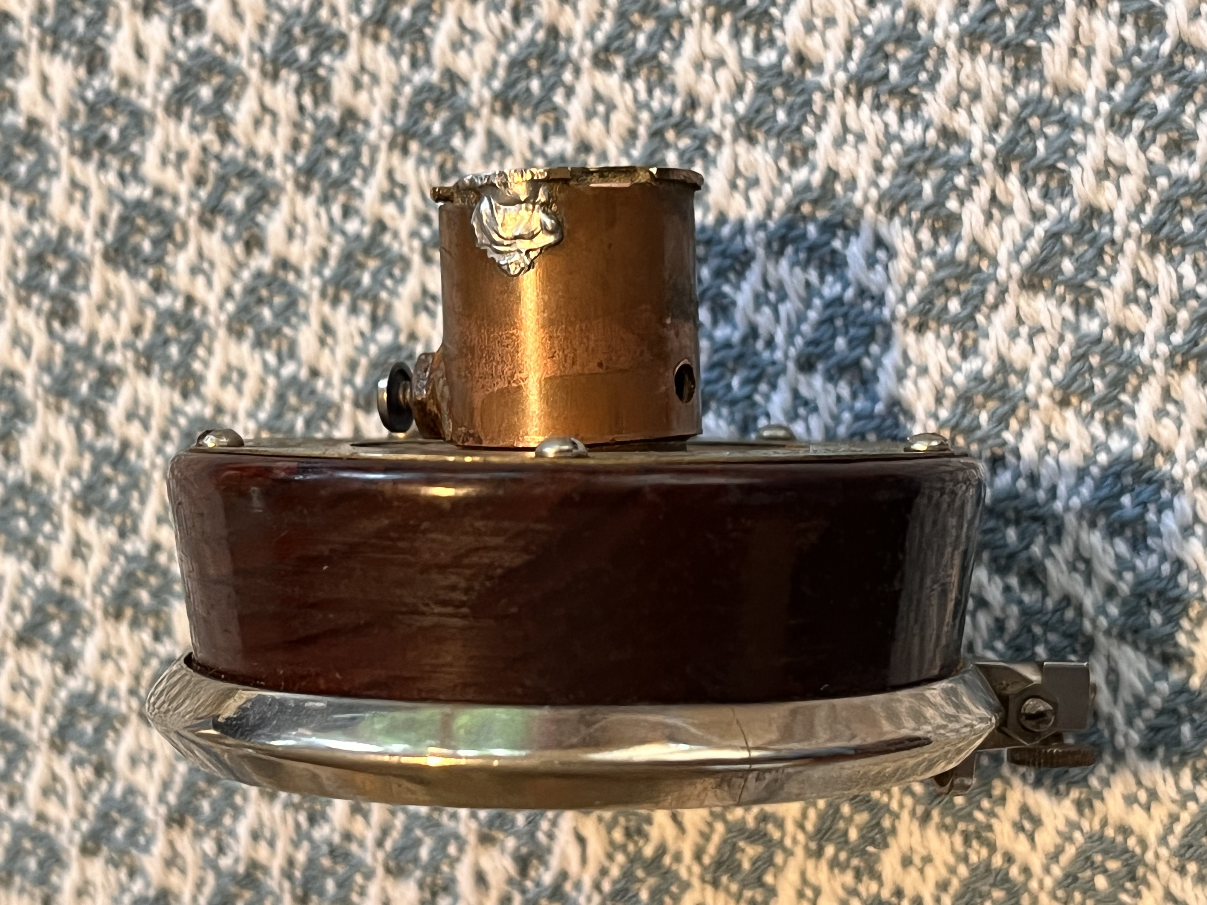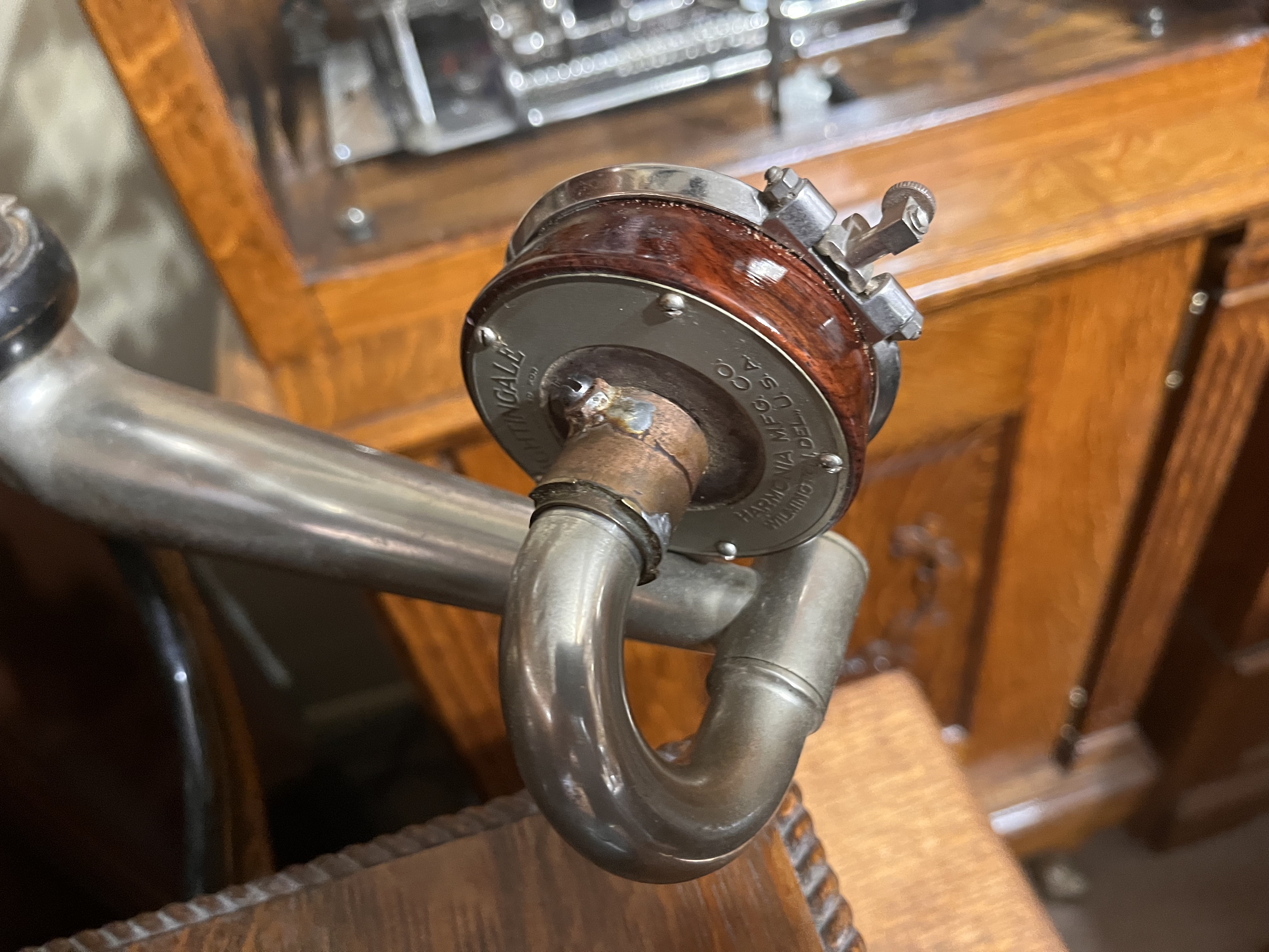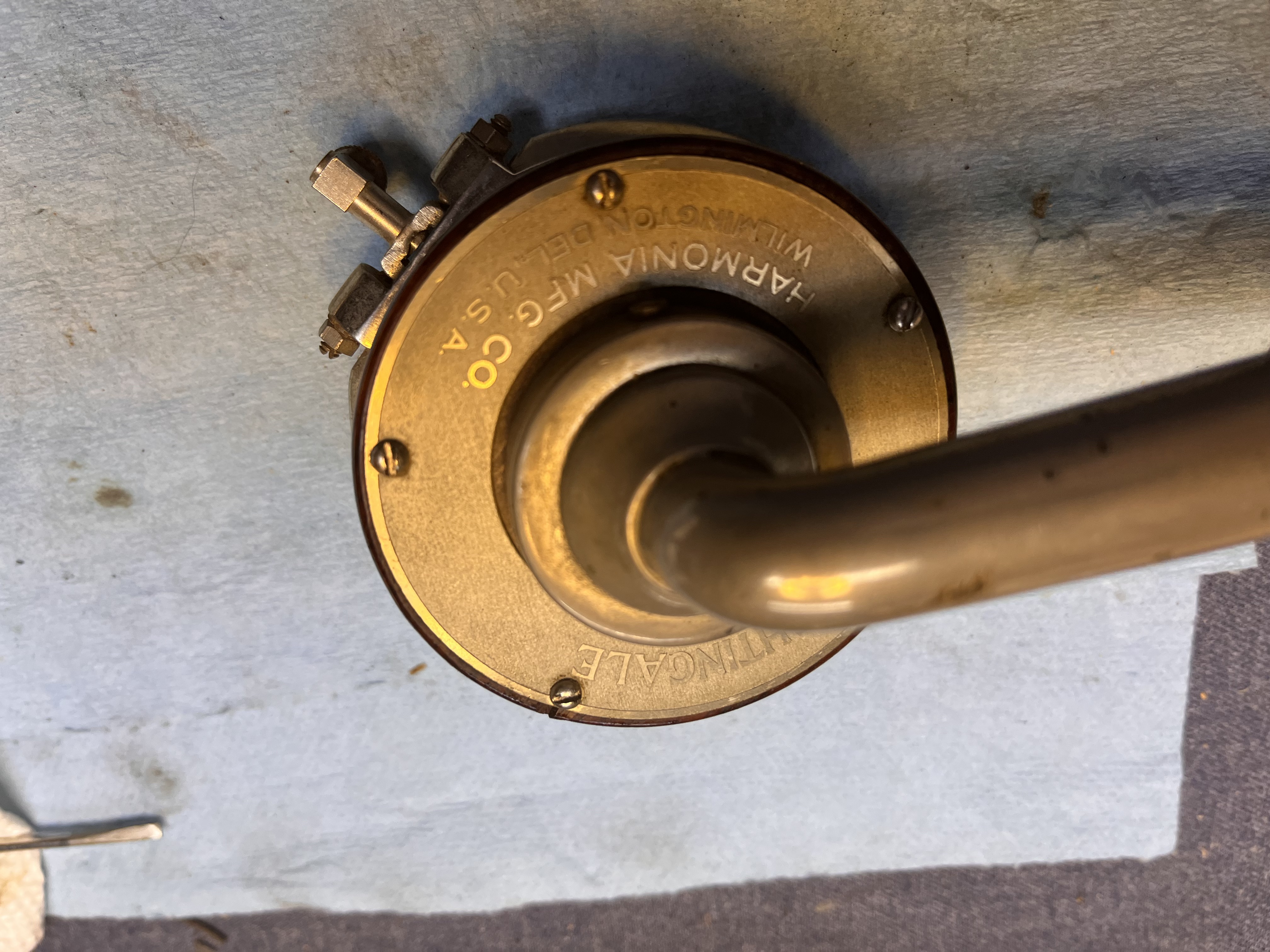 This is a very unusual reproducer. It has a large wood body and a nickel bezel. It is called the "Nighteingale" and is made by the Harmonia Mfg Co. in Wilmington Delaware. I have never seen one of these before. it is about 2 ¾" in diameter and 1" thick. The reproducer looks like it was originally made to play on Columbia phonographs and it easily goes on a Columbia tonearm and turns to snap into the playing position. Someone has made a clever adapter to let it also fit a Victor tonearm. It is in excellent condition and looks new. There is no damage and the wood body looks great. I compared it to both a Columbia and Victor reproducer on their respective machines. It was not too heavy for the machines. To my ear, it had a more mellow tone than either the Columbia or Victor reproducers. I have replaced the rubber gasket and it is nice and tight. As I said before, I believe it is pretty rare.