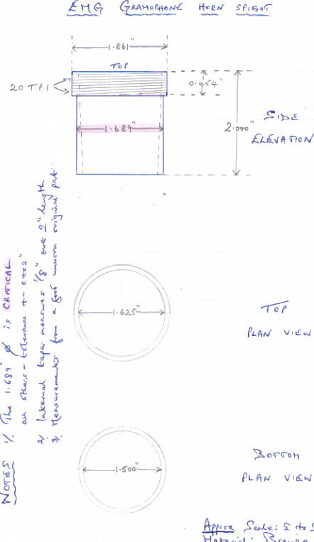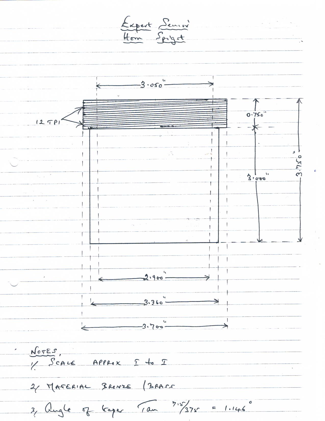 Jon, here are a few sketches which you may find helpful as you go along ? EMG had to use bronze for strength whereas, with their larger diameters, Expert were able to get away with brass. Conduit material (for mine) is LM 6 with no heat treatment---ie inert for extraneous resonance and acoustic purposes. The actual EMG material was pretty similar as far as I can tell. I could also measure the spigots for Expert Junior and Minor if you need such. Have fun !