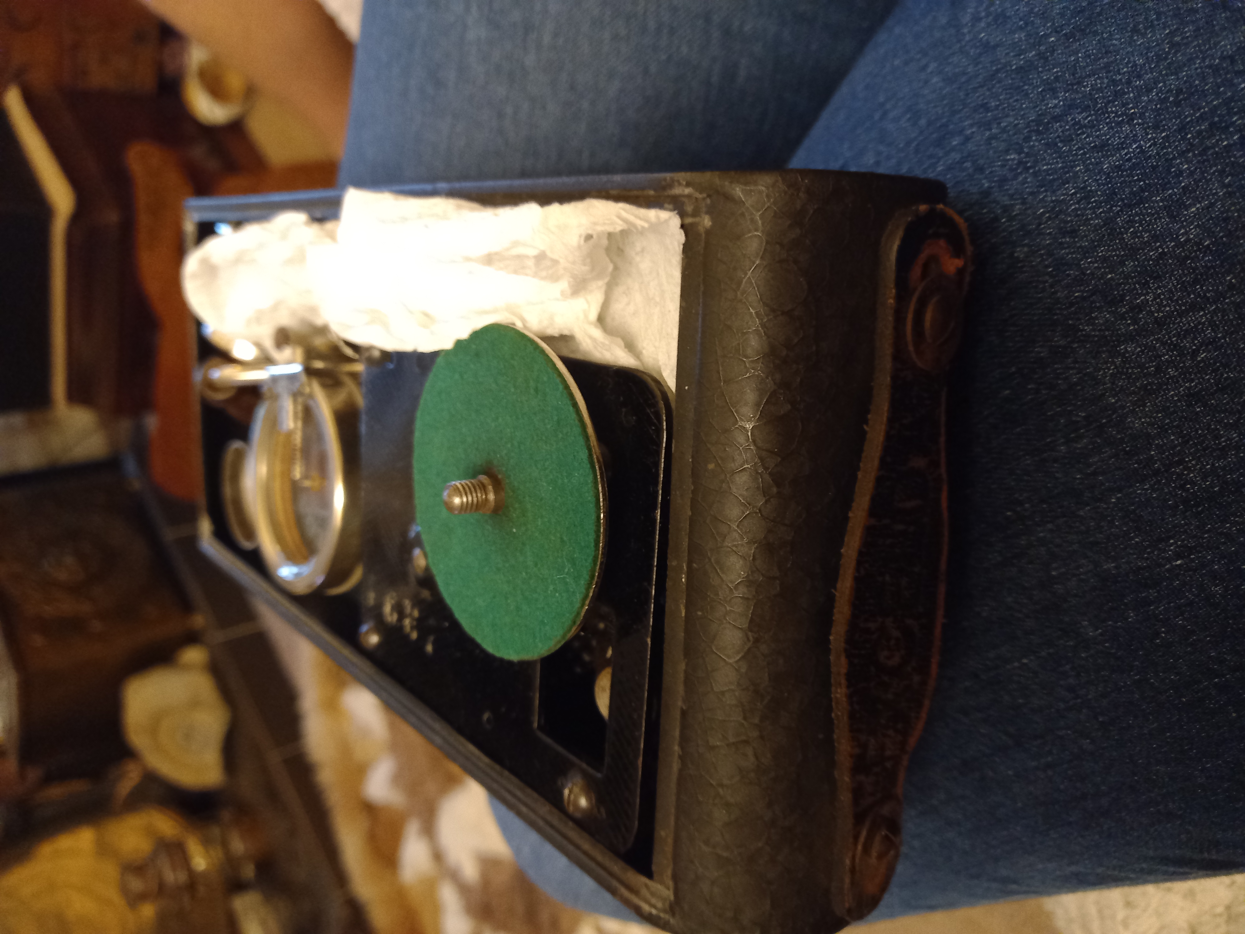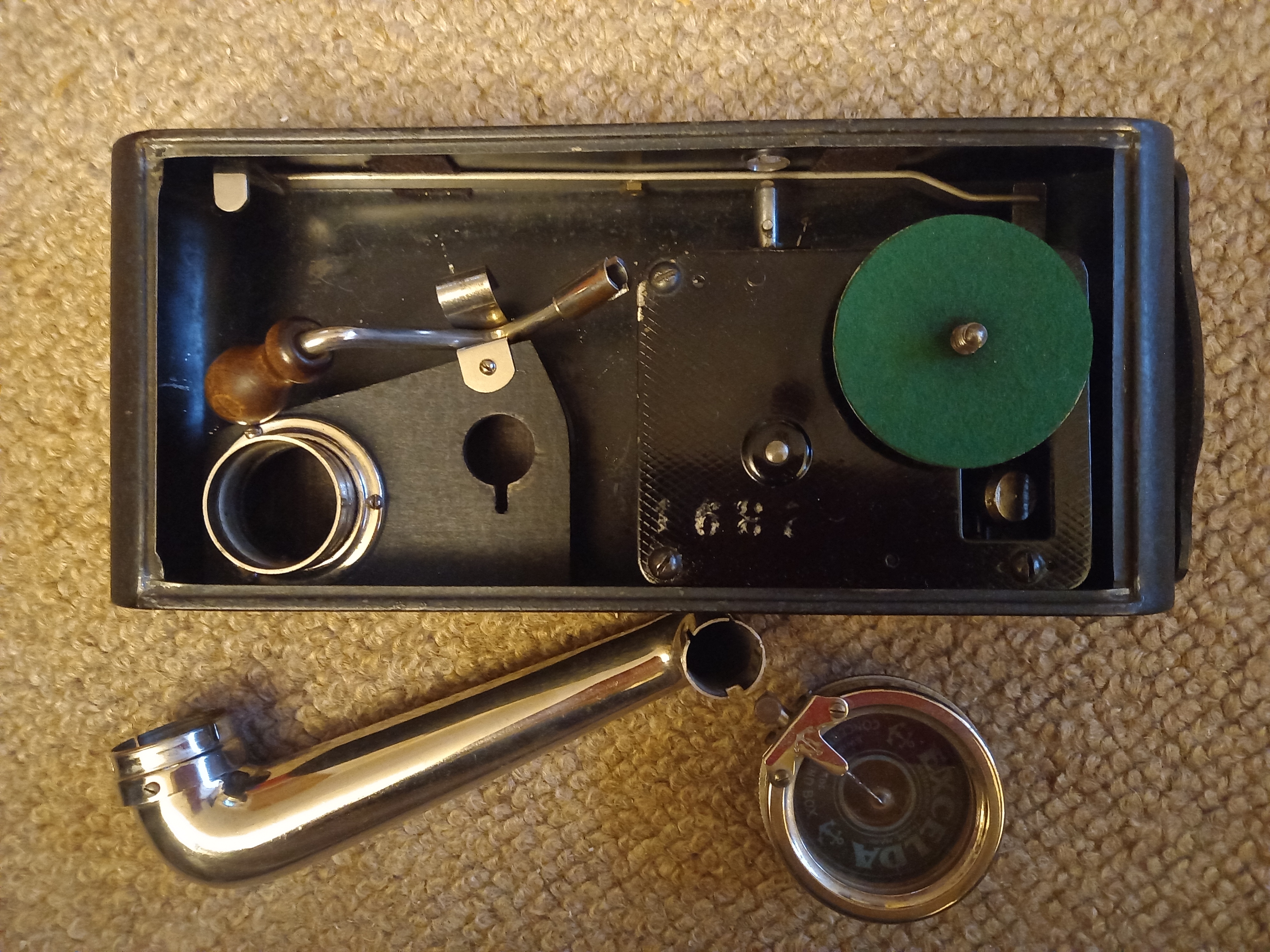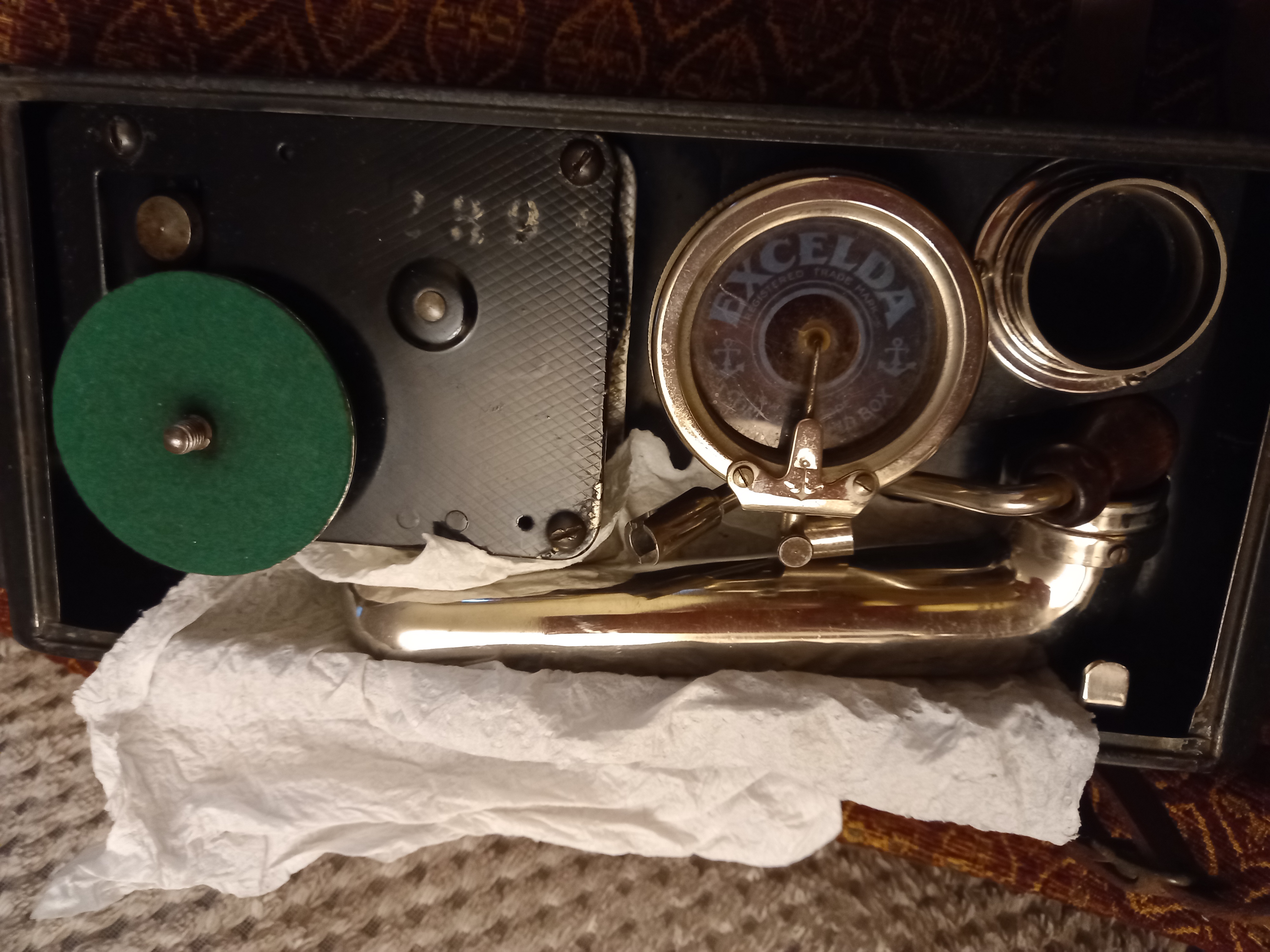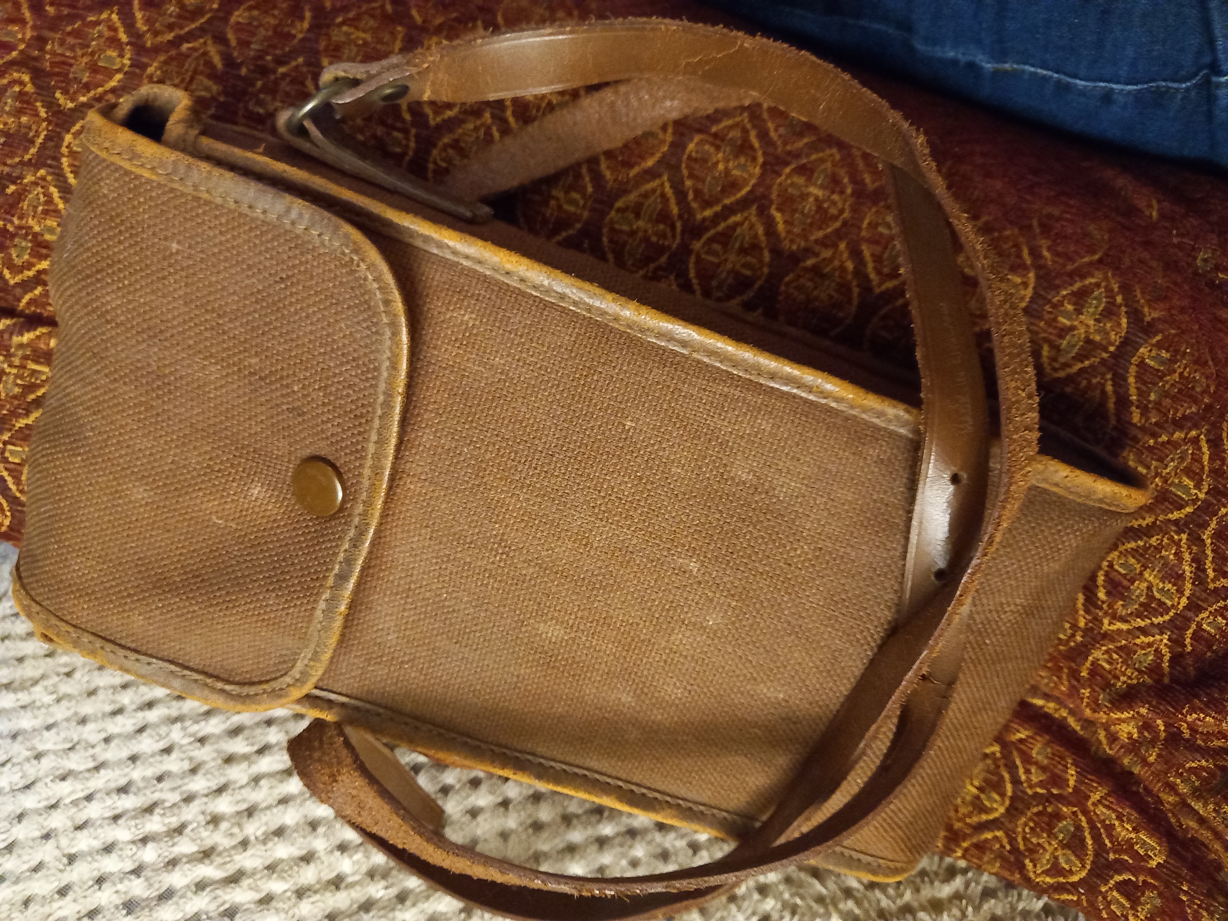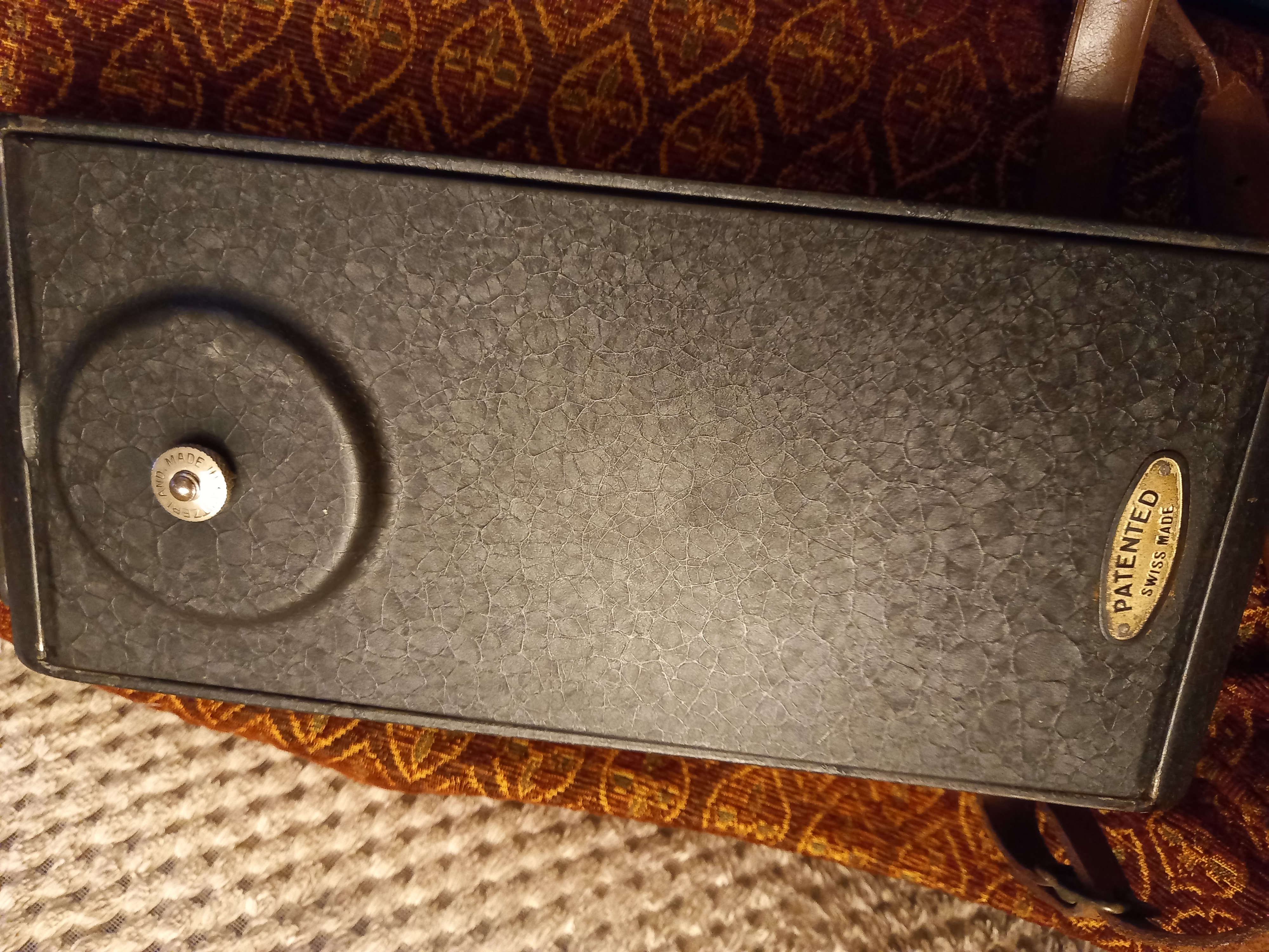 Very nice condition black case. I think this is an earlier model as it doesn't have the speed control on the side. Speed needs a little adjustment but working, lid needs a little attention to fit in flush. With canvas bag and strap.