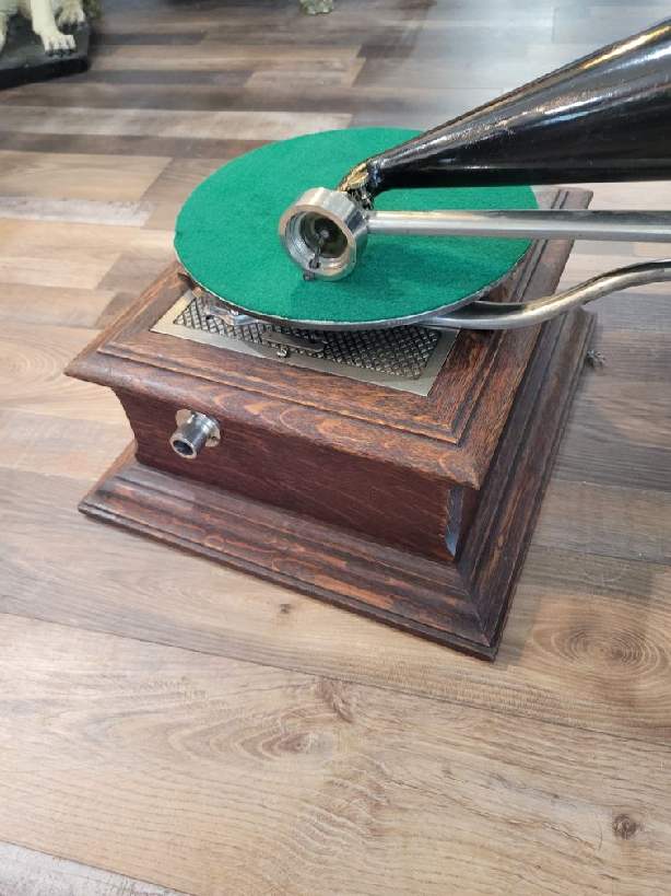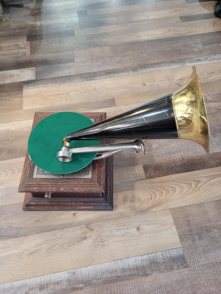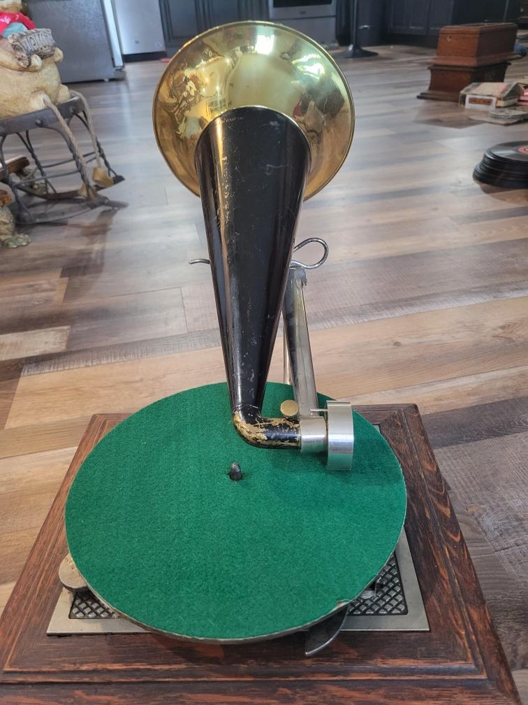 Here is a Zonophone Grand front mount. This a common machine to find in a rear mount but, you do not see the front mounts that often. They would drill the rear of the case and put a rear mount bracket on it. As you can see this one has never been drilled. The horn is a black and brass and near perfect. The arms are original, and the reproducer is an exact copy of the original. This machine does not have a cran but, they are available on ebay for 75.00. The bottom arm hold down screw is not the correct one. Price is 1300.00 shipped. It's worth more than that for parts!! If some one is interested in parts of this let me know. Payment through paypal friends and family. First to post SOLD gets it. NOTE: HORN IS SOLD. Case ,motor, reproducer and arms left 700.00