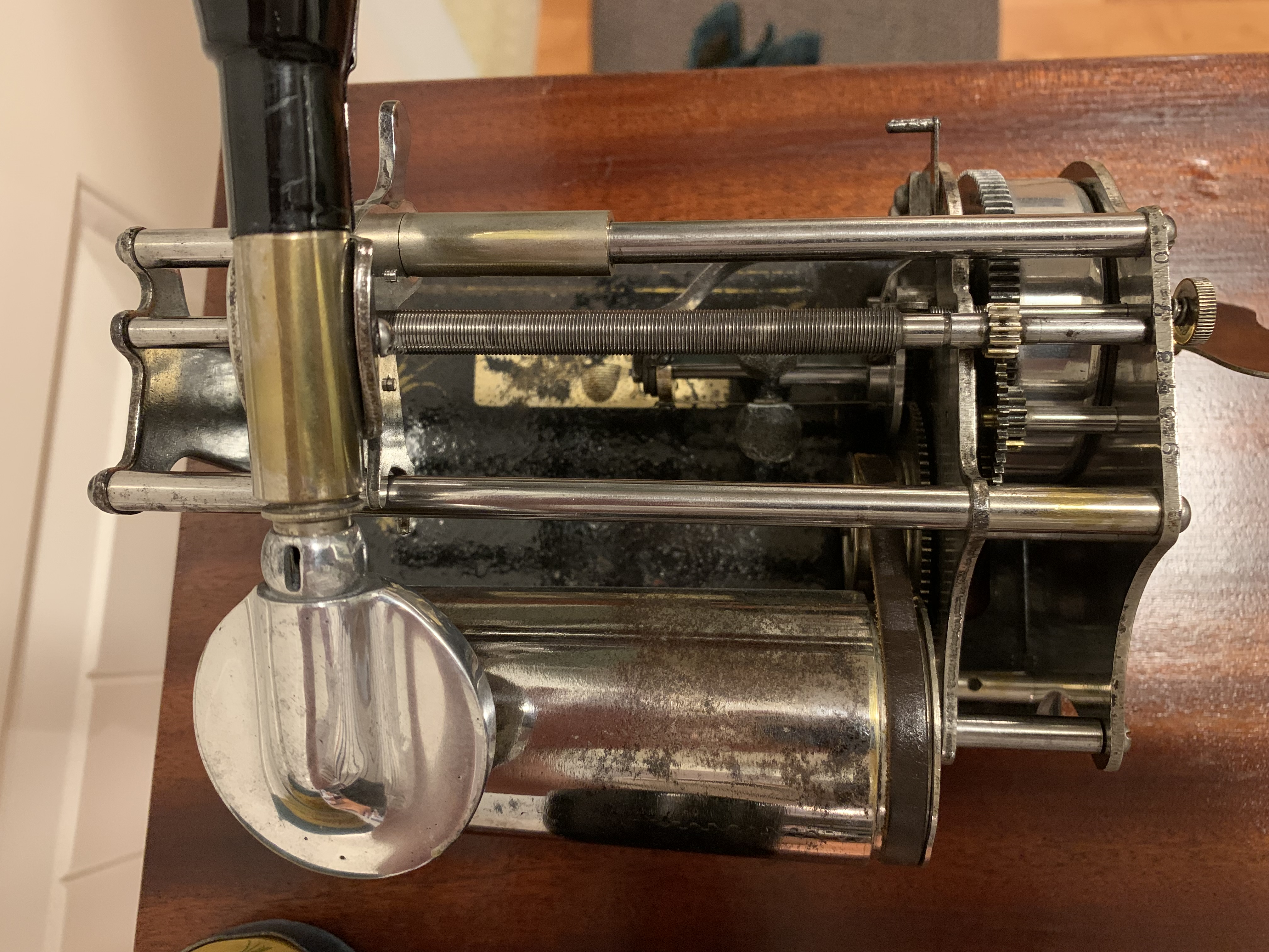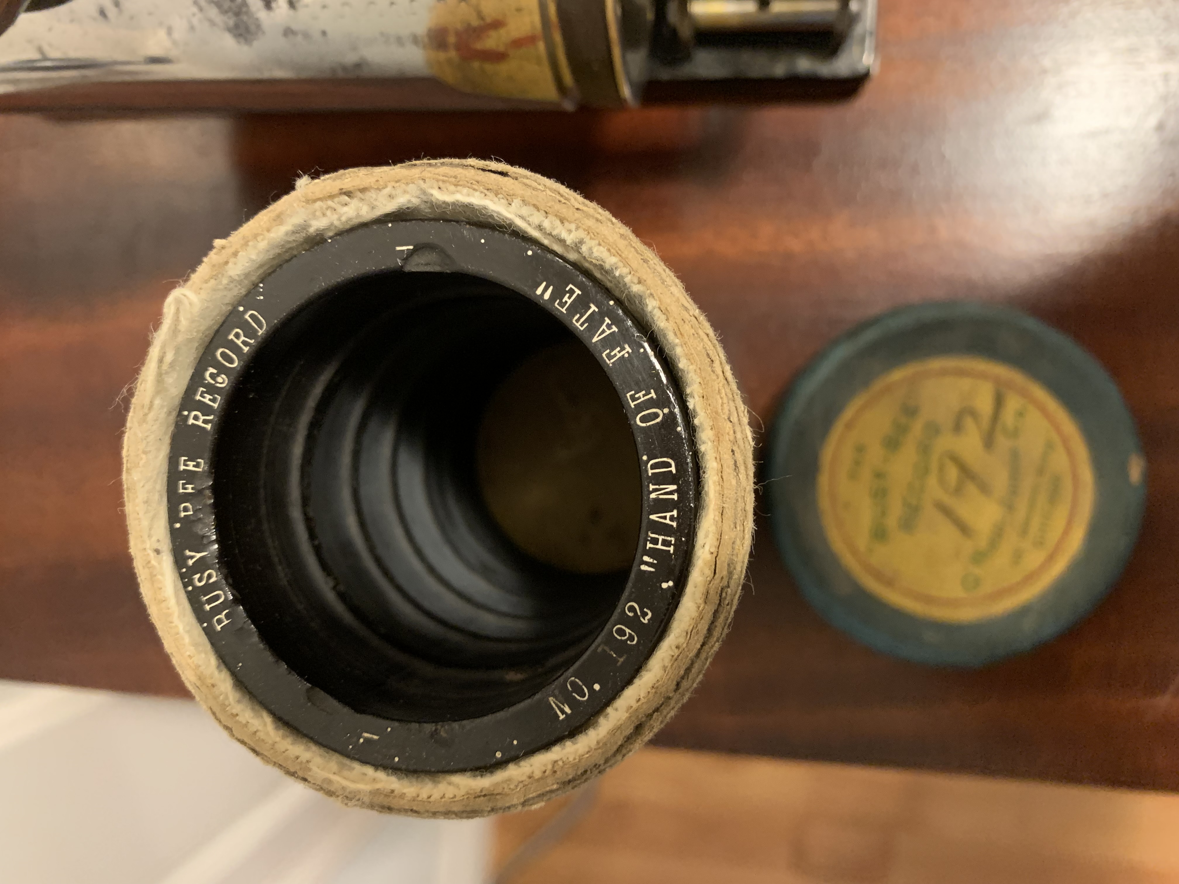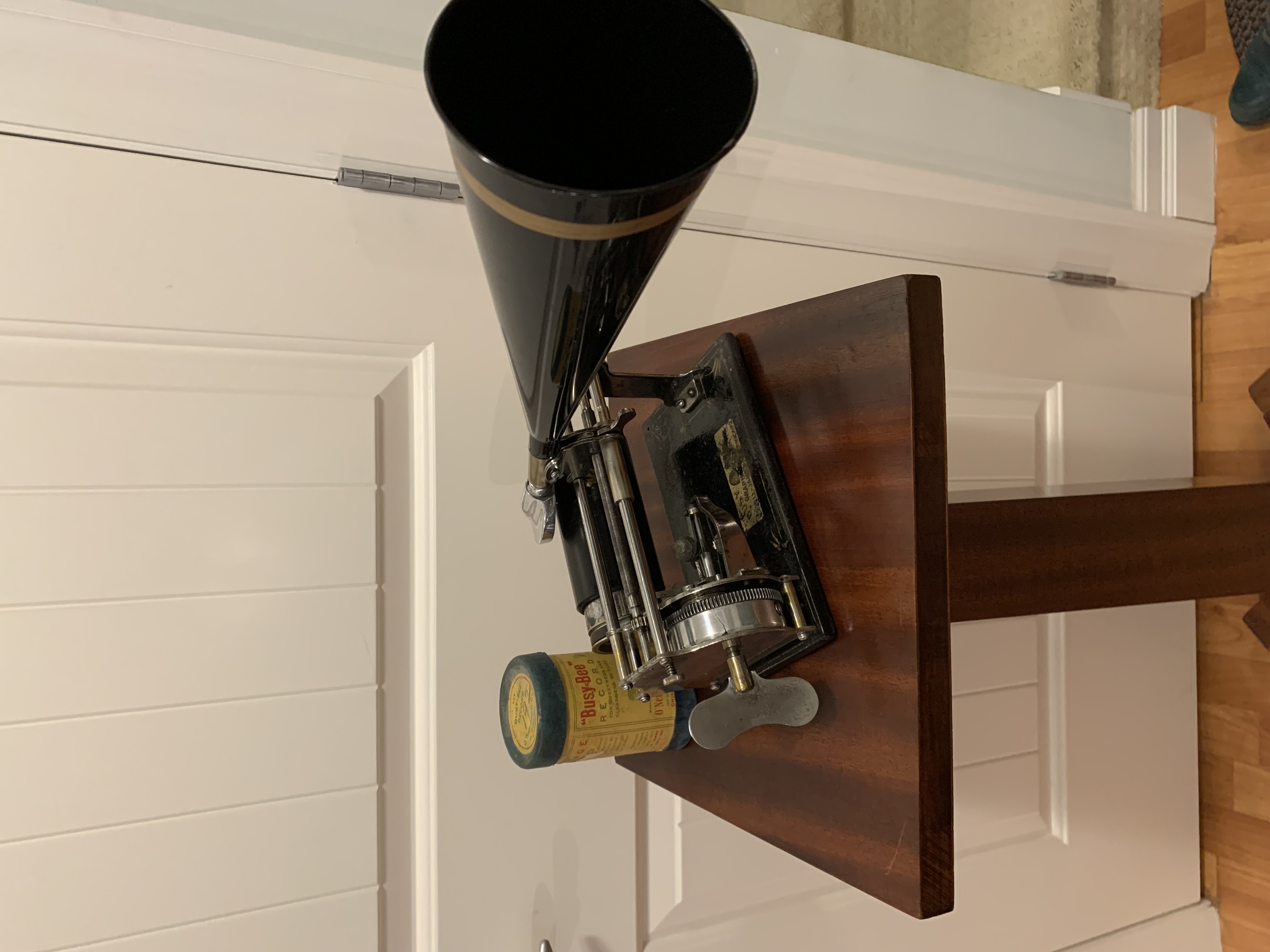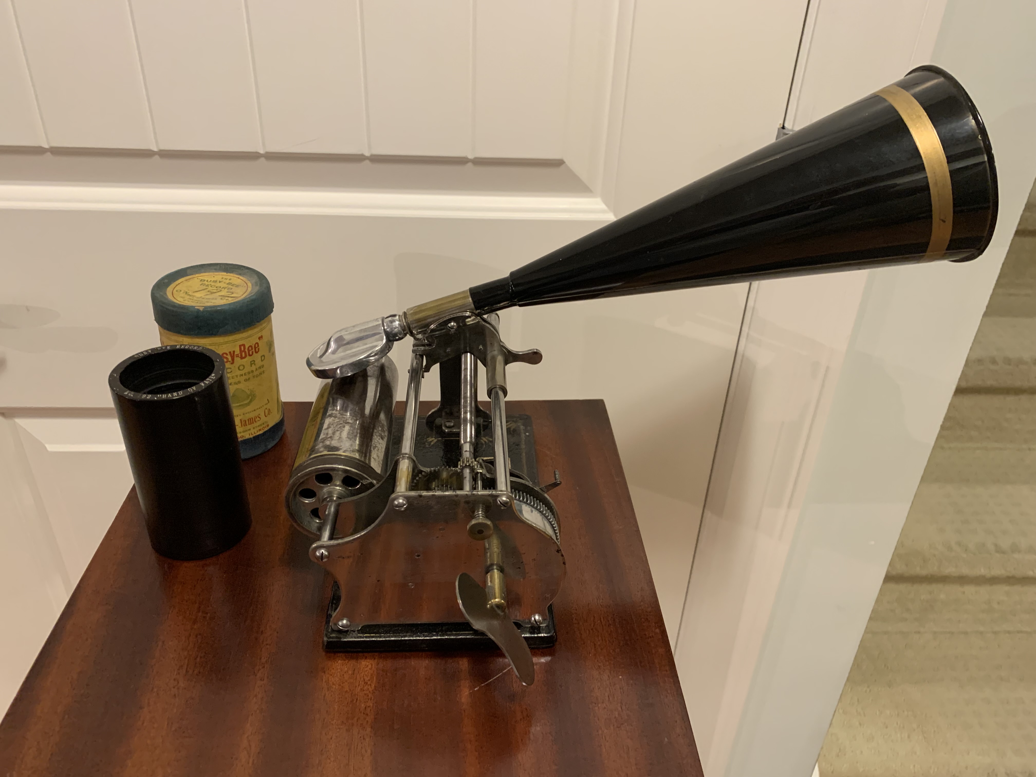 For sale a fully serviced Busy Bee cylinder player with an excellent spring and reproducer, reproduction horn and a Busy Bee cylinder in it's original box.