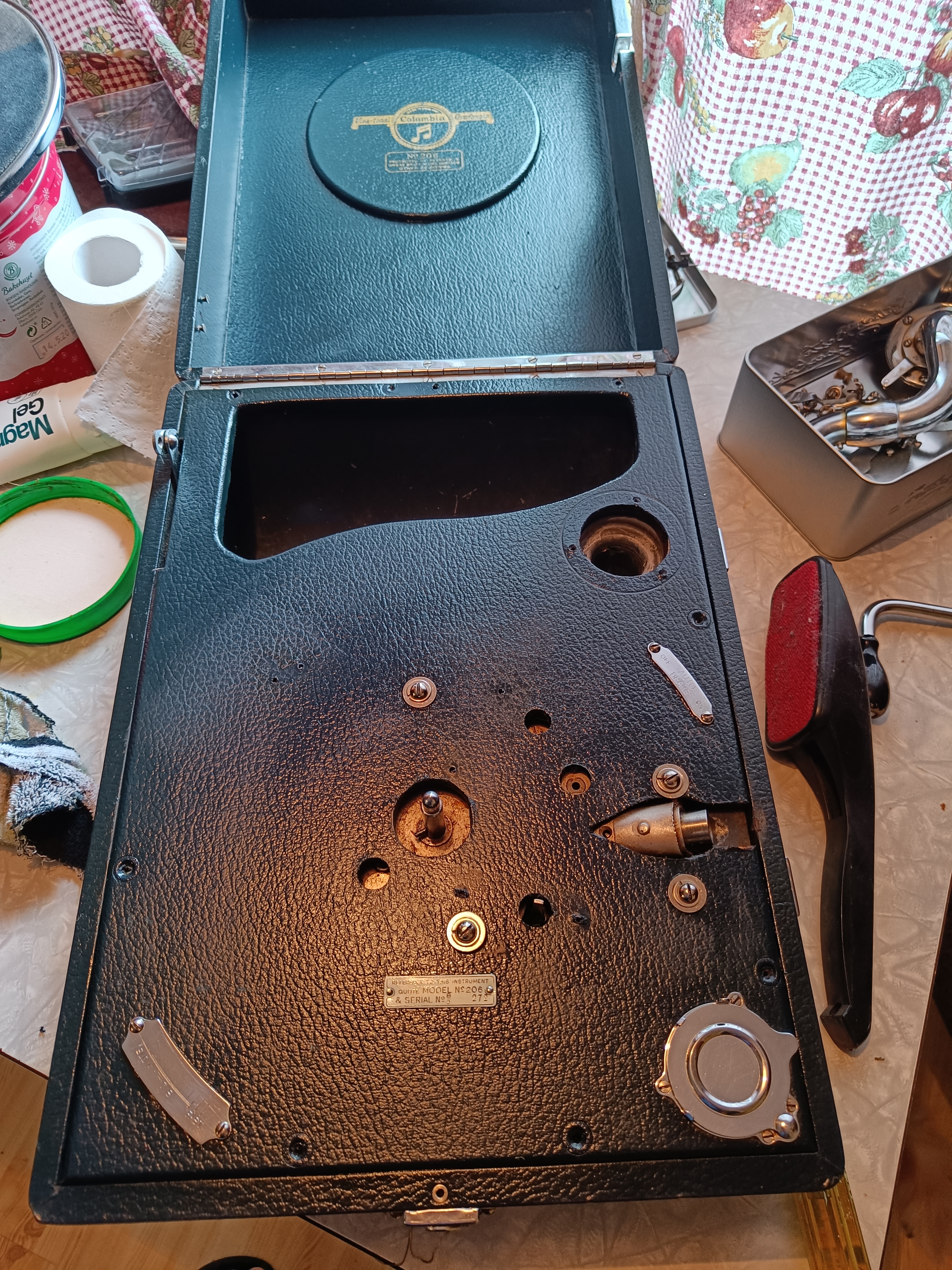 I visited a fabric shop today, and they actually will in mid August get some velour ( not velvet) fabric that is very very close to the original, with the same vowen structure. I asked a female expert in the shop, and she told me the fabric is velour..and not velvet. I will get some of this fabric, and arrange for both a donor turntable, and a record tray, since I also got some of those lying around here. I will post some photos when I have it ready. For those who are curious about what motor is found inside the Columbia 206, it is a HMV 270 D motor.