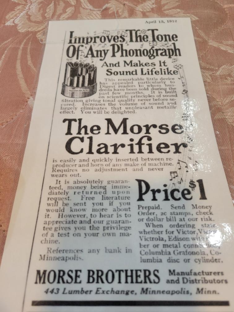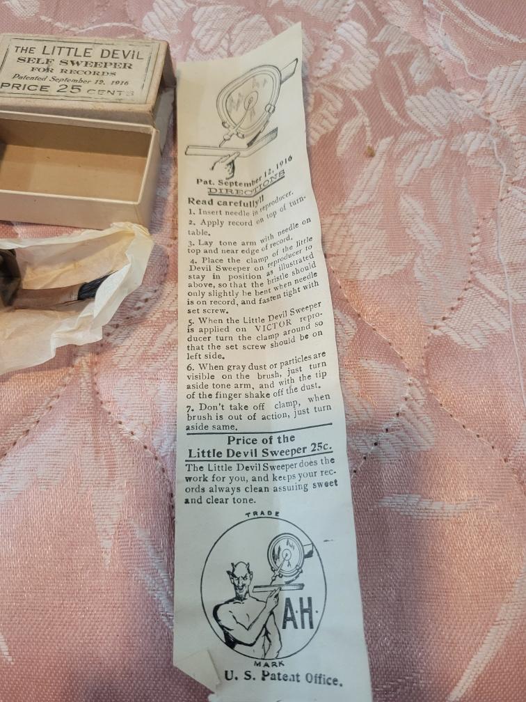 Here are 3 items that i am selling today. The first being a Little Devil attachment for a Victor reproducer to sweep the record before the needle reaches the groove. It is in the original packaging with the original instructions and the original packing. The price is 125.00+ 10 shipping. The second is a Morse Clarifier with a reprint of the original ad for it. I believe it goes in the U-tube on a Victor machine to enhance the sound???? 125.00 + 10.00 shipping The third item is a Santa record duster in very good shape with an address, but I do not see a town or city. 125.00 + 10.00 shipping. The first to post sold gets the item. Payment through paypal F&F. Tom
