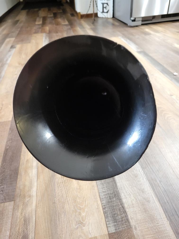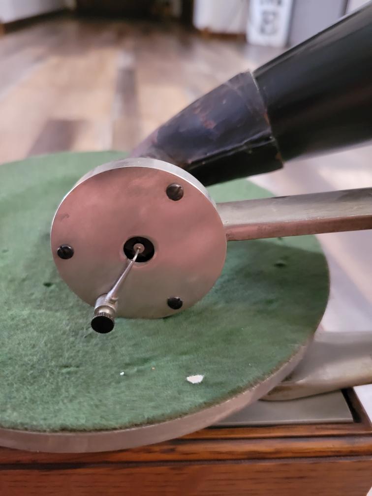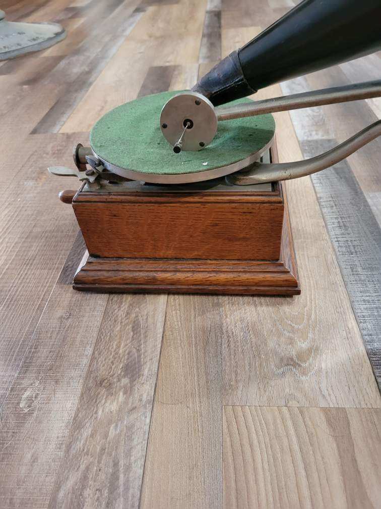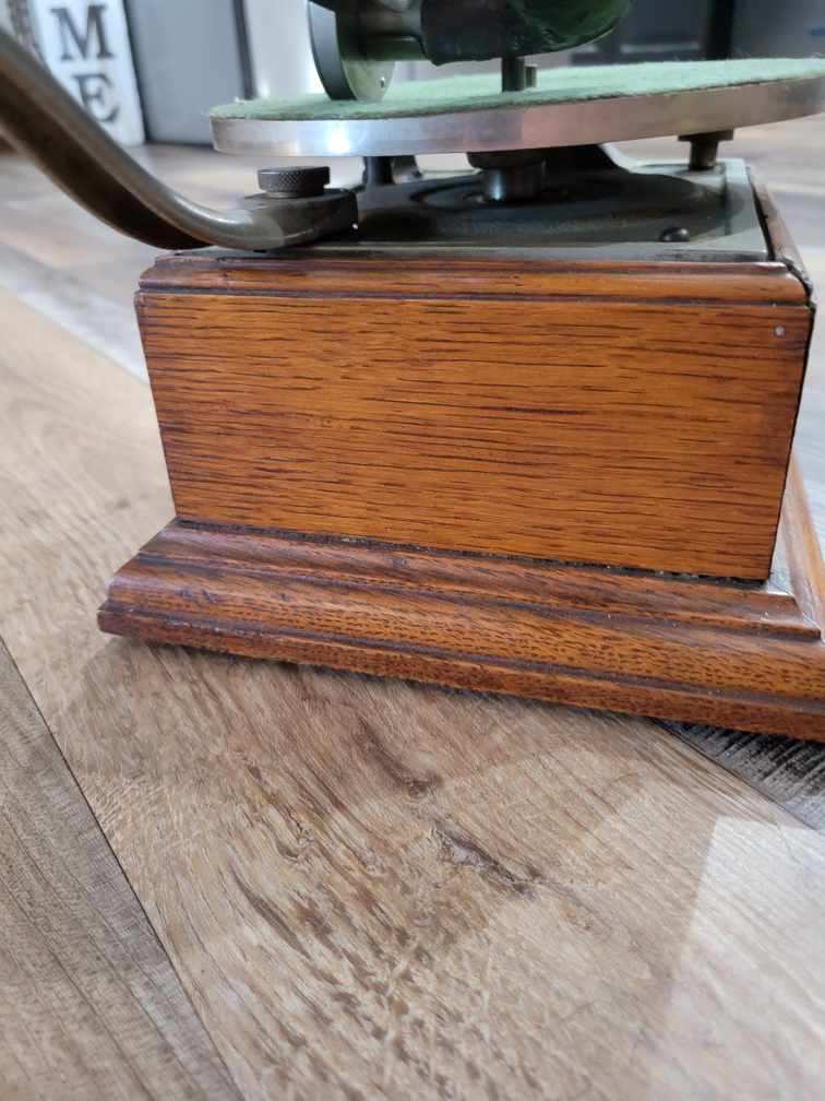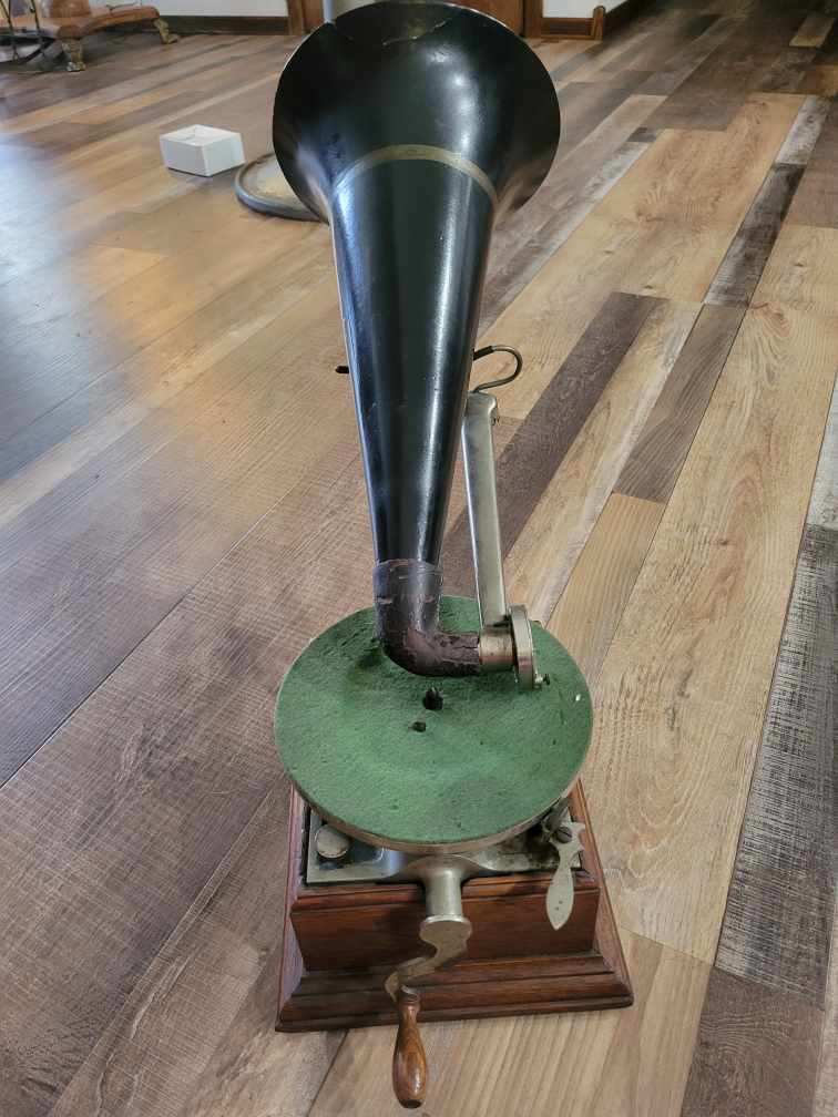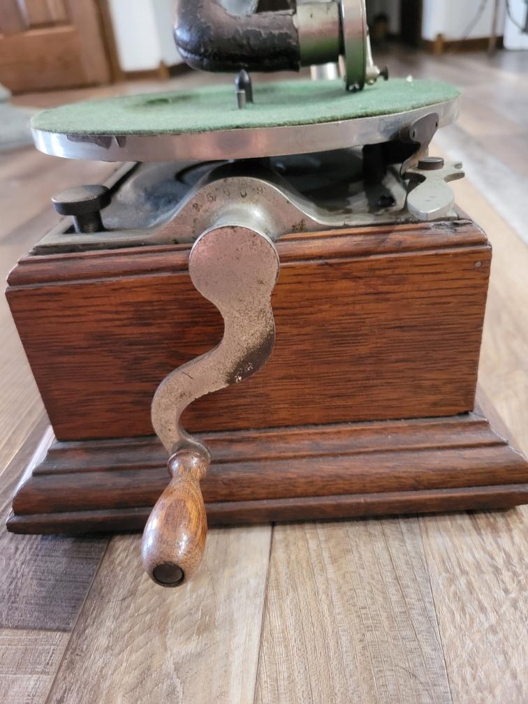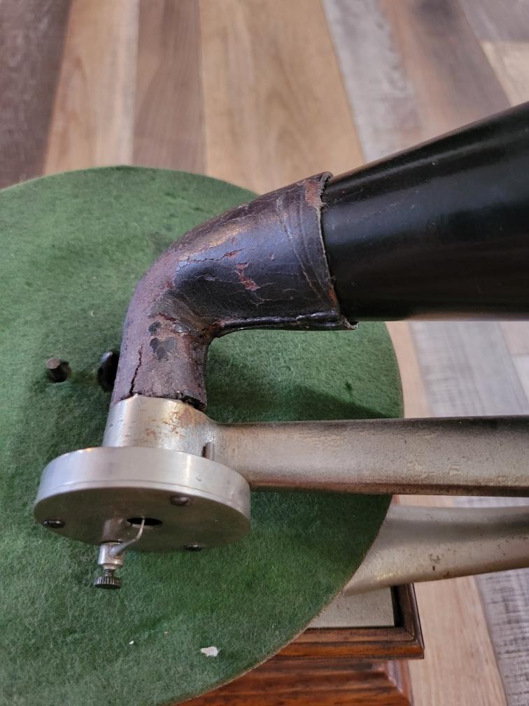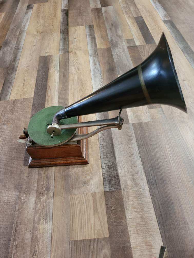 Here is a kind of rare Zonophone model D with an aftermarket Linene fibre horn. The horn is in actually nice shape for the material it is made of and its age. There is a hairline crack on the bell of the horn and a small piece missing where the elbow goes. The elbow covers the bad spot so that is not even noticeable. It has a correct closed face reproducer and correct crank. The felt on the turntable looks to be original. Oh, yea the arms are original too. There is NO celluloid tag on this machine and no sign that there ever was. I am told that this is correct. 3800.00 + 75.00 shipping. Find another Zonophone D with this horn for that price! Payment through paypal F&F. First to post SOLD gets it. I have tried to picture all angles. I have Just listed this on ebay for 3800.00+75.00 shipping. So, I would only get like 3500.00. So, the new price is 3500.00 + 75.00 shipping