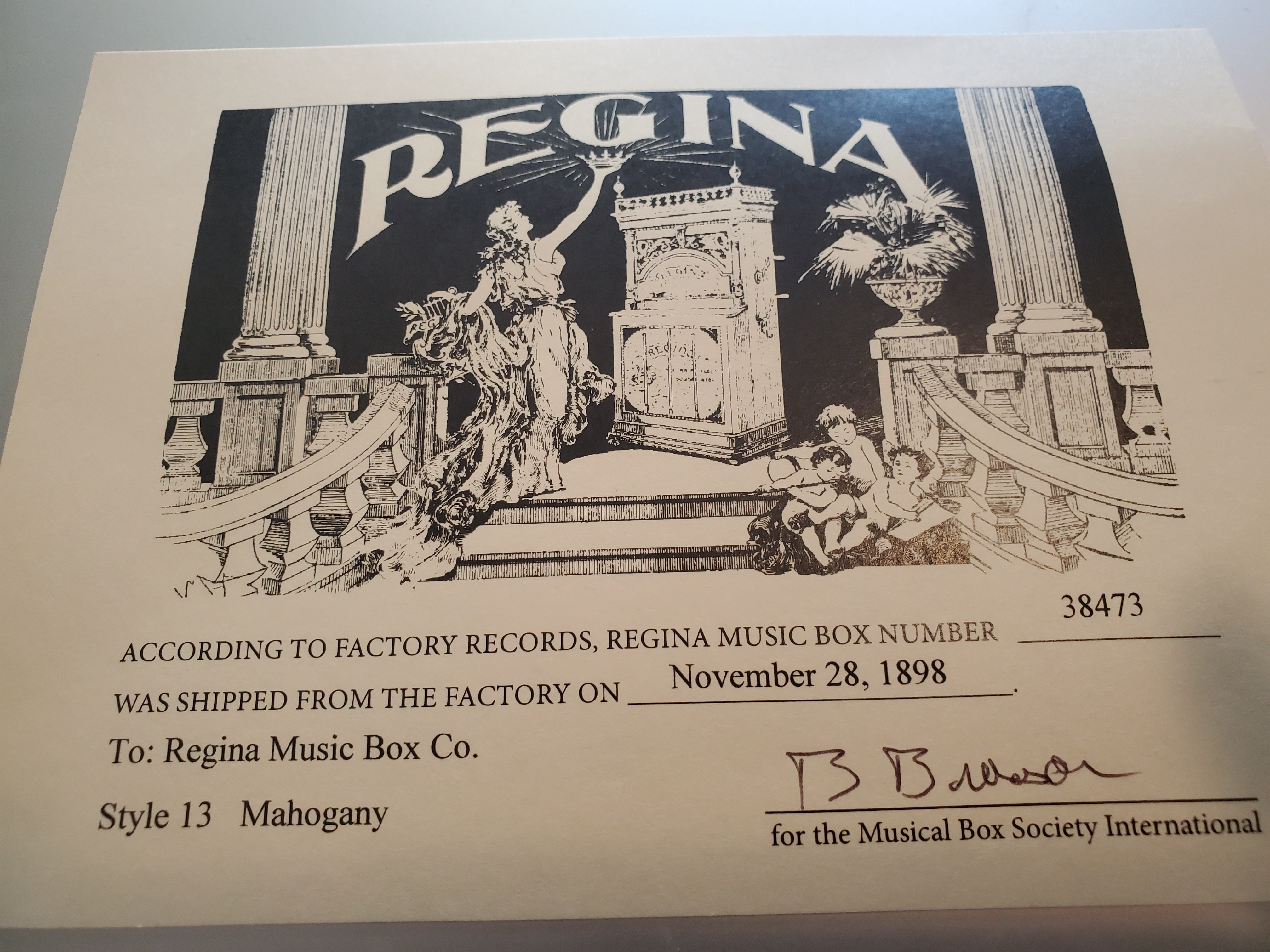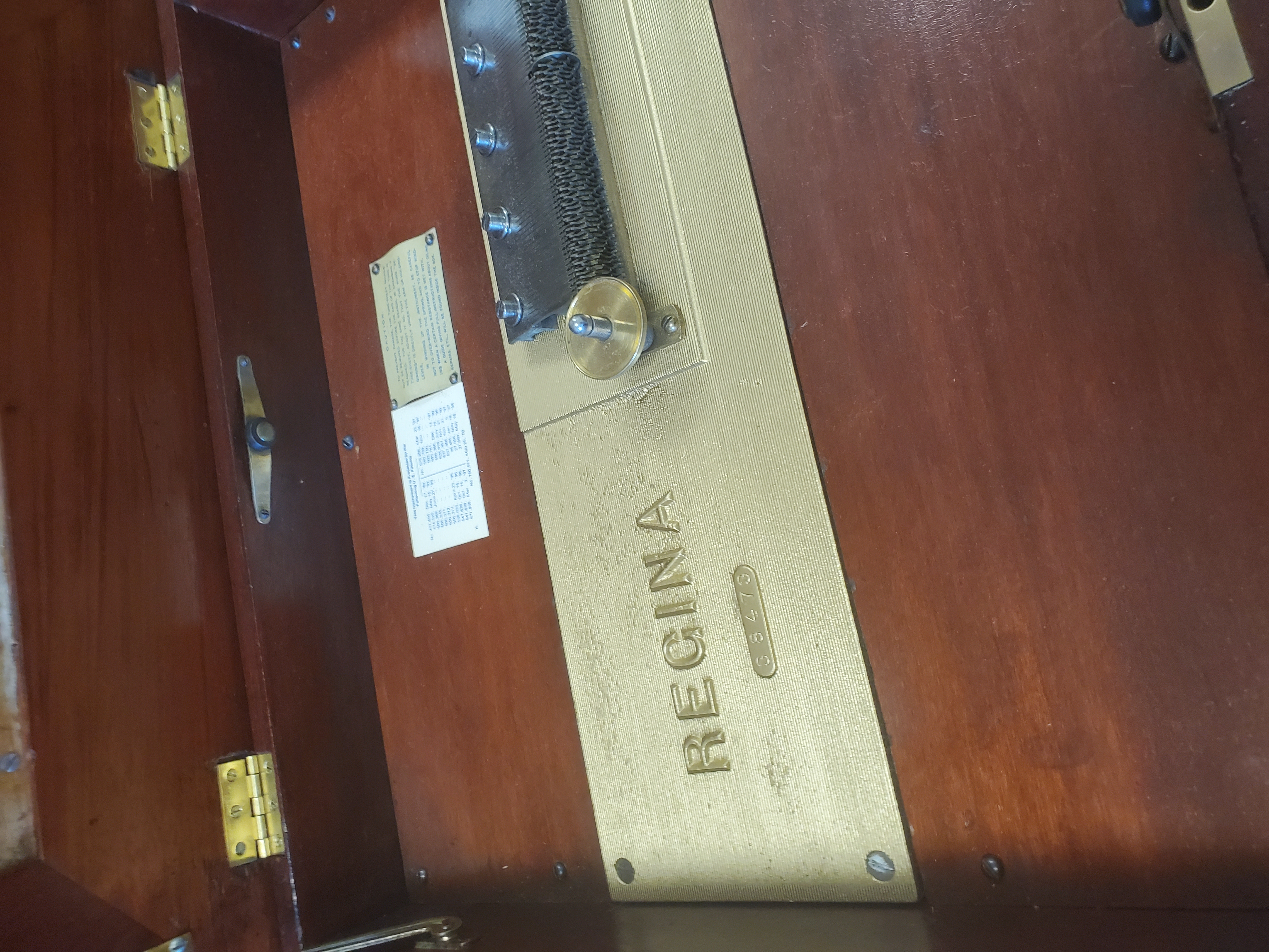 Perhaps slightly off topic, but still mechanical music, and I figure like me, there would be some overlap in interest. I have always wanted a Regina, and managed to pick one up at a reasonable price at a local auction. Besides the fact that it's a single comb Regina, that plays 15.5 inch disks I know nothing about these guys. Any good sources for info or reference material out there? Is there a way to date the machines? Thanks all.