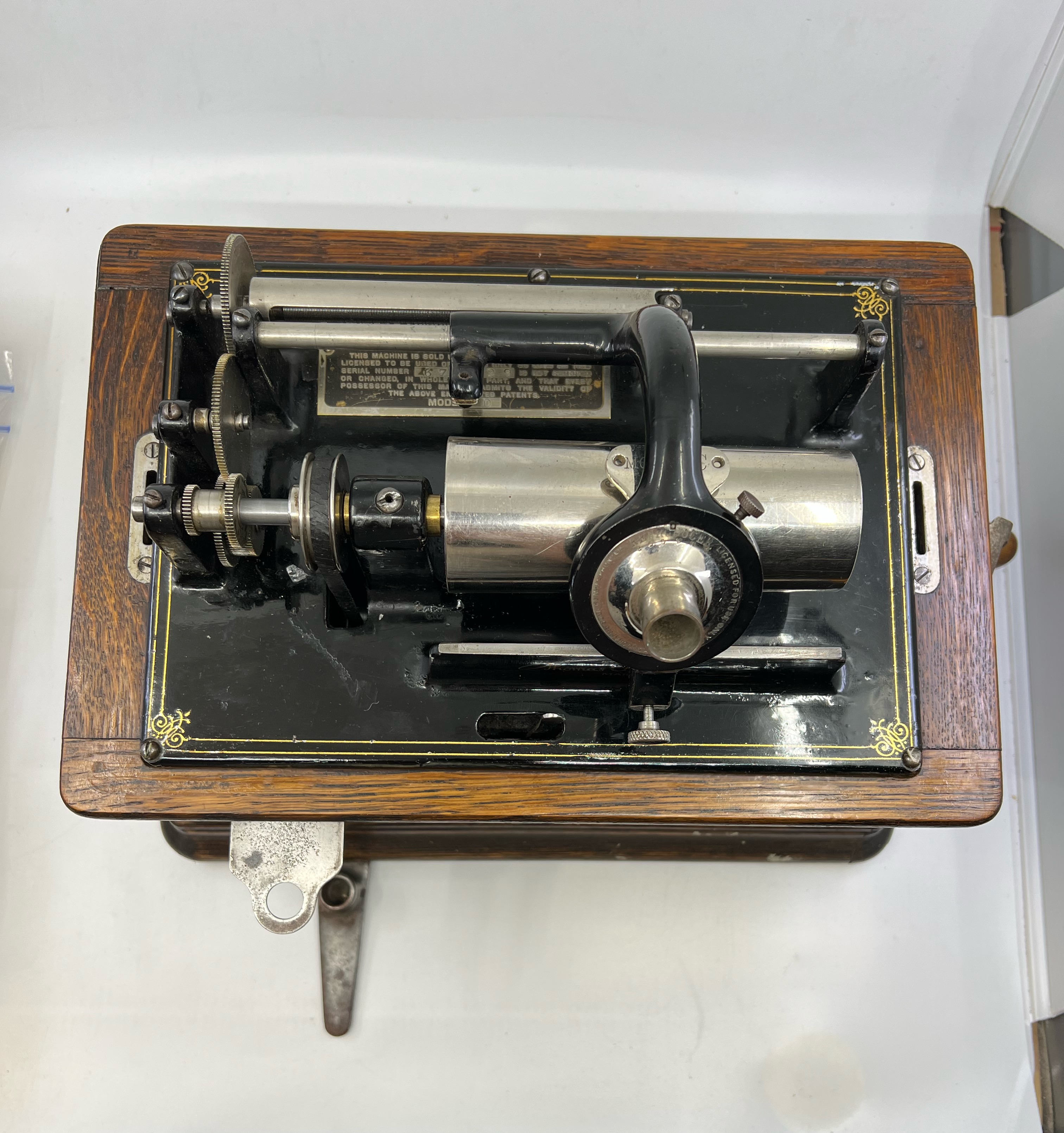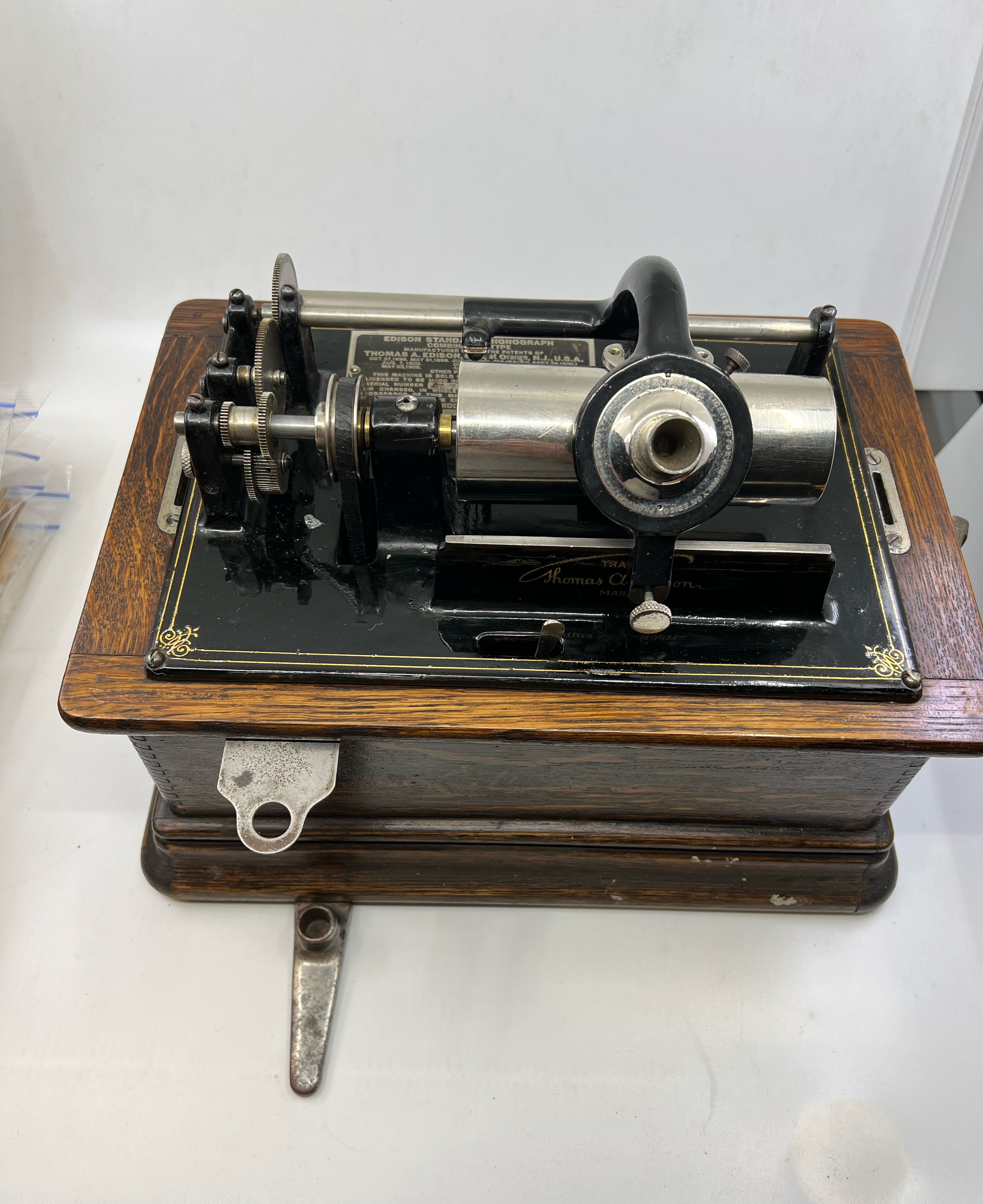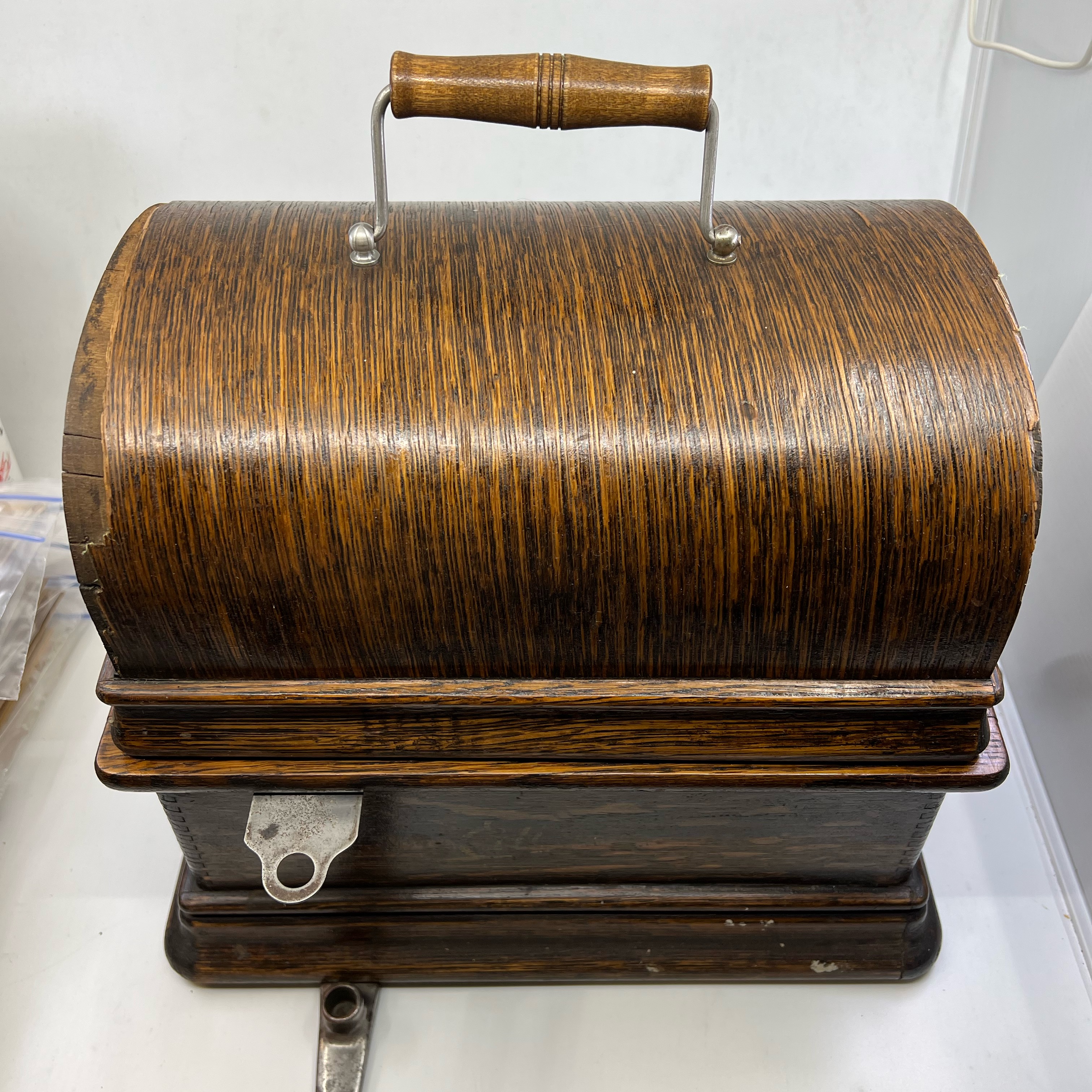 I will be bringing this Edison Standard Model-D combination 2&4 minute machine with a Model-C reproducer to the Wayne Show. The price is $395. The lid has veneer loss on corner and machine needs a gear cover.