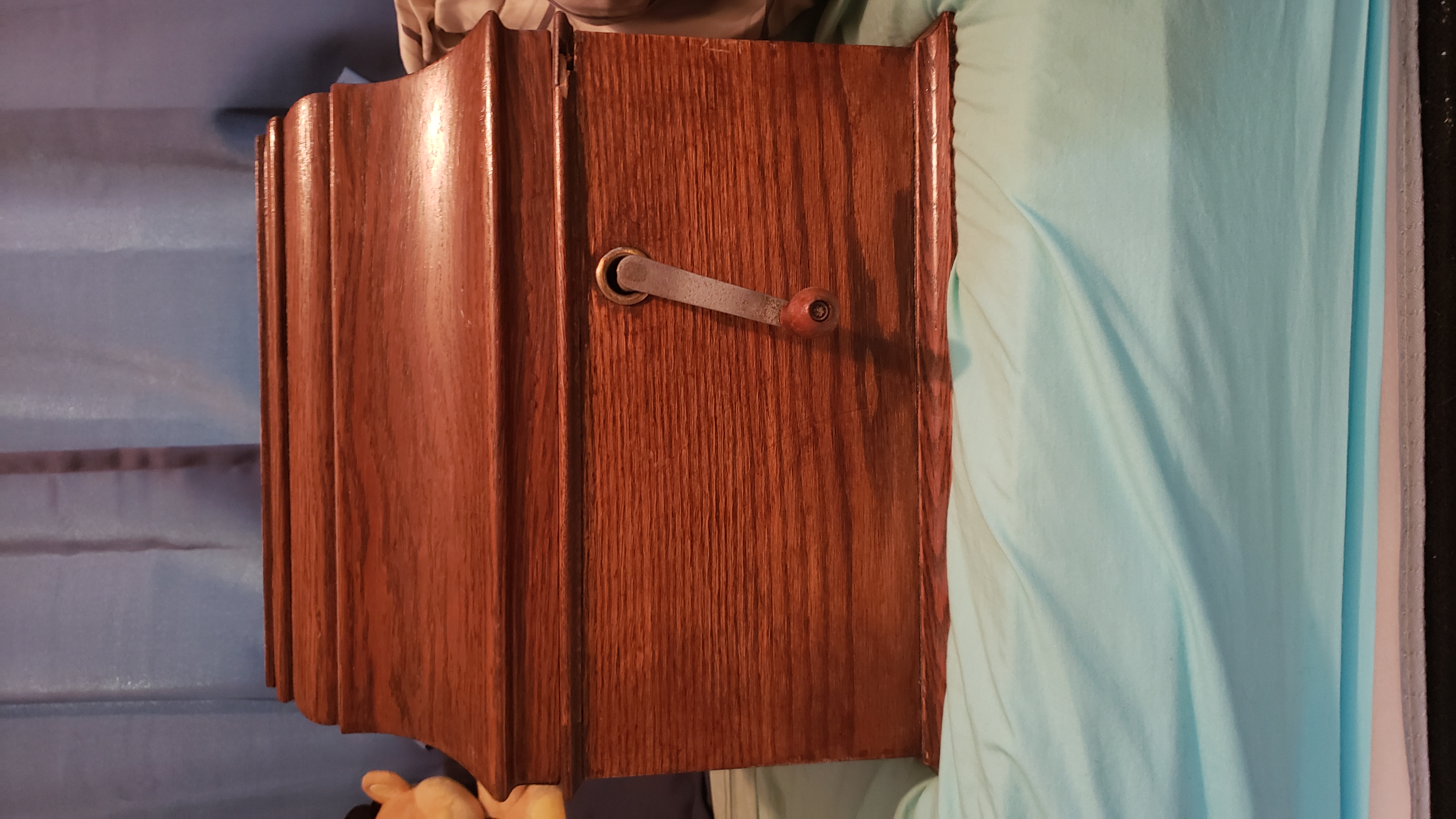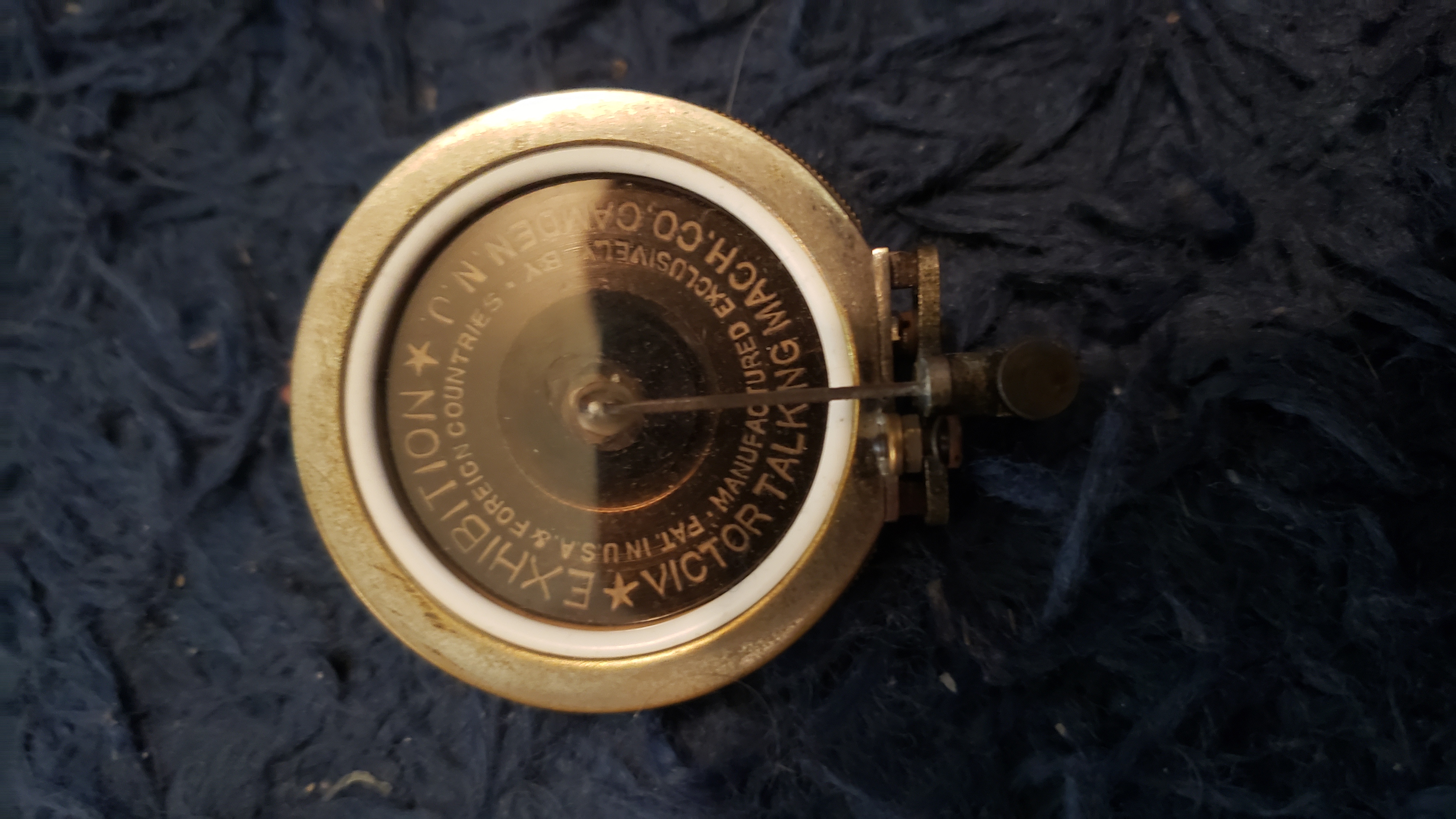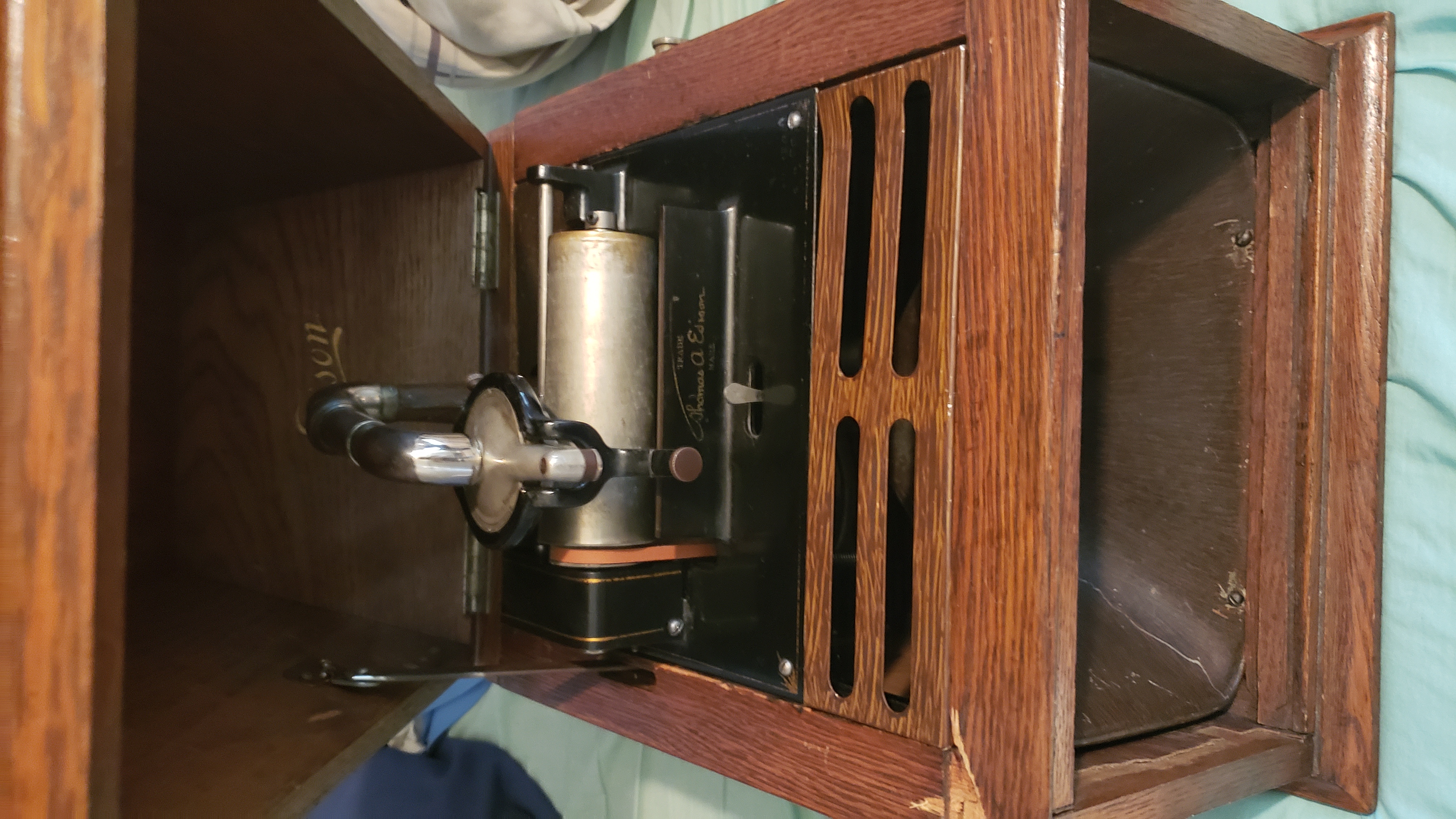 I am going to have to part with my Amberola DX due to space reasons, so I'm going to bring it with me to the show. The machine is fully functional with a smoothly running motor and a good diamond in the reproducer. It has the original faux wood grain top grill and back grill, and the horn paint is also original and untouched. Few scratches and chips on the horn. No original front grill with it. The leather belt has been replaced with a new Wyatt Markus belt. The back wooden plank and the left side plank had to be glued back onto the rest of the cabinet, so there are chunks missing. The most noticeable one is in the front under the lid. I am negotiable on price, since I really do need to clear this out.