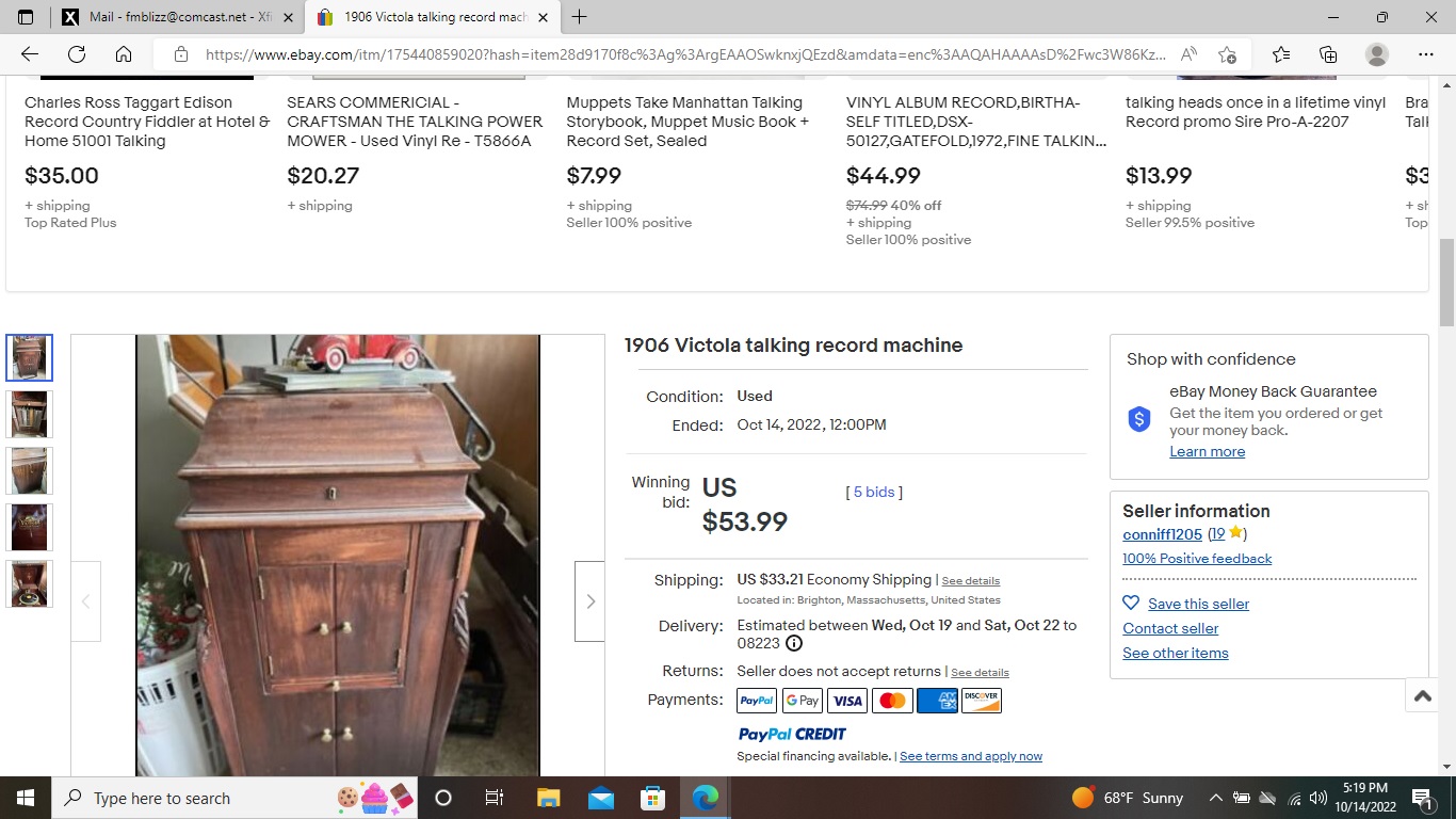 All that said, I am afraid to state that I truly think this is the current state of the "market." The last two Victrolas I purchased were $27.50 and $35.00. I have inquired about a few machines for sale at various online venues and some sellers have told me that I was the first serious inquiry they have corresponded with. I am not trying to "open a whole can of worms" with my commentary, just simply stating that prices for common machines are way down - especially in my part of the country.