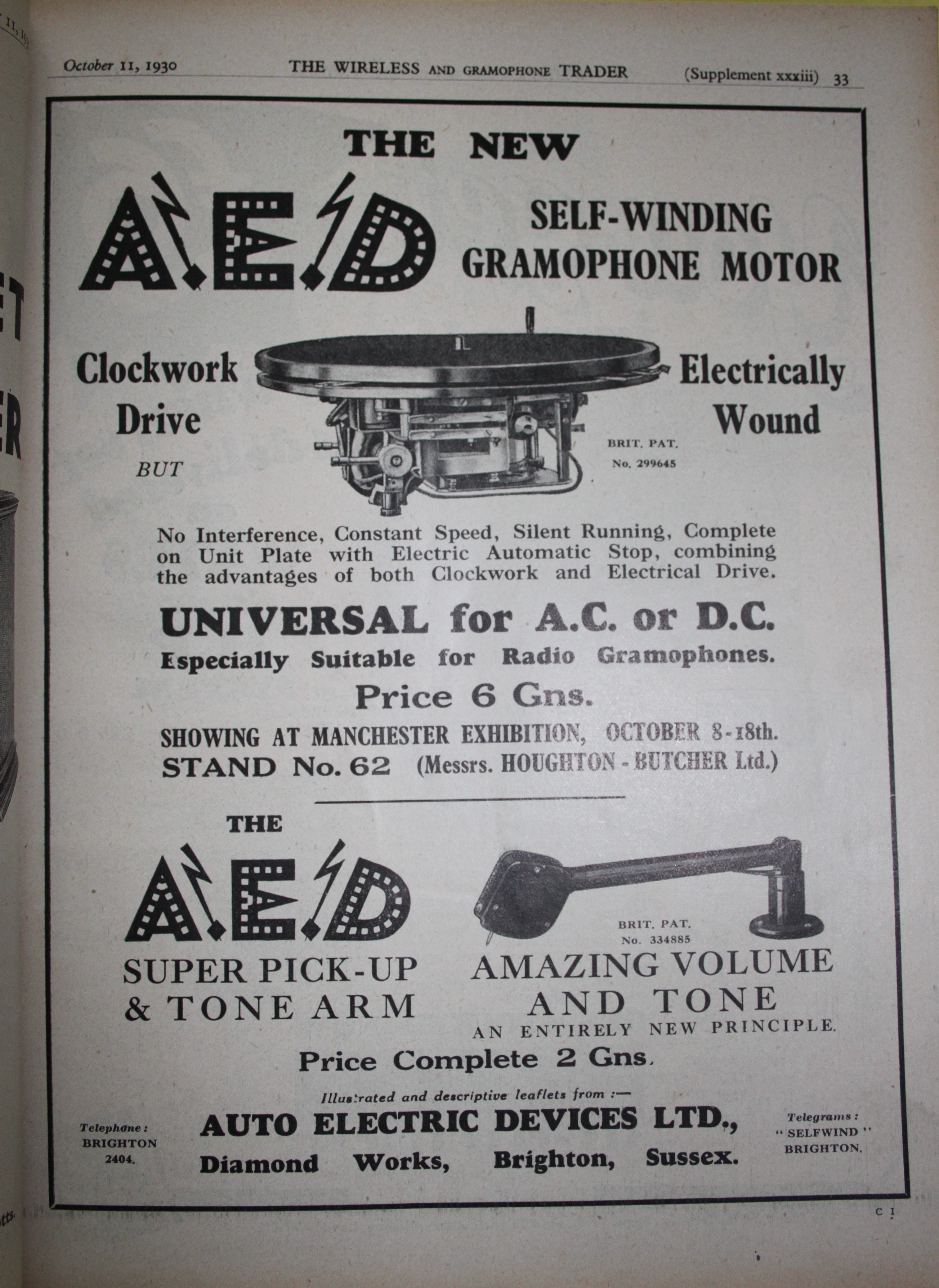 Several years ago there was a thread on the forum about whether a "self winding Gramophone" could ever exist. I am pleased to report that it did ! at least according to this 1930 advert from Auto Electric Devices of Brighton..... It seems an electric motor wound the spring of the gramophone which then powered it whilst playing - totally pointless. Wallace and Gromit would have been proud of this one !