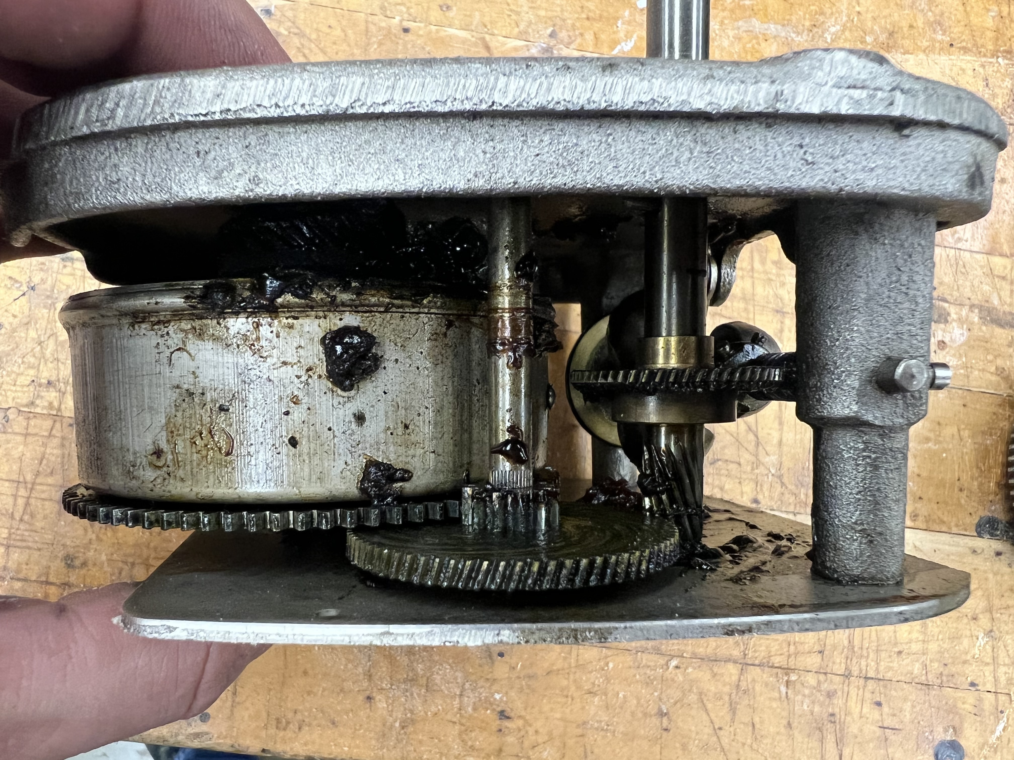 A previous repairman did not install the old spring properly, and the rivet holding the end of the spring has been pushed outward, making a bulge in the barrel. There's also some minor damage to one of the gear teeth, but this doesn't see to cause any issues when the barrel is put in the machine and rotated. The lid is dented slightly, and bent - easy enough to flatten (I hope).
