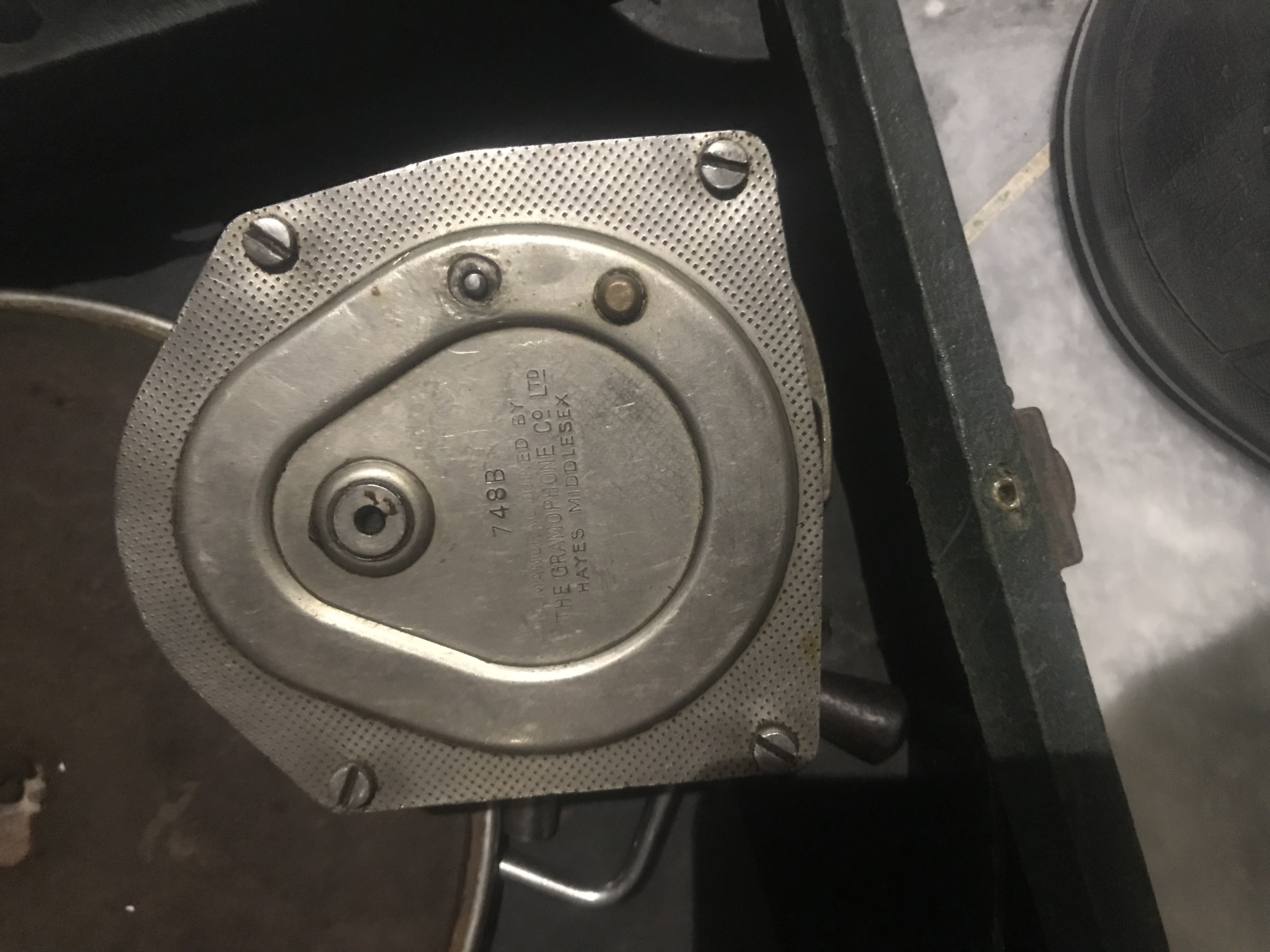 A couple of months back I bought this HMV 97 in green rexine cloth from a junk shop. It has everything inside the box and all external fittings are intact. The cloth has worn out, the fittings are rusted, the seams of internal horns have crevices, the main spring is broken and the cylinder has a crack. Unfortunately, the stay lever and soundbox are missing.