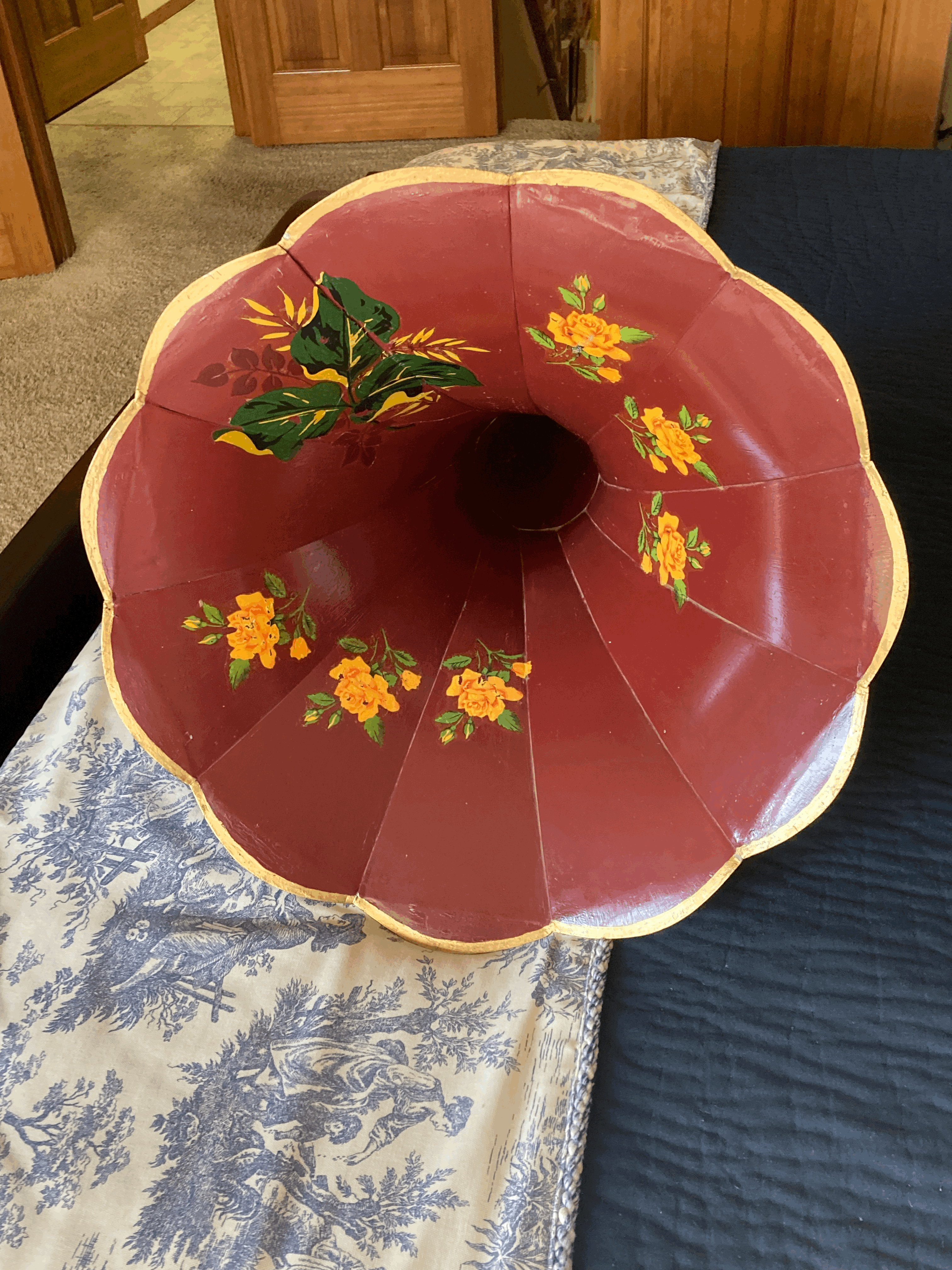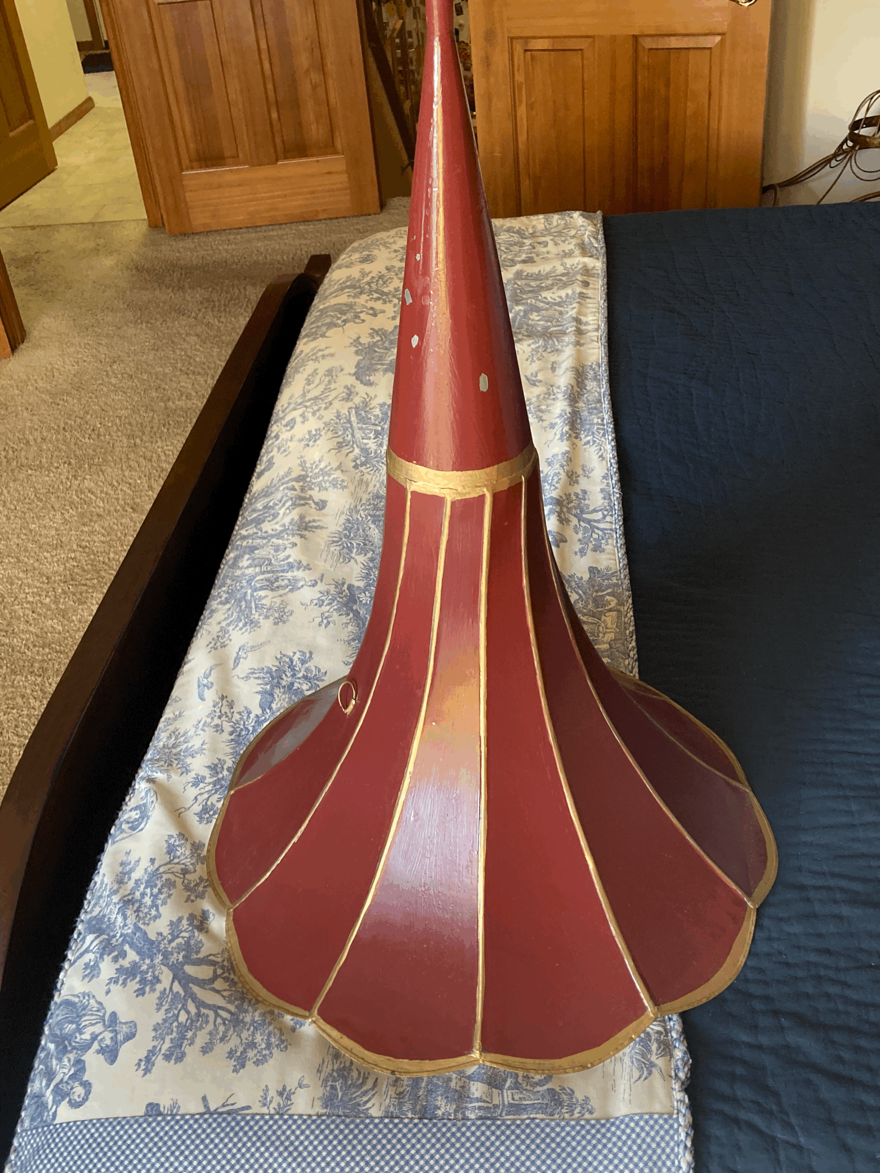 I am selling an unusual moving glory cylinder horn. Please notice the twist in the panels. Can anyone identify this horn? The horn is very straight but has had an amateur restoration and I don't have the skills to properly restore. The firm price is $200 and I'm happy to deliver the either the APS Midwest or California Expos. I imagine it is cost prohibitive to ship. Please PM any interest or questions but such a PM does not place an item on hold. The buyer is the first to PM "SOLD!