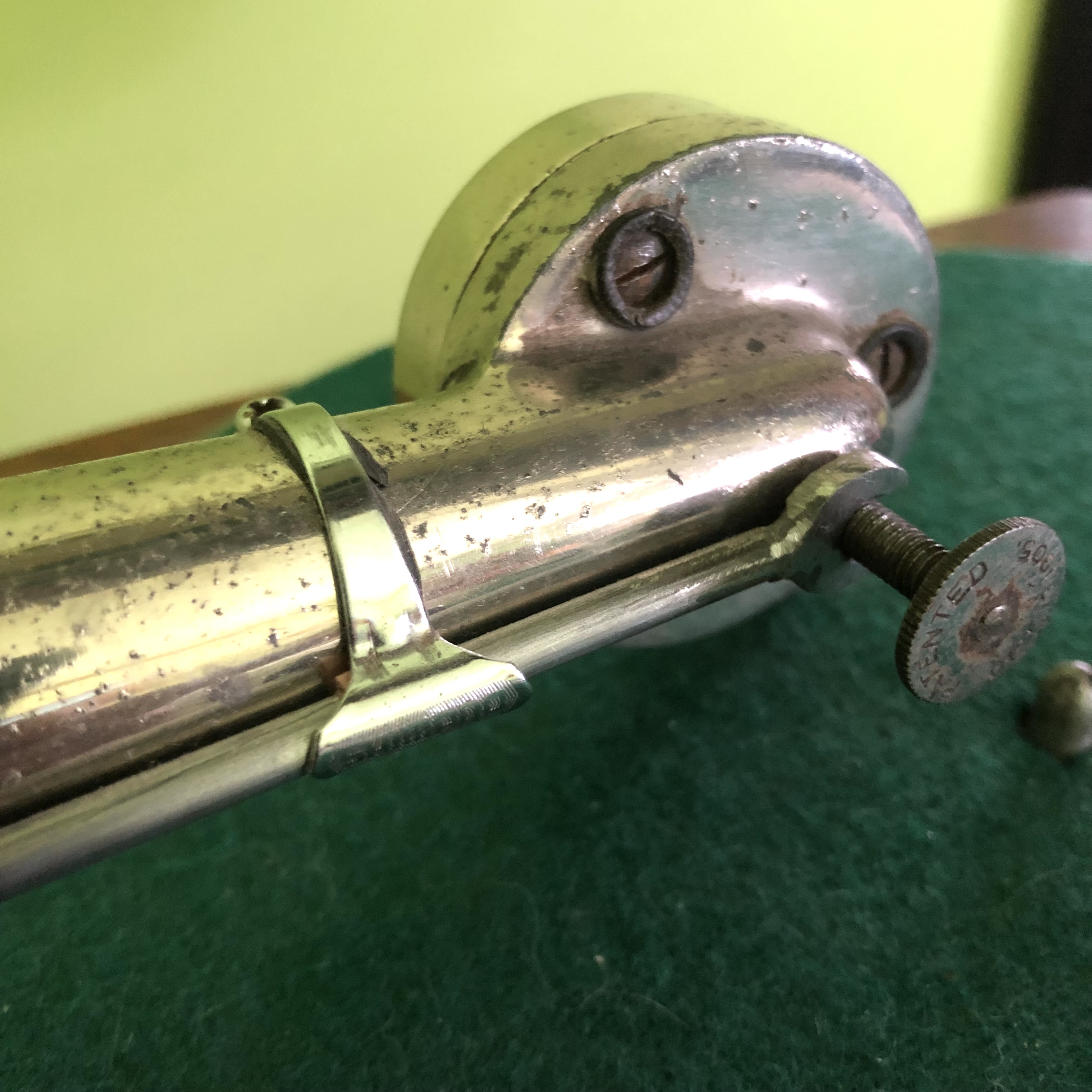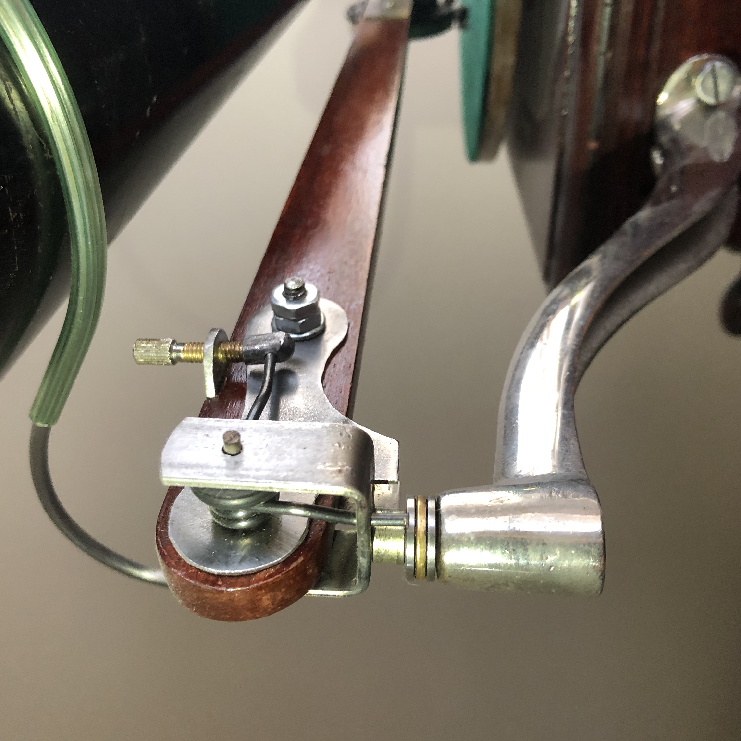 I made a mount/pivot wide enough to accommodate a spring taken from a wood clamp and added an adjuster on the top which, when screwed in/downward reduces the weight of the needle on the record.