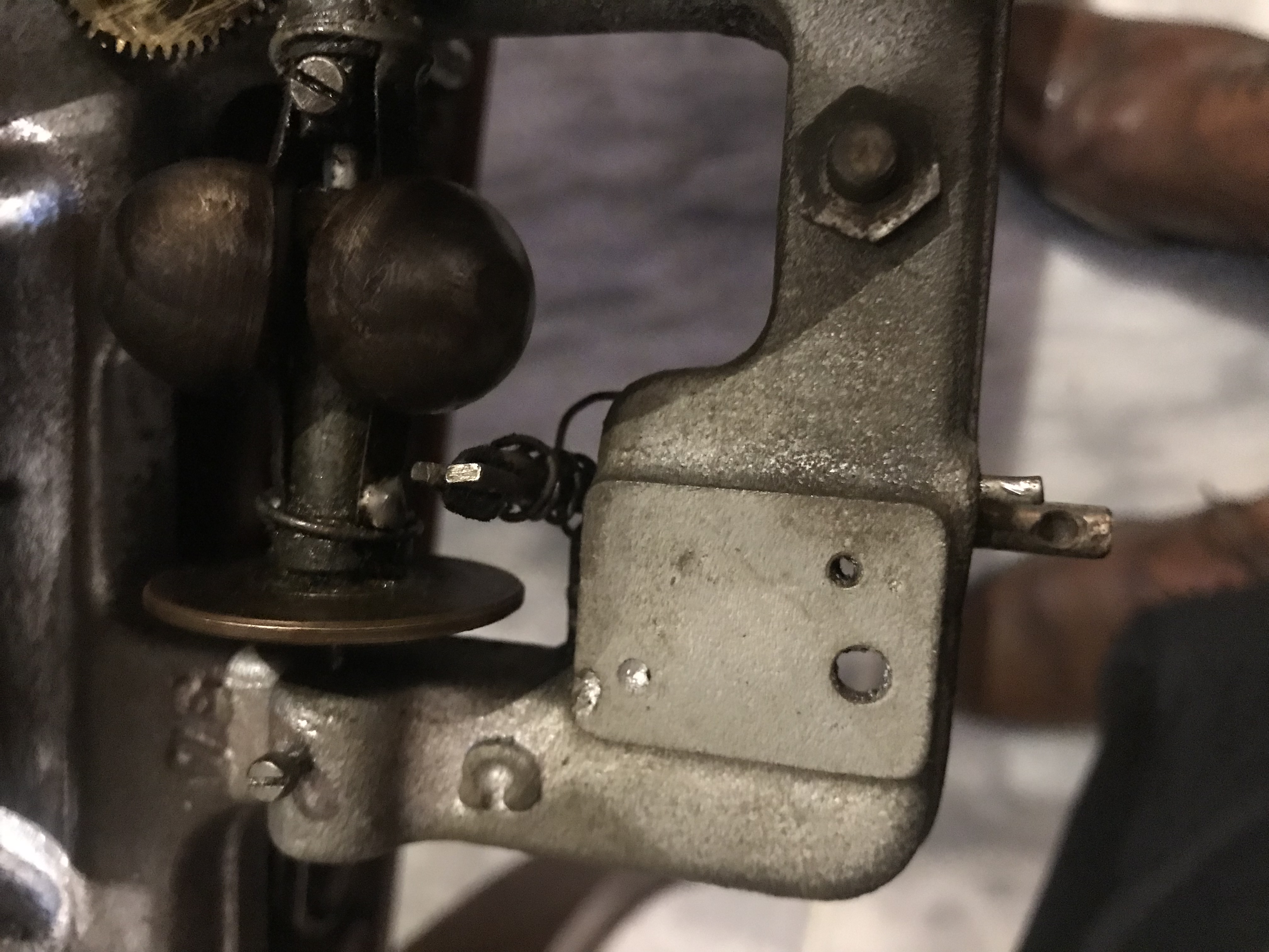 As to the arm with the leather pad... Your leather pad is missing. The bit of leather is supposed to be clamped/pinched in the forked end of the speed regulator arm. A small piece of leather from a treadle powered sewing machine belt is usually ideal.