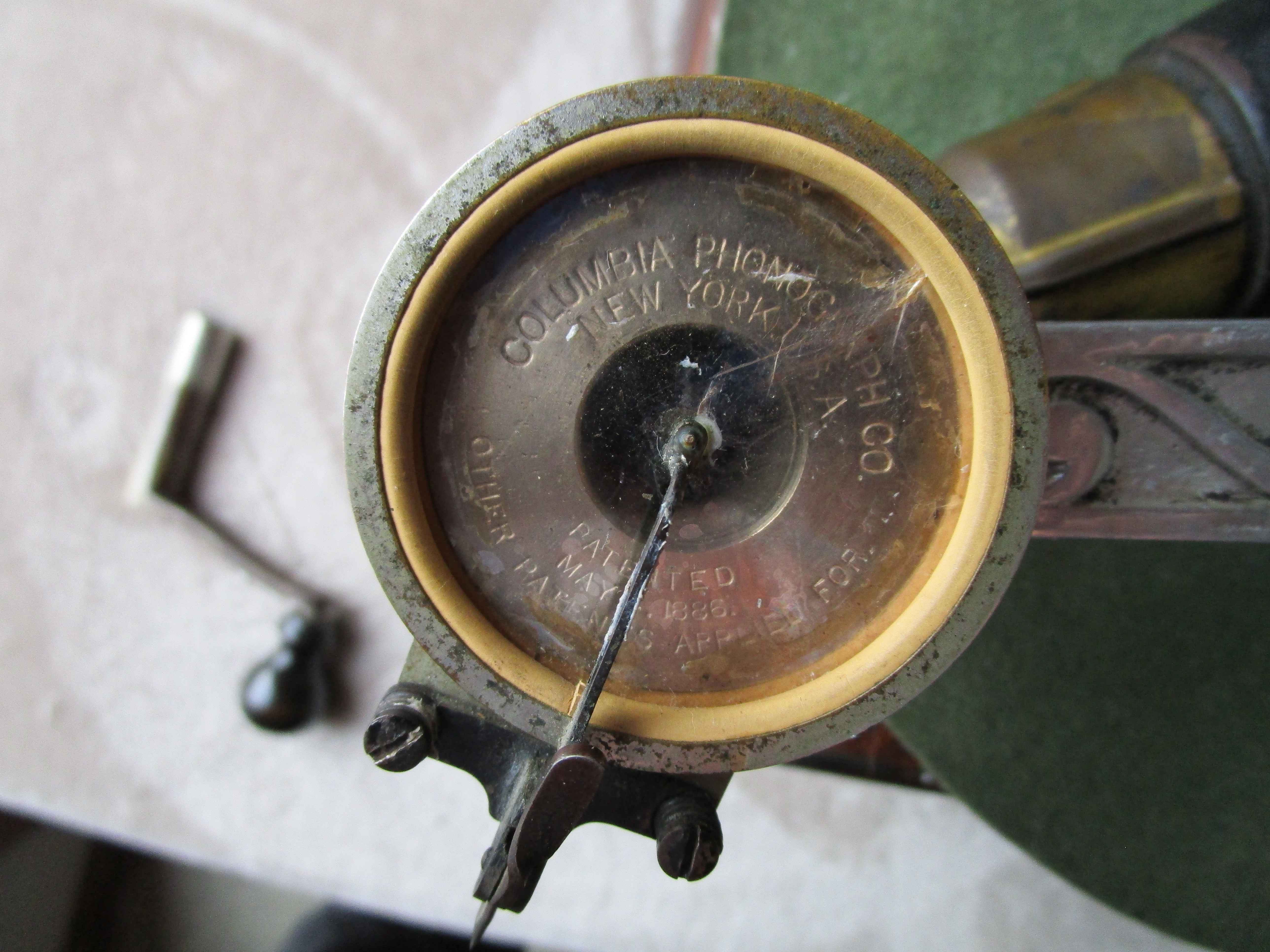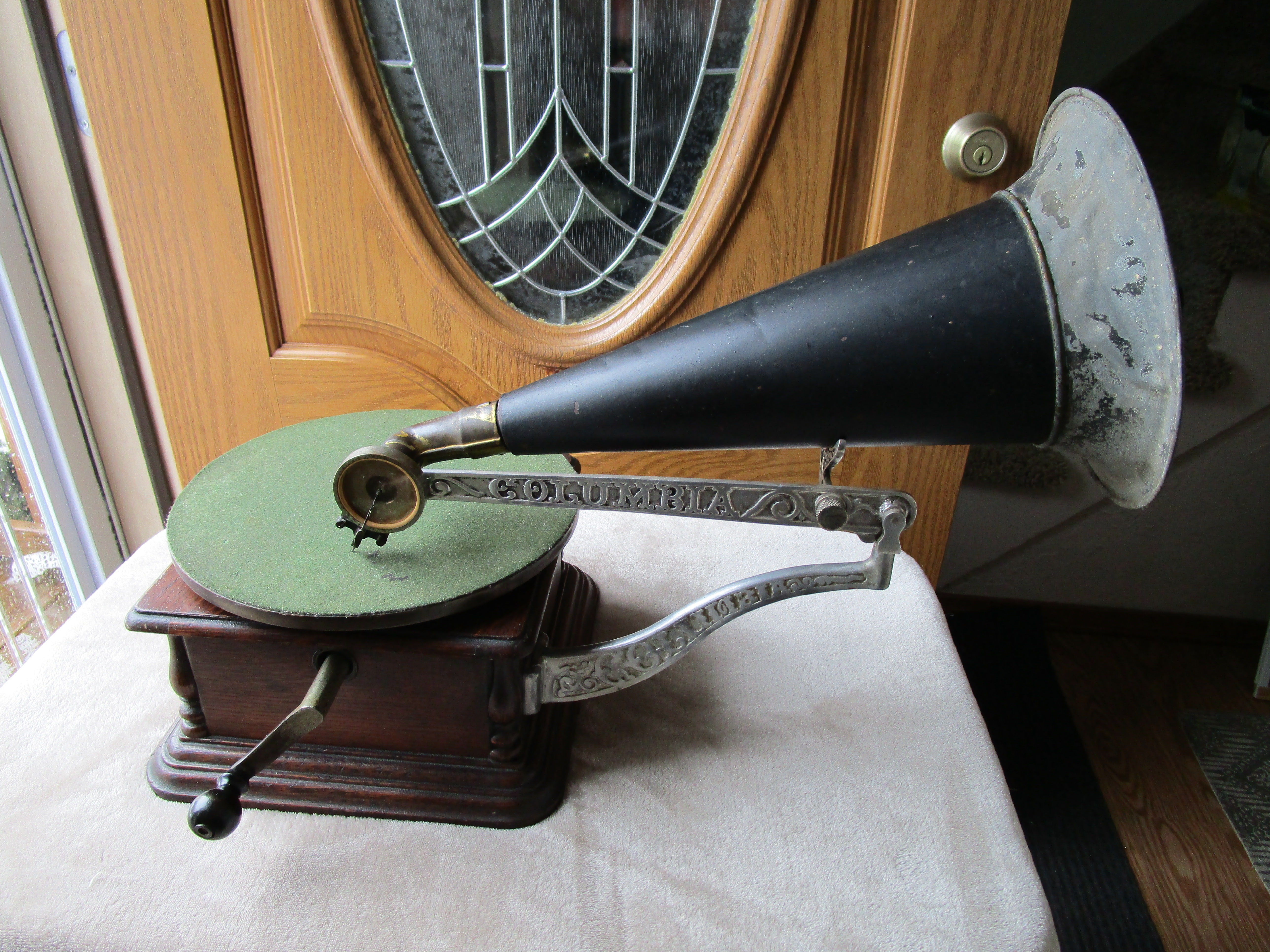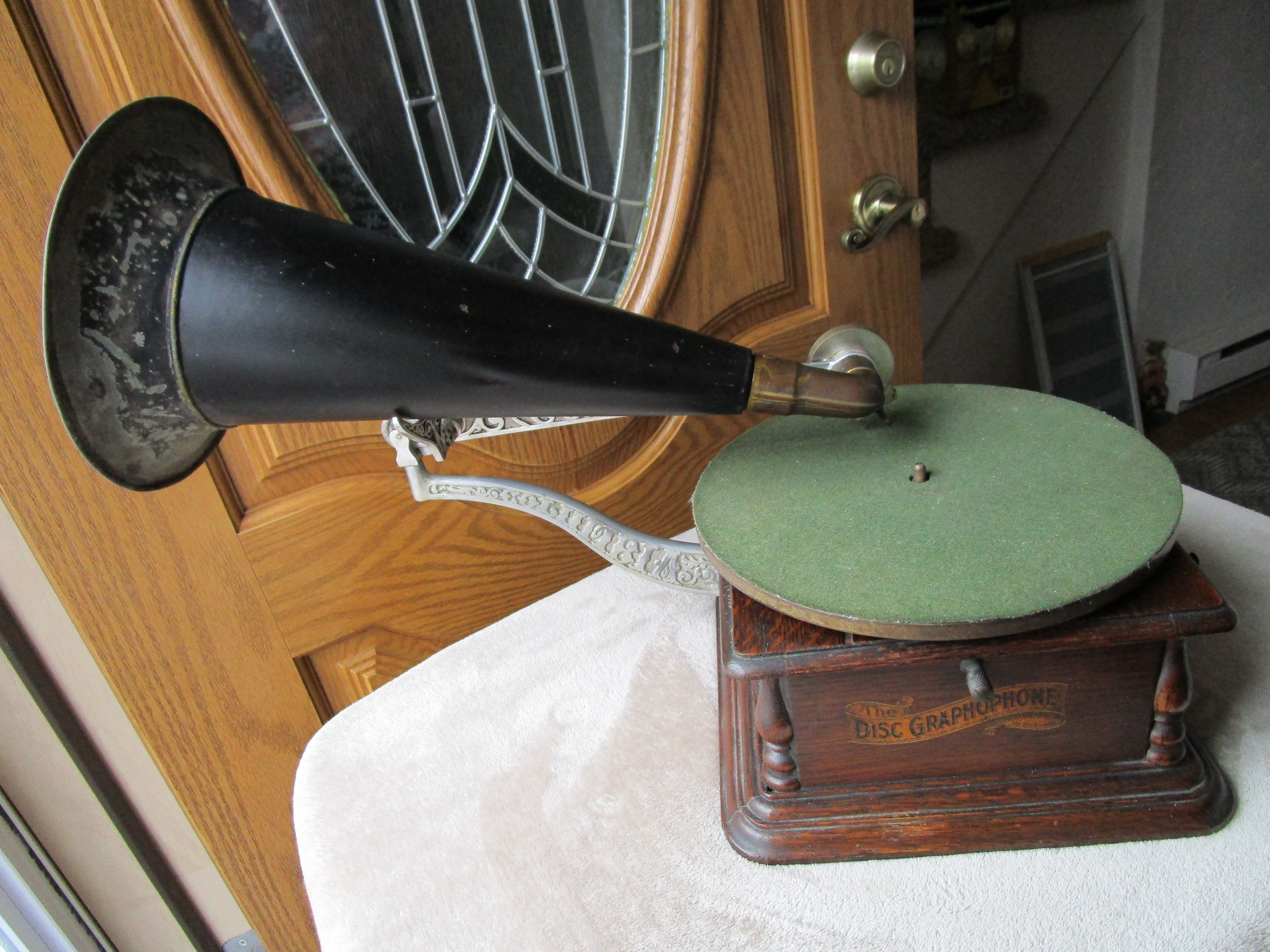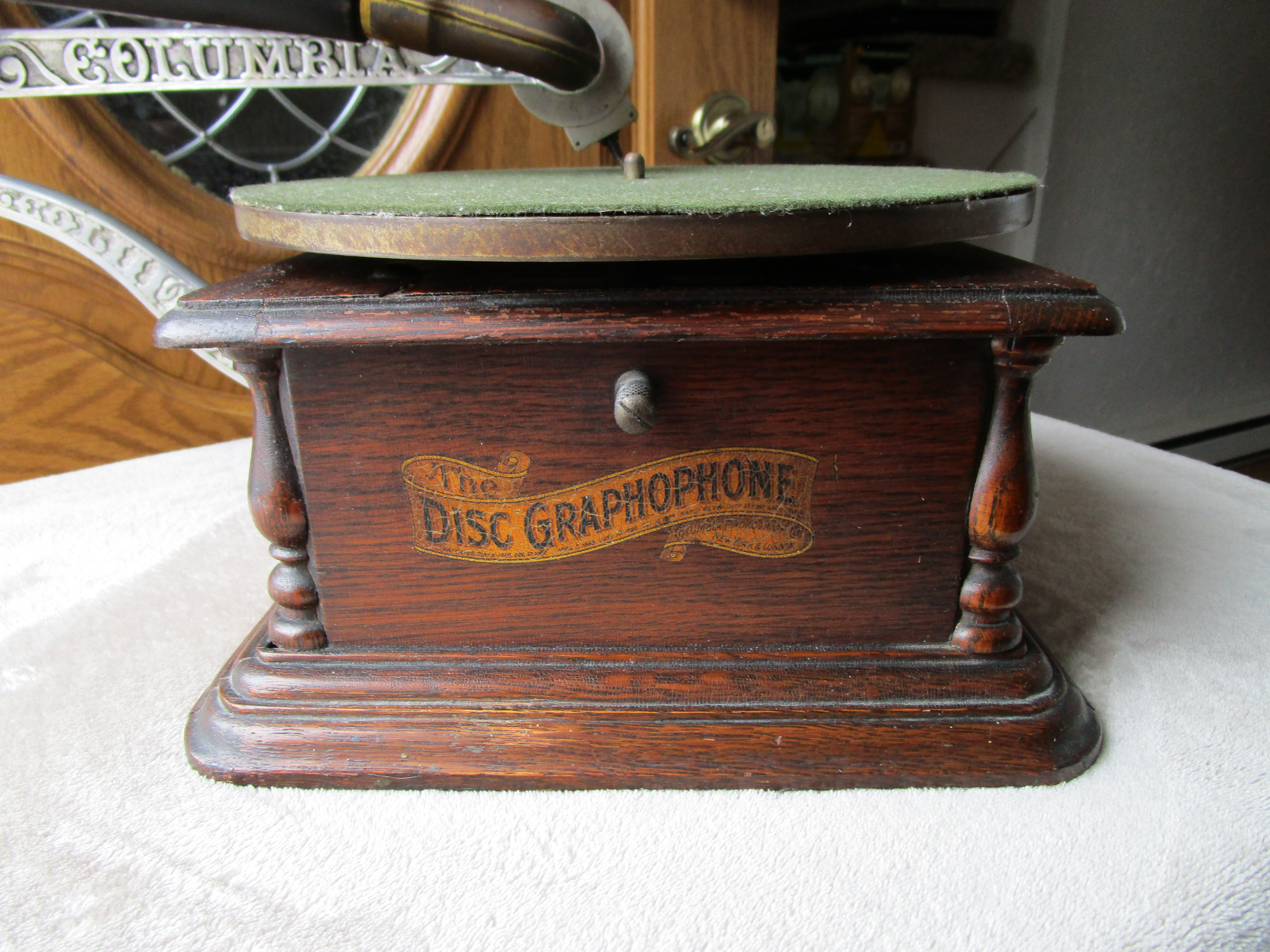From my personal collection here is a nice Columbia AJ Disc Graphophone. I've included pictures and a video of it playing. This cranks up nicely and plays flawlessly with a whisper quiet motor. The only possible detractions are a tiny veneer flake on the motor board and the elbow has lost its original rubber insert which holds the reproducer throat. I have wrapped a small section of velcro around the reproducer throat and the reproducer slides into the elbow to make a perfect fit. The horn has general handling wear consistent with an early front mount Columbia disc Graphophone horn but it is very solid and in excellent functioning condition.