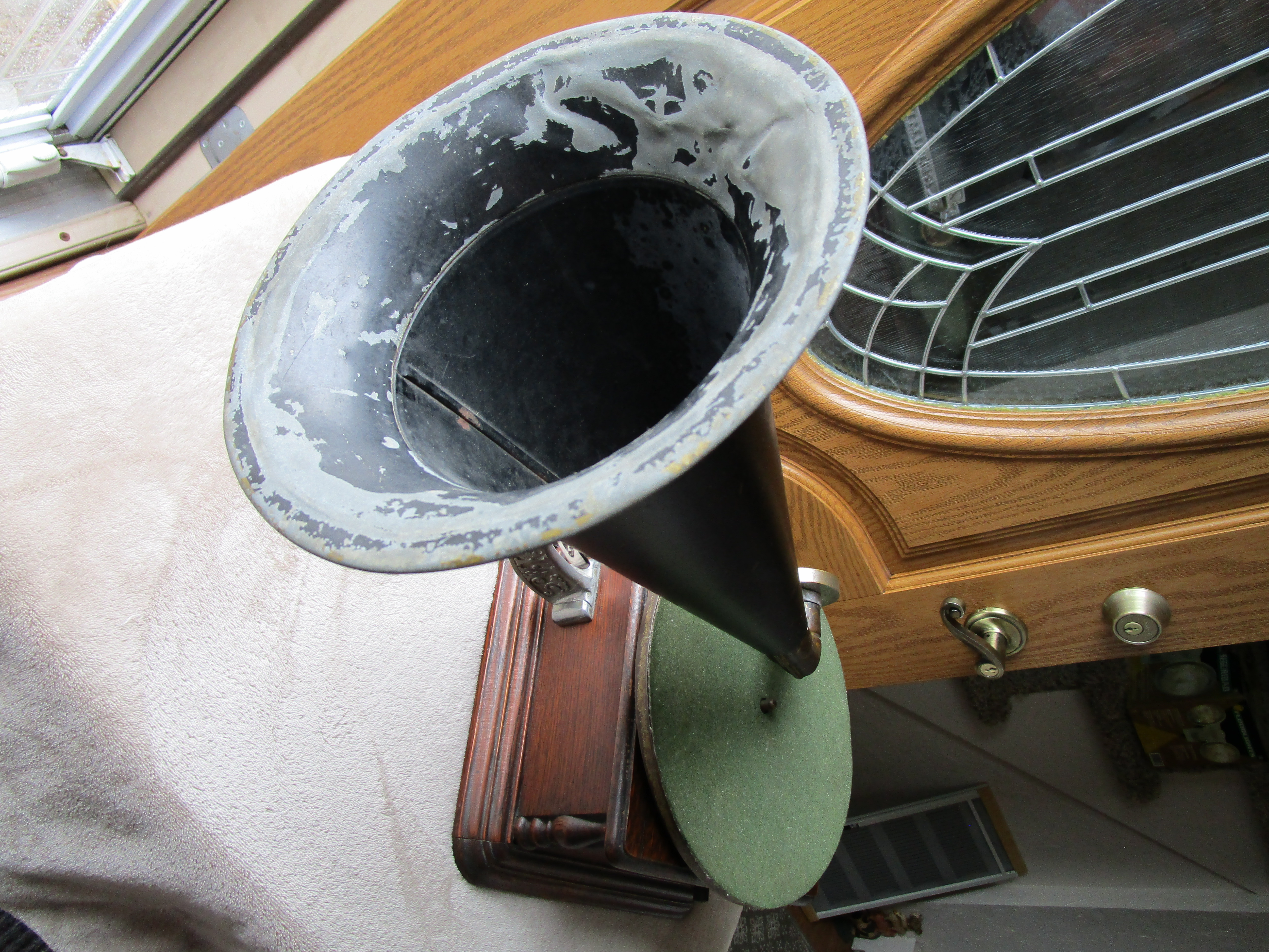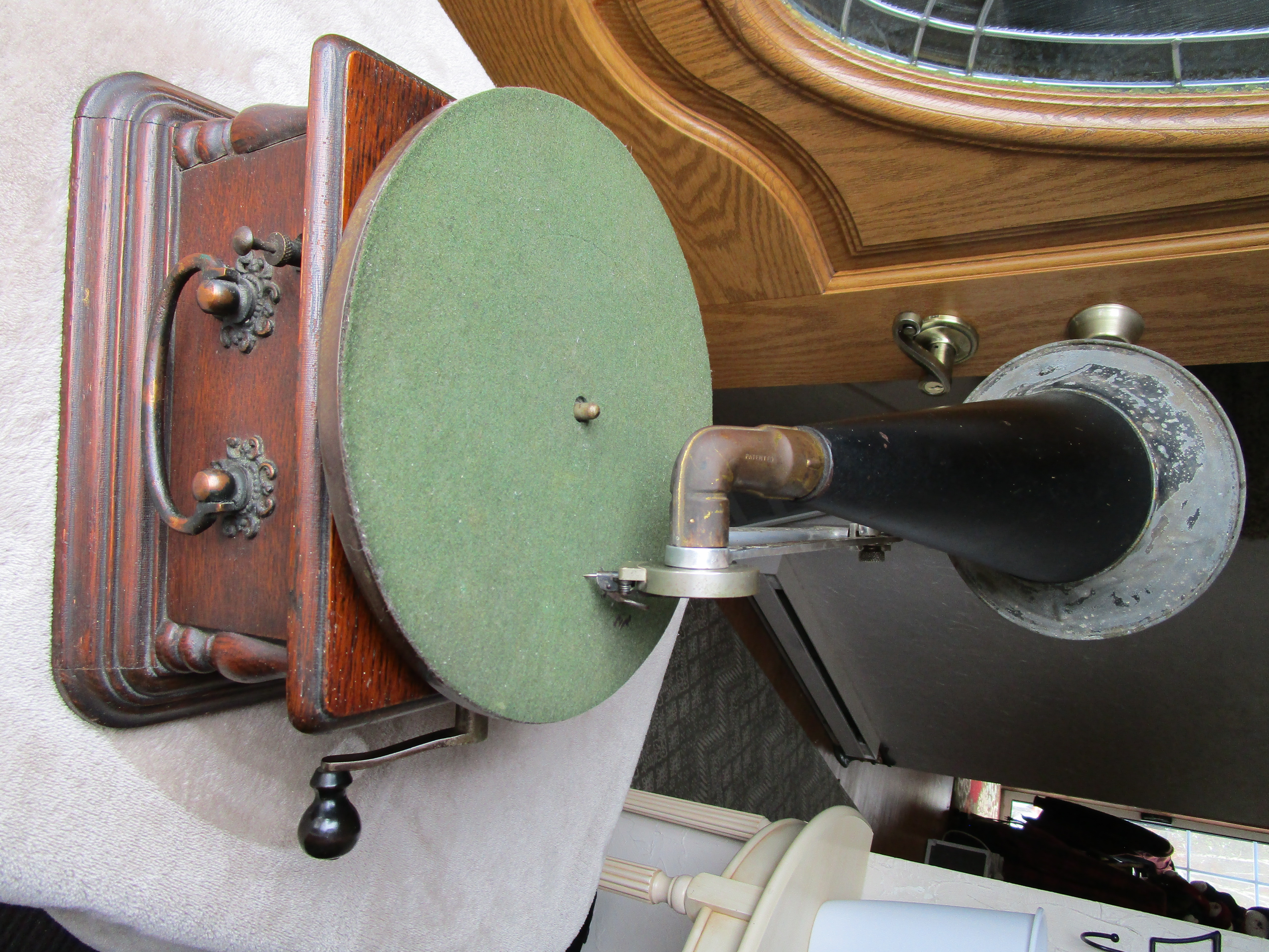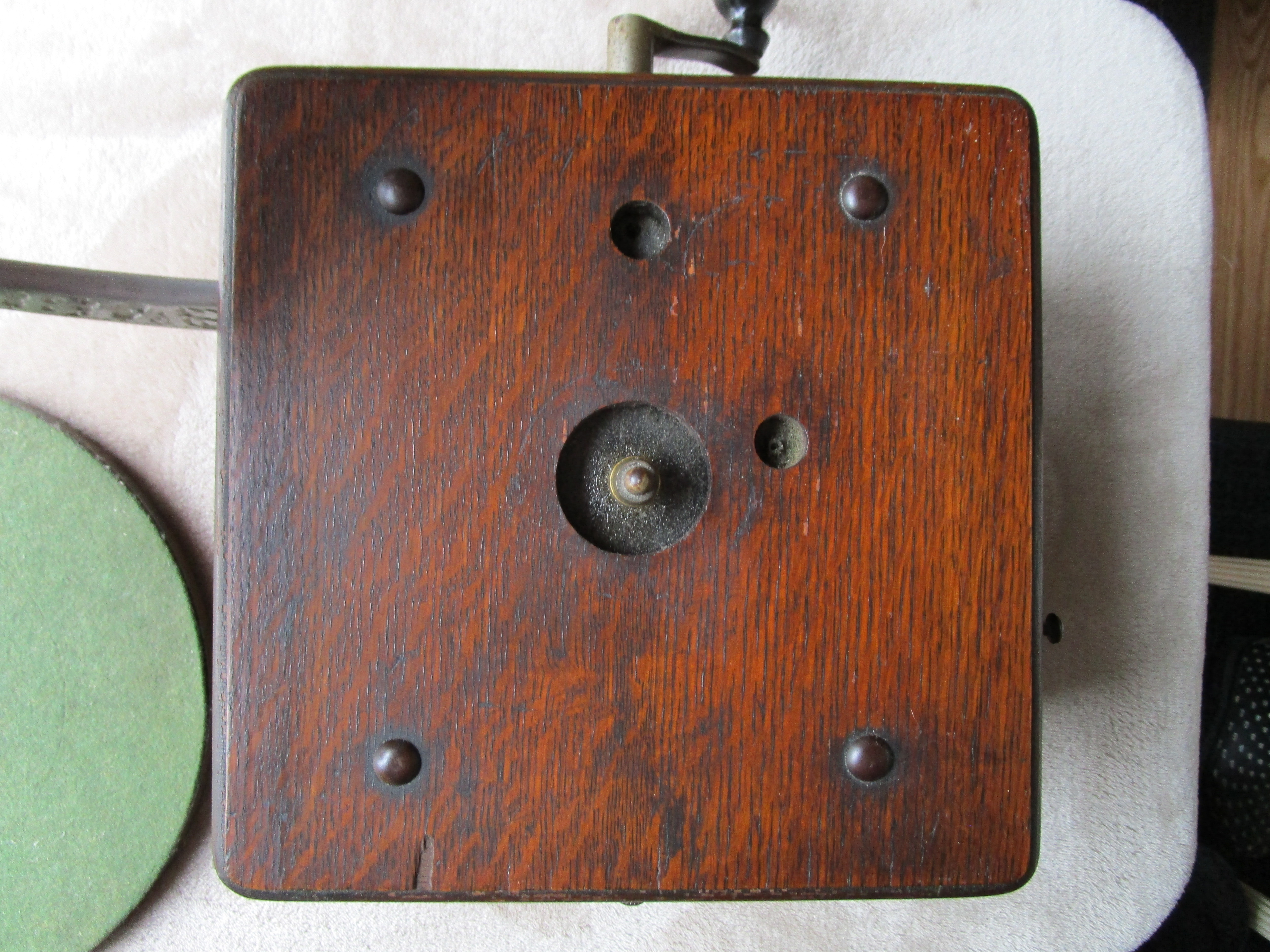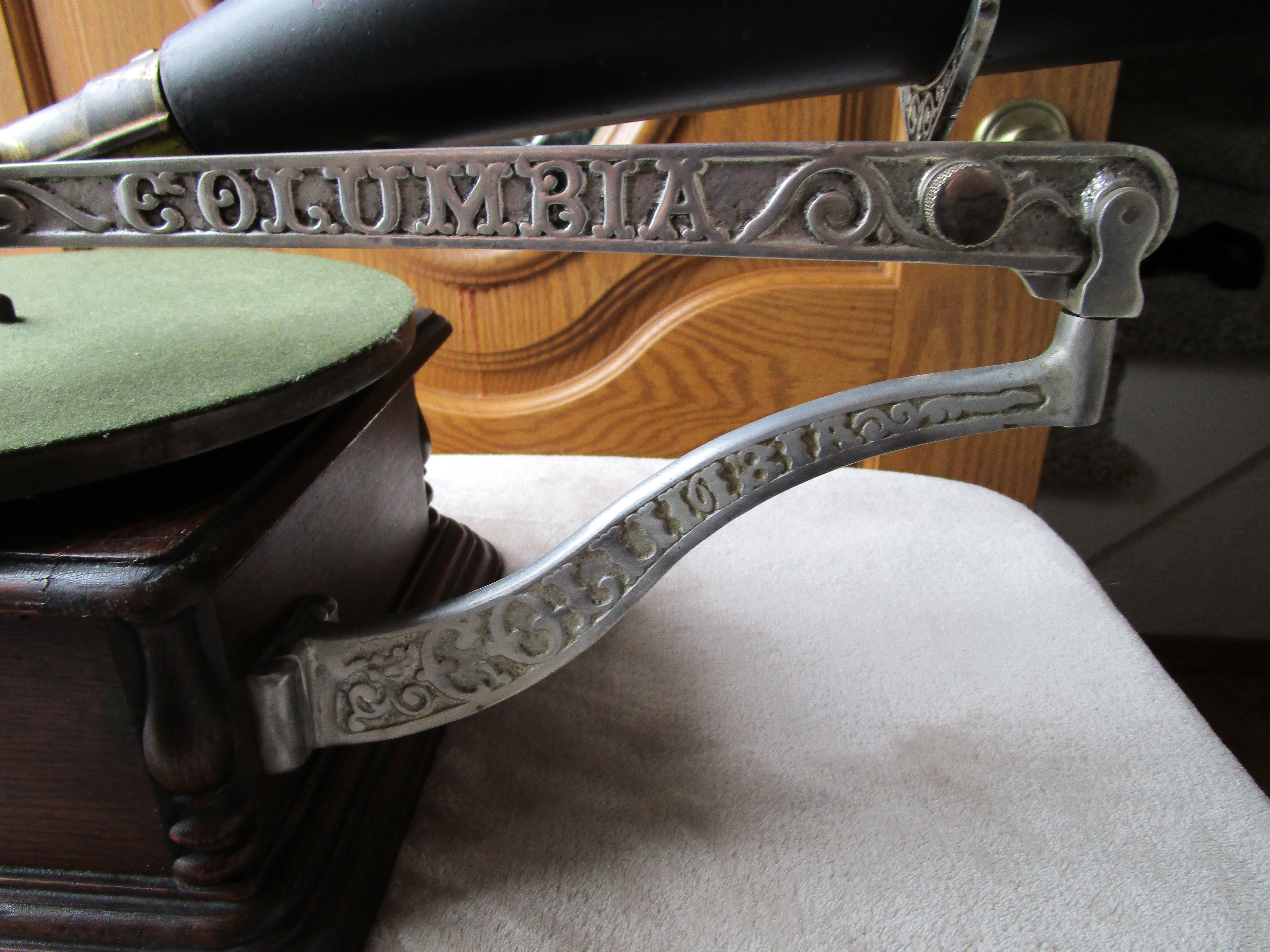 From my personal collection here is a nice Columbia AJ Disc Graphophone. I've included pictures and a video of it playing. This cranks up nicely and plays flawlessly with a whisper quiet motor. The only possible detractions are a tiny veneer flake on the motor board and the elbow has lost its original rubber insert which holds the reproducer throat. I have wrapped a small section of velcro around the reproducer throat and the reproducer slides into the elbow to make a perfect fit. The horn has general handling wear consistent with an early front mount Columbia disc Graphophone horn but it is very solid and in excellent functioning condition.