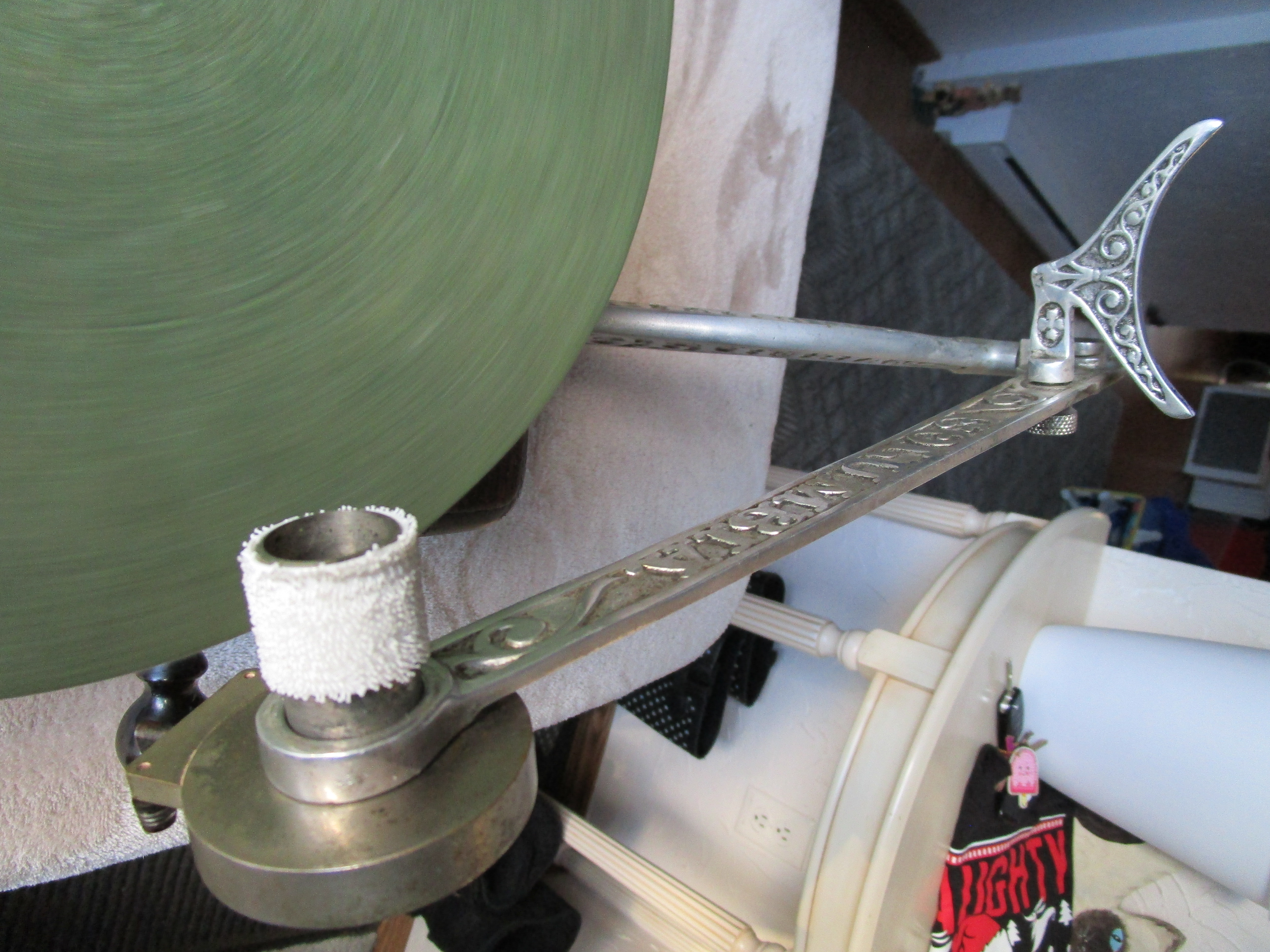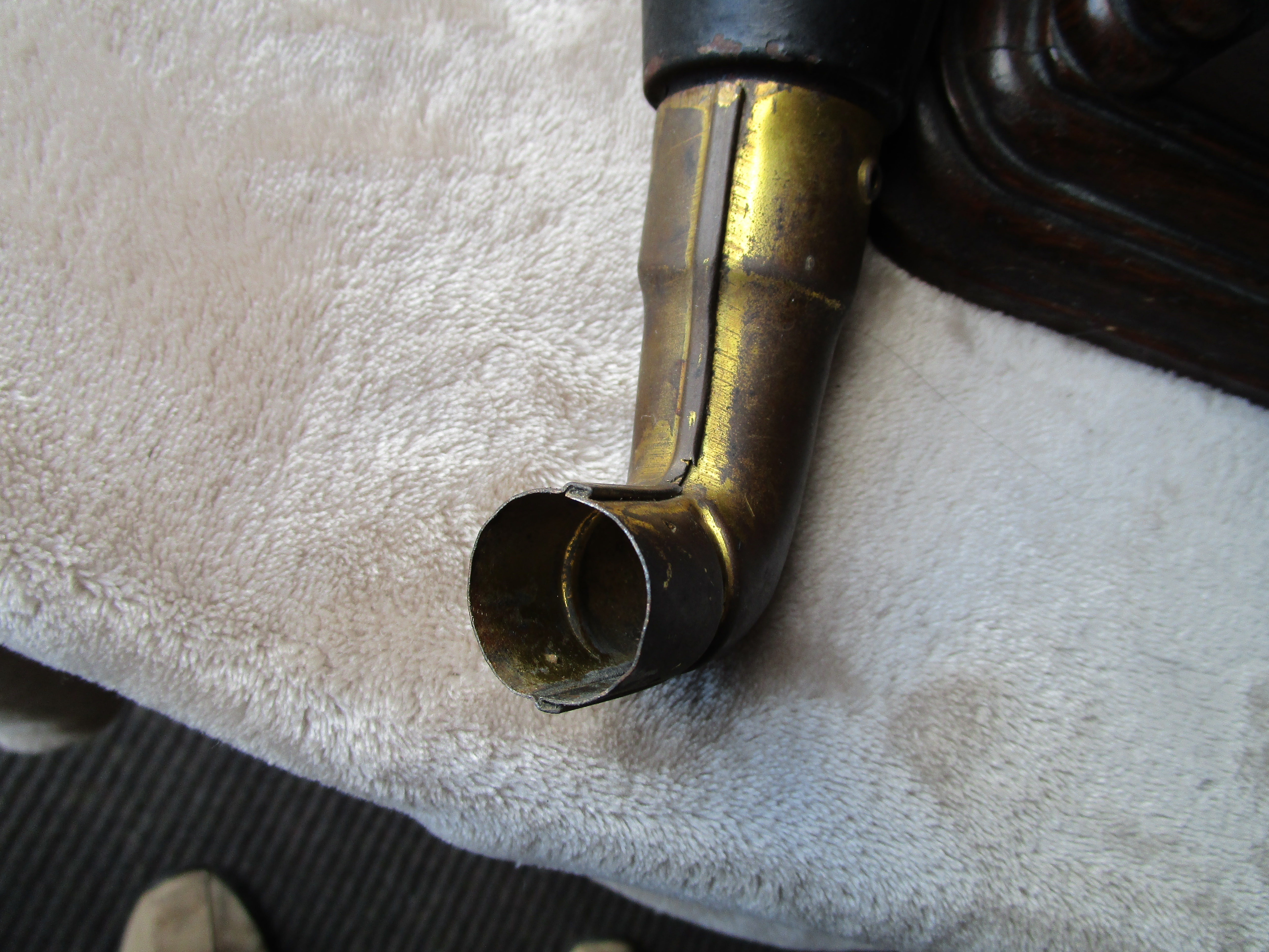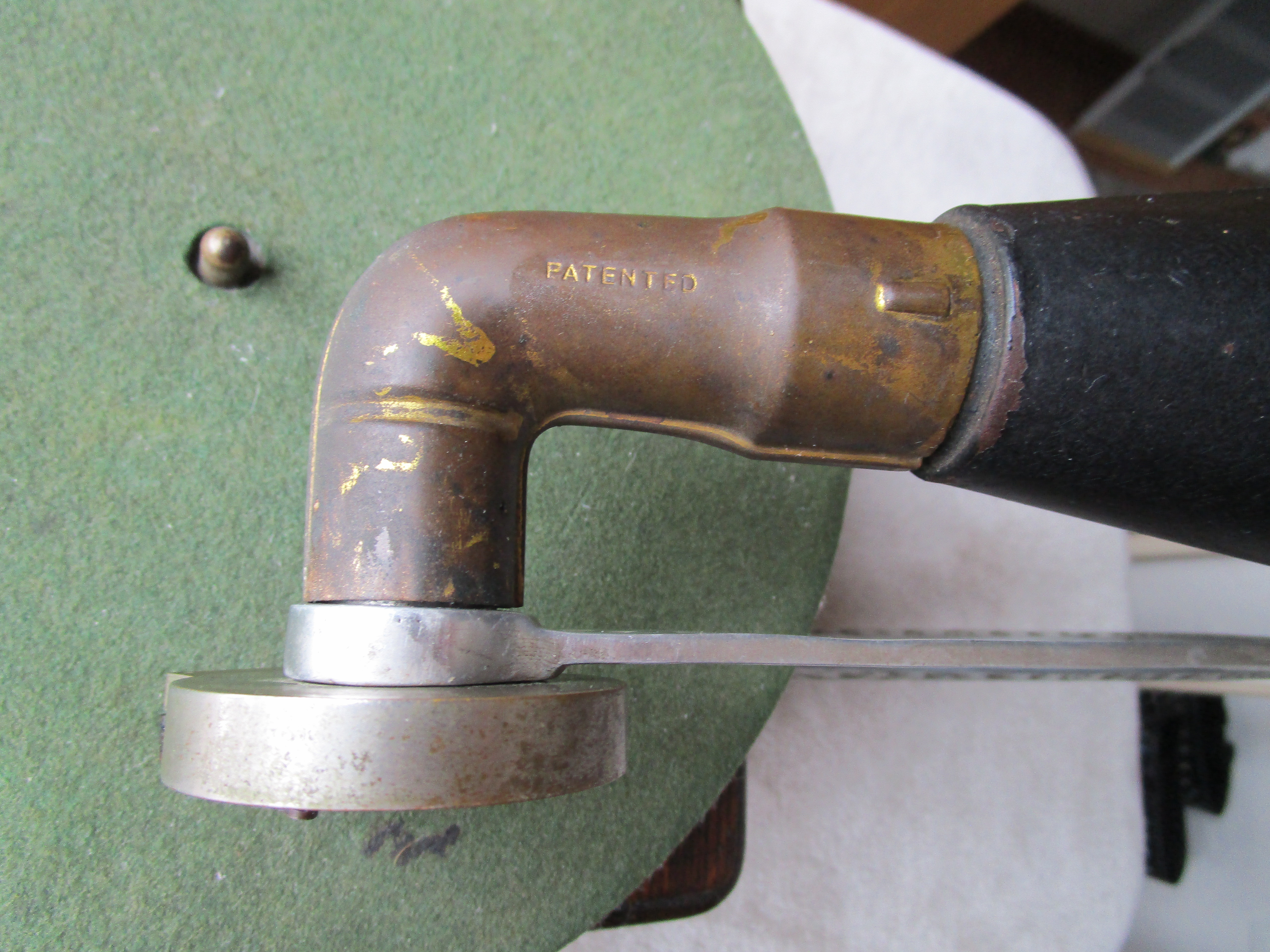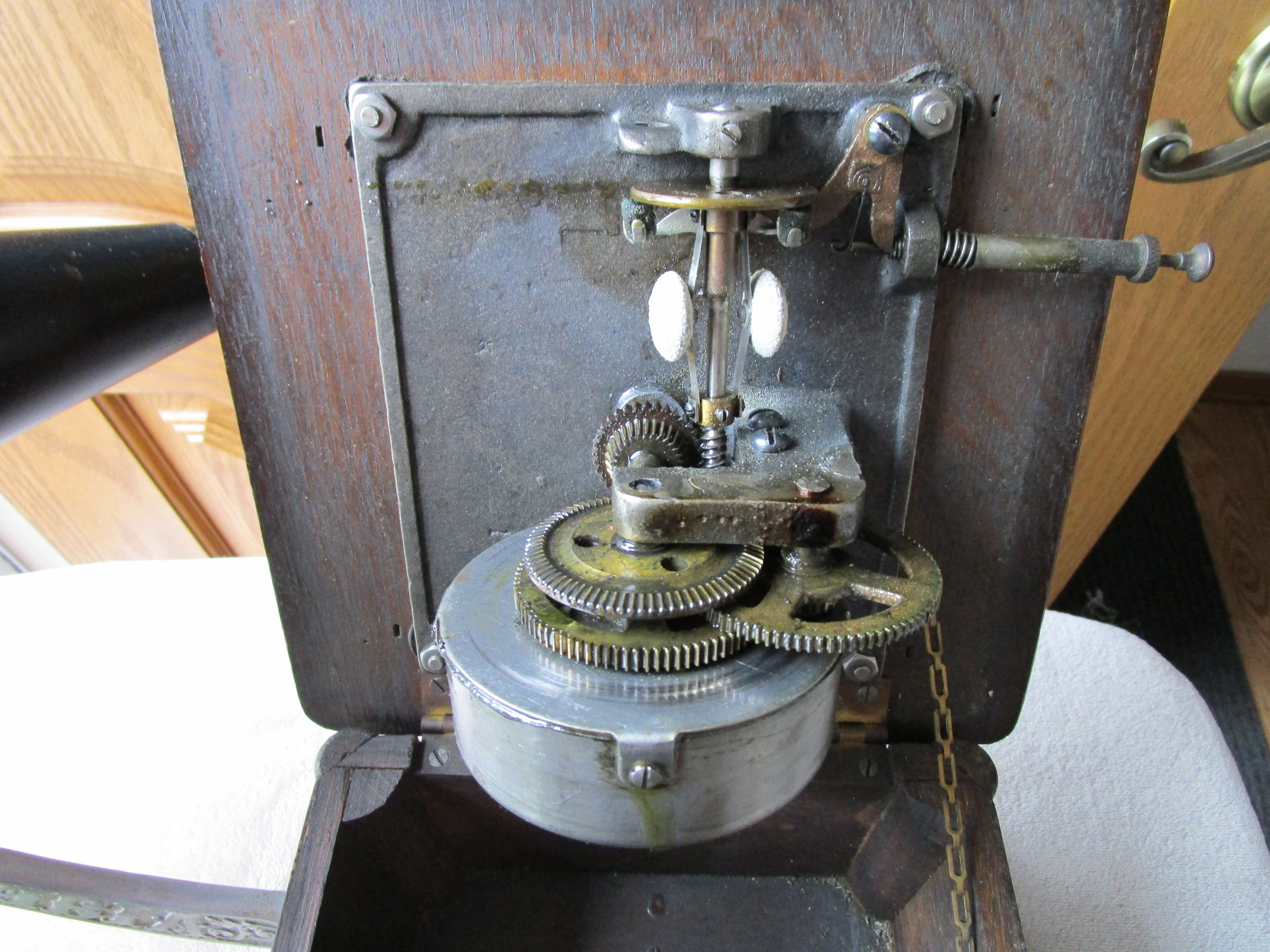 From my personal collection here is a nice Columbia AJ Disc Graphophone. I've included pictures and a video of it playing. This cranks up nicely and plays flawlessly with a whisper quiet motor. The only possible detractions are a tiny veneer flake on the motor board and the elbow has lost its original rubber insert which holds the reproducer throat. I have wrapped a small section of velcro around the reproducer throat and the reproducer slides into the elbow to make a perfect fit. The horn has general handling wear consistent with an early front mount Columbia disc Graphophone horn but it is very solid and in excellent functioning condition.