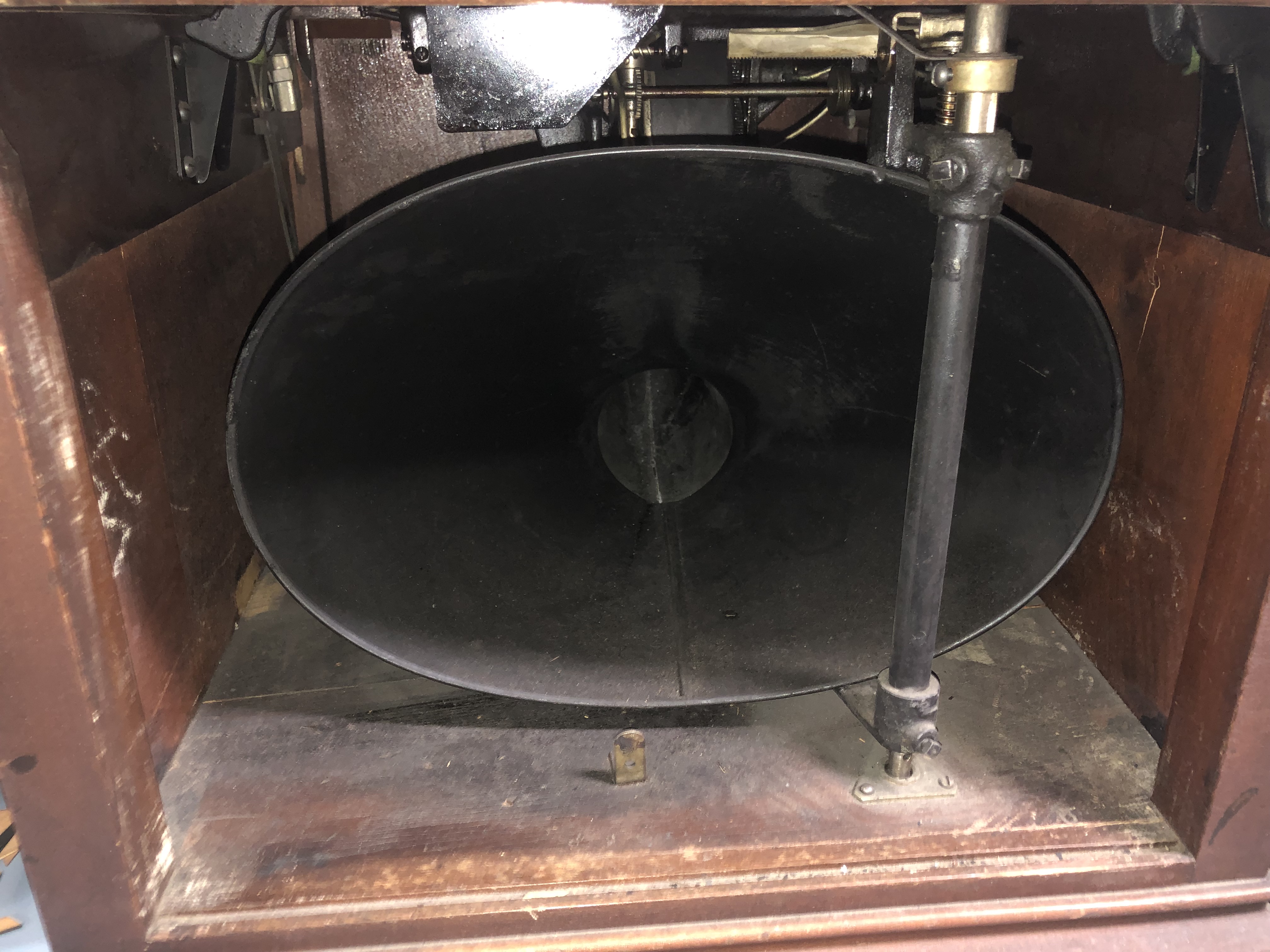 I have an early Edison B19 Chalet, serial number 6582, that has no mute ball/volume control mechanism. I just read briefly that this feature was lacking on the early ones, but added later on. Is this true? There is also a small bracket on mine mounted on the lower inside in front of the horn, and I do not know the purpose of it. My first thought was that it was for a missing mute mechanism.