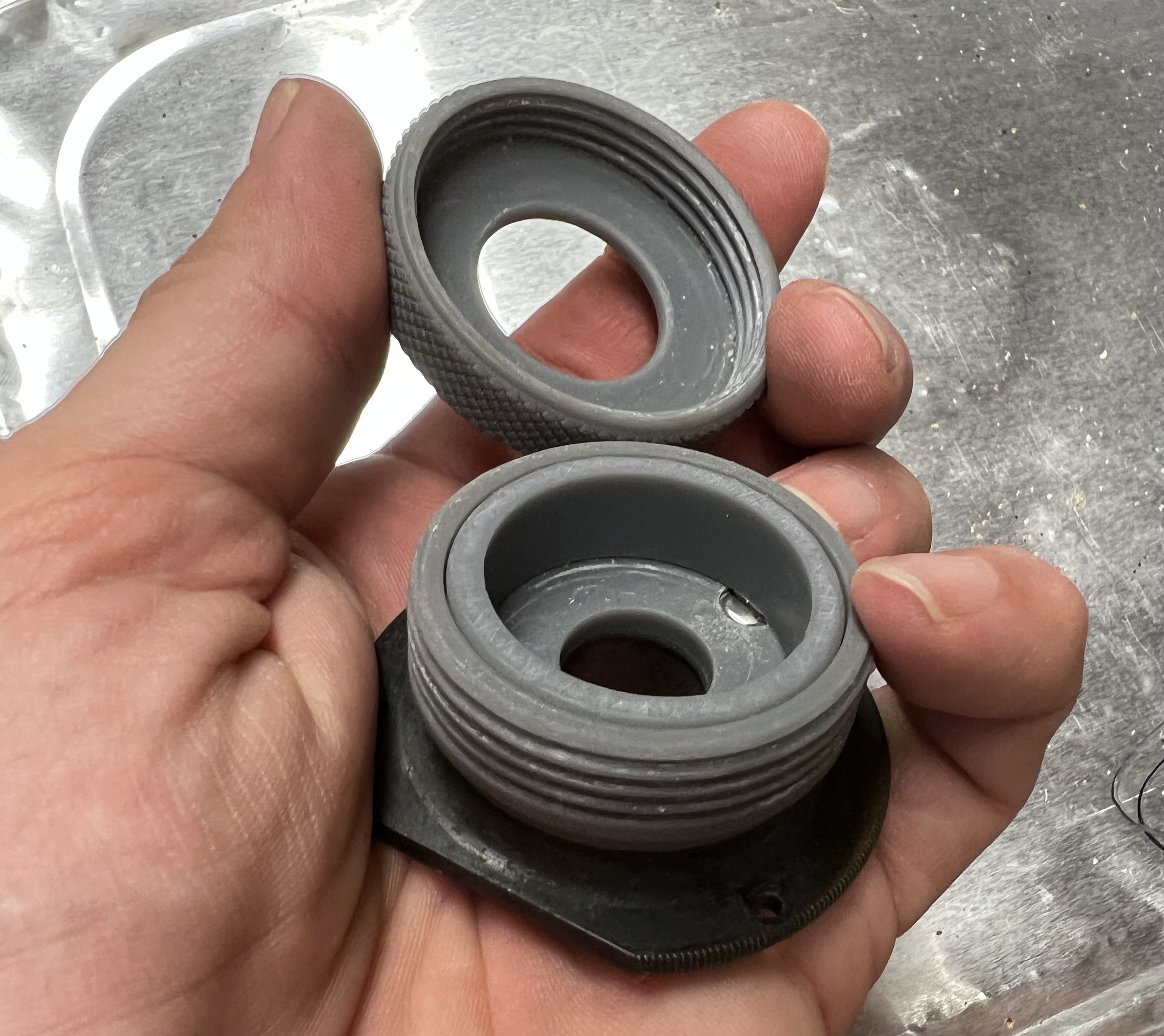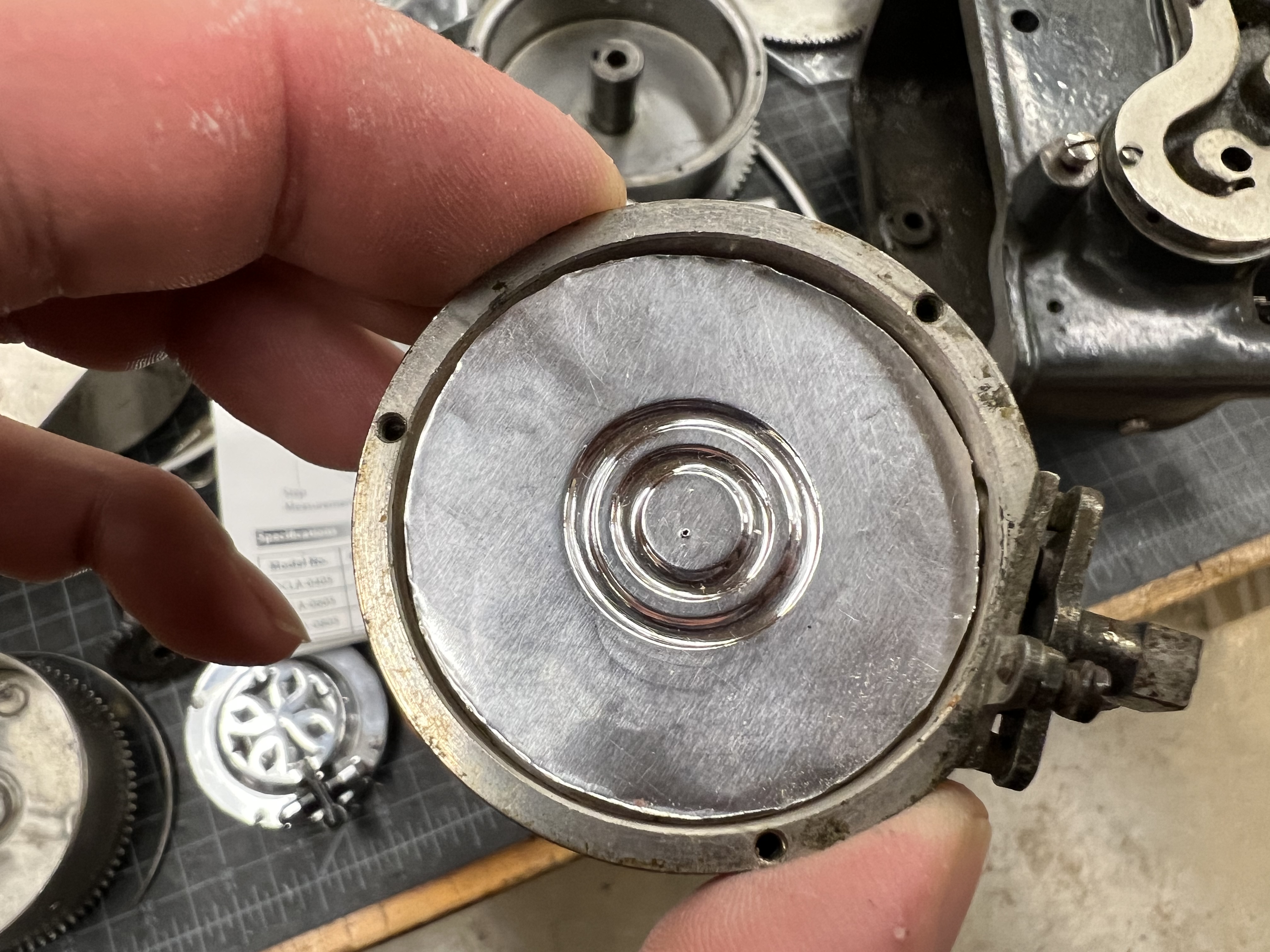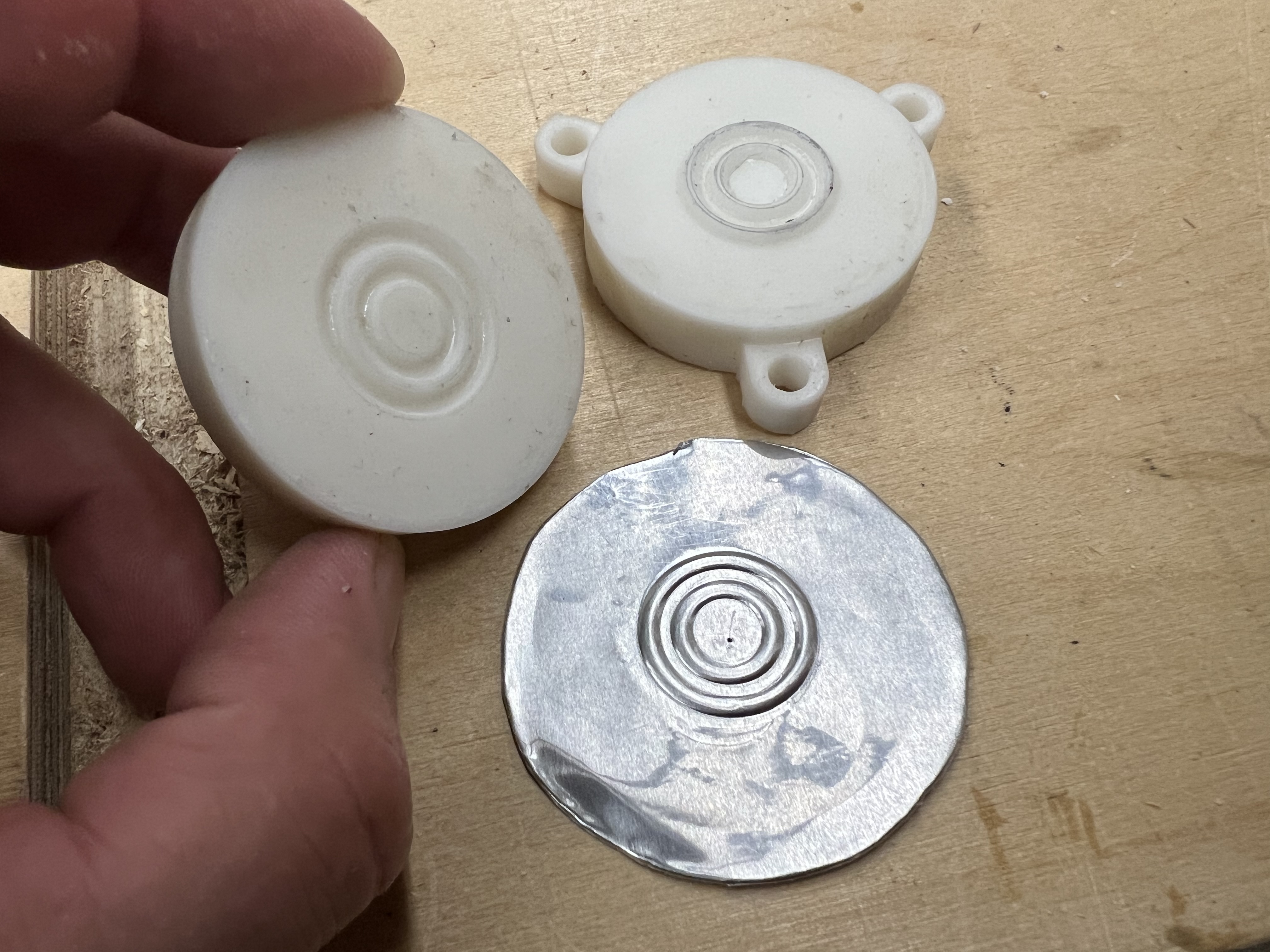 The back was 3D printed, and I 3D printed some molds to make the rubber bushing in various sizes. I also 3D printed a form on which to emboss the diaphragm from aluminum. The aluminum used was from the top of a large tray that food came in at work. No annealing necessary, as it was already very soft and easy to form. A simple wooden tool was enough to make the ring shaped ridges, and stiffened the center of the diaphragm marvelously, while allowing it to flex around the edge.