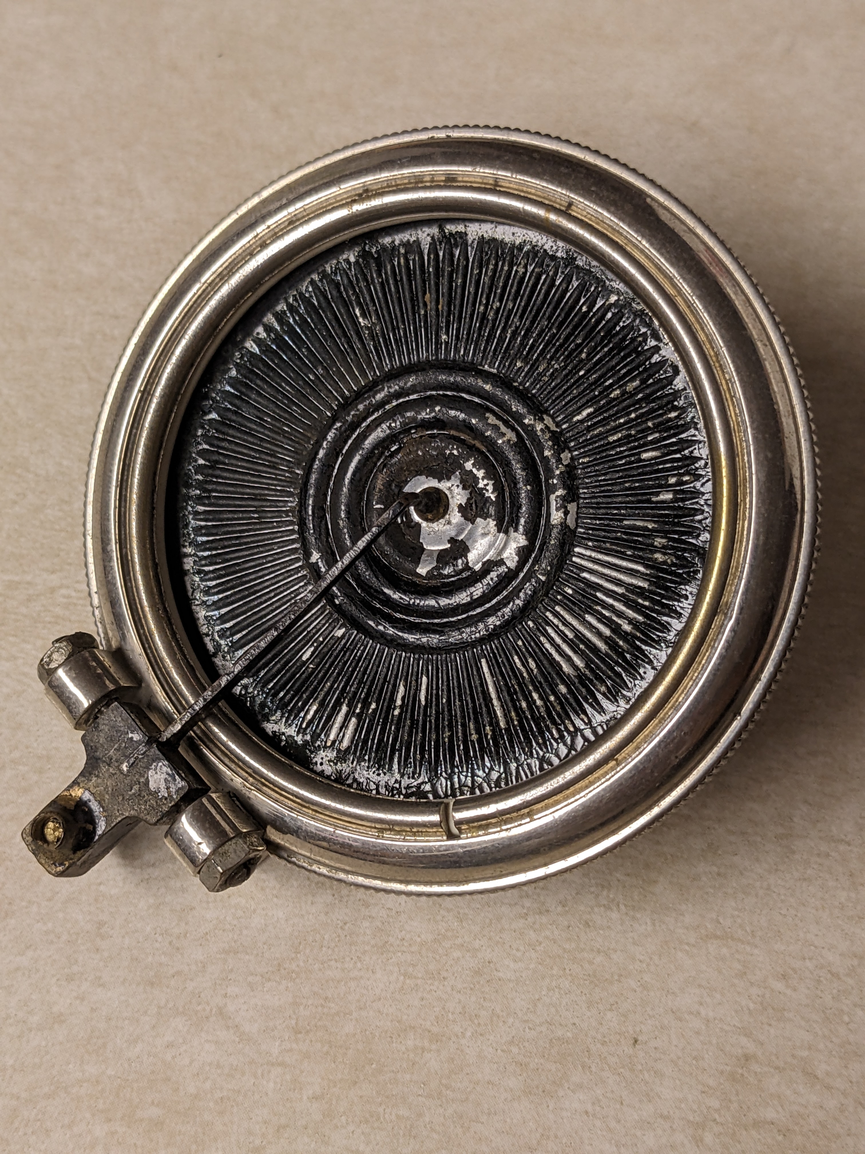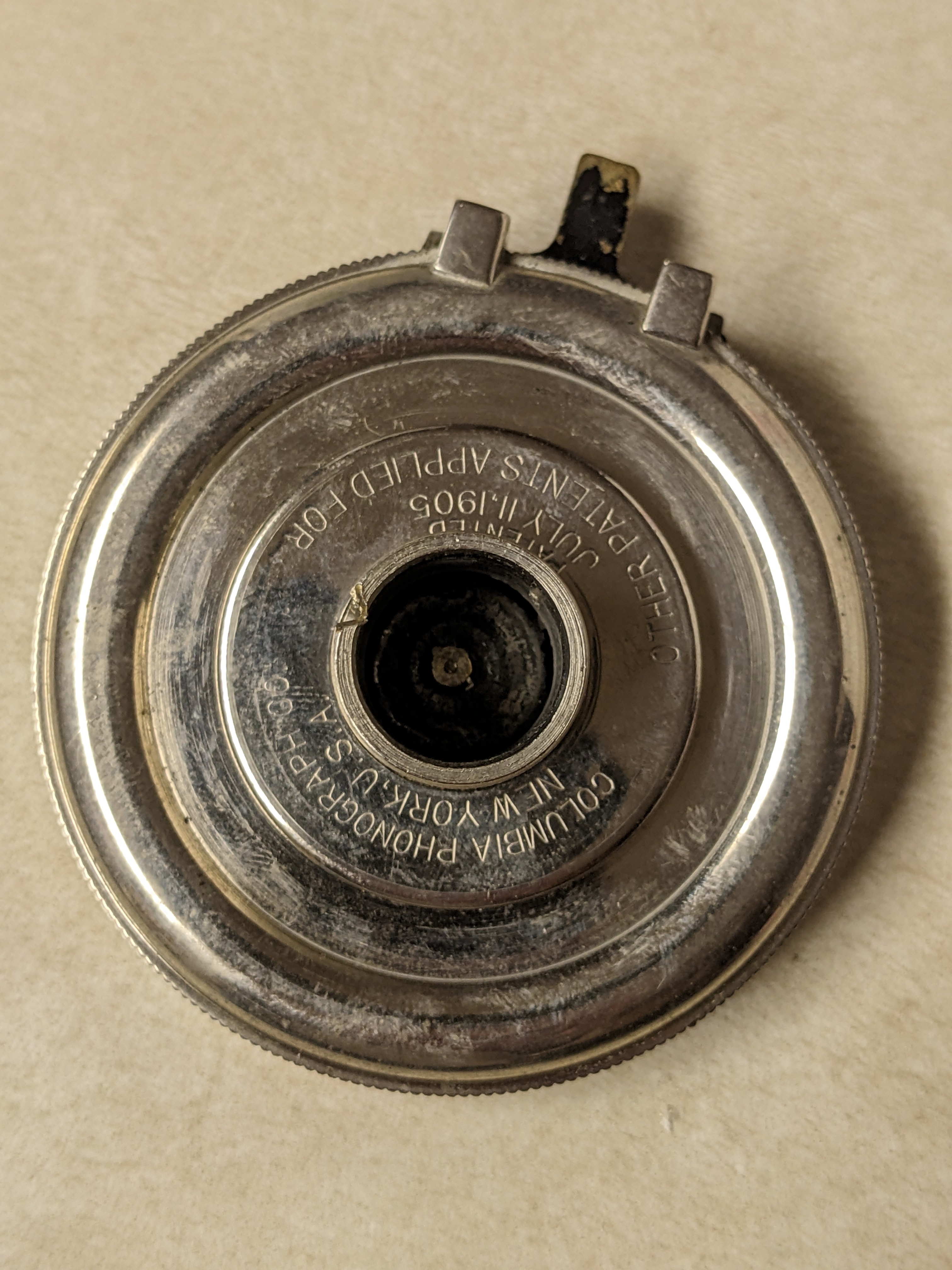 The tonearm is brass, and the diaphragm is aluminum. I’ve seen this same diaphragm before, but can’t remember where. Possibly on another one of these machines. Does anyone know if these aluminum diaphragms are original to these reproducers?
