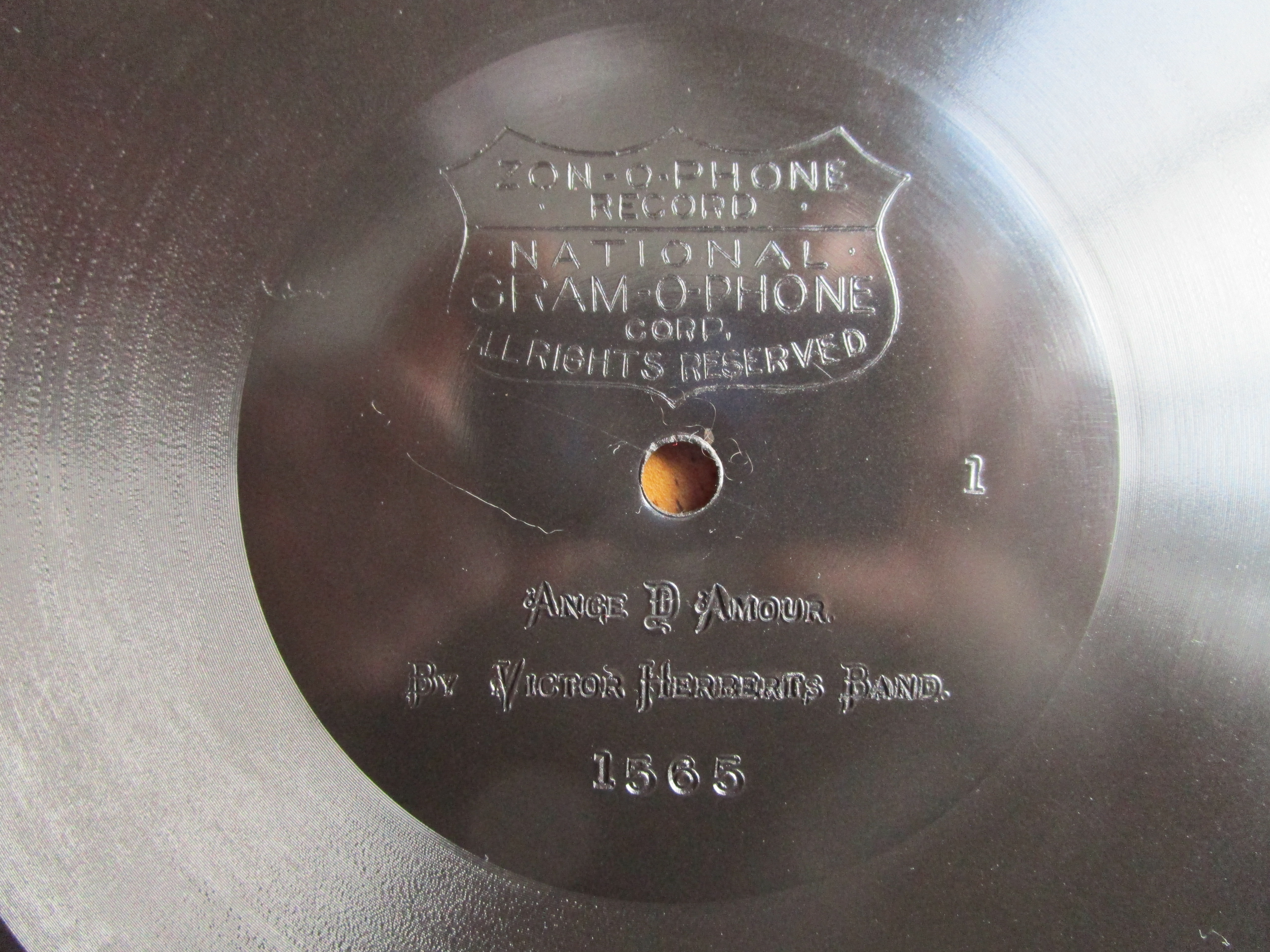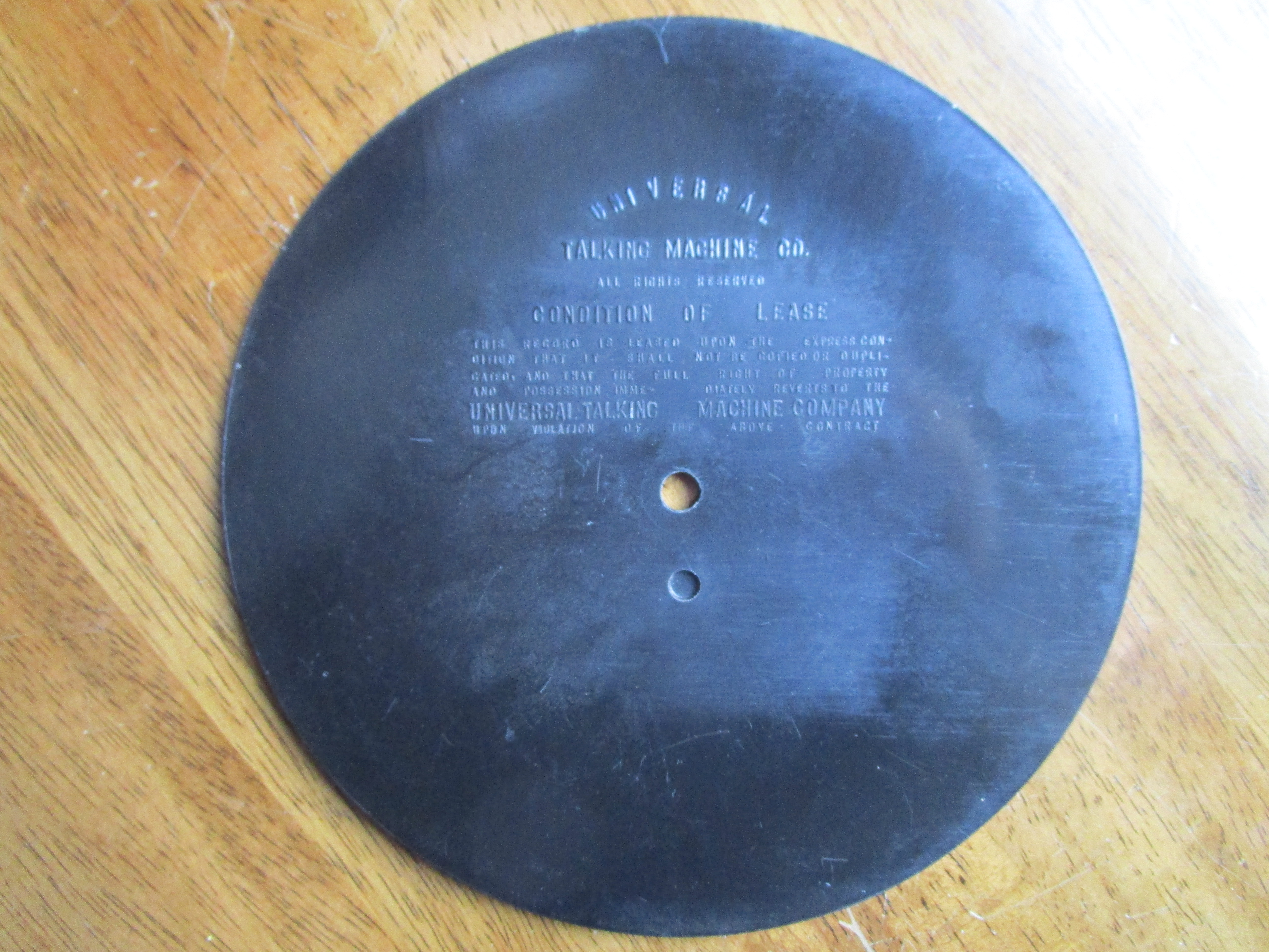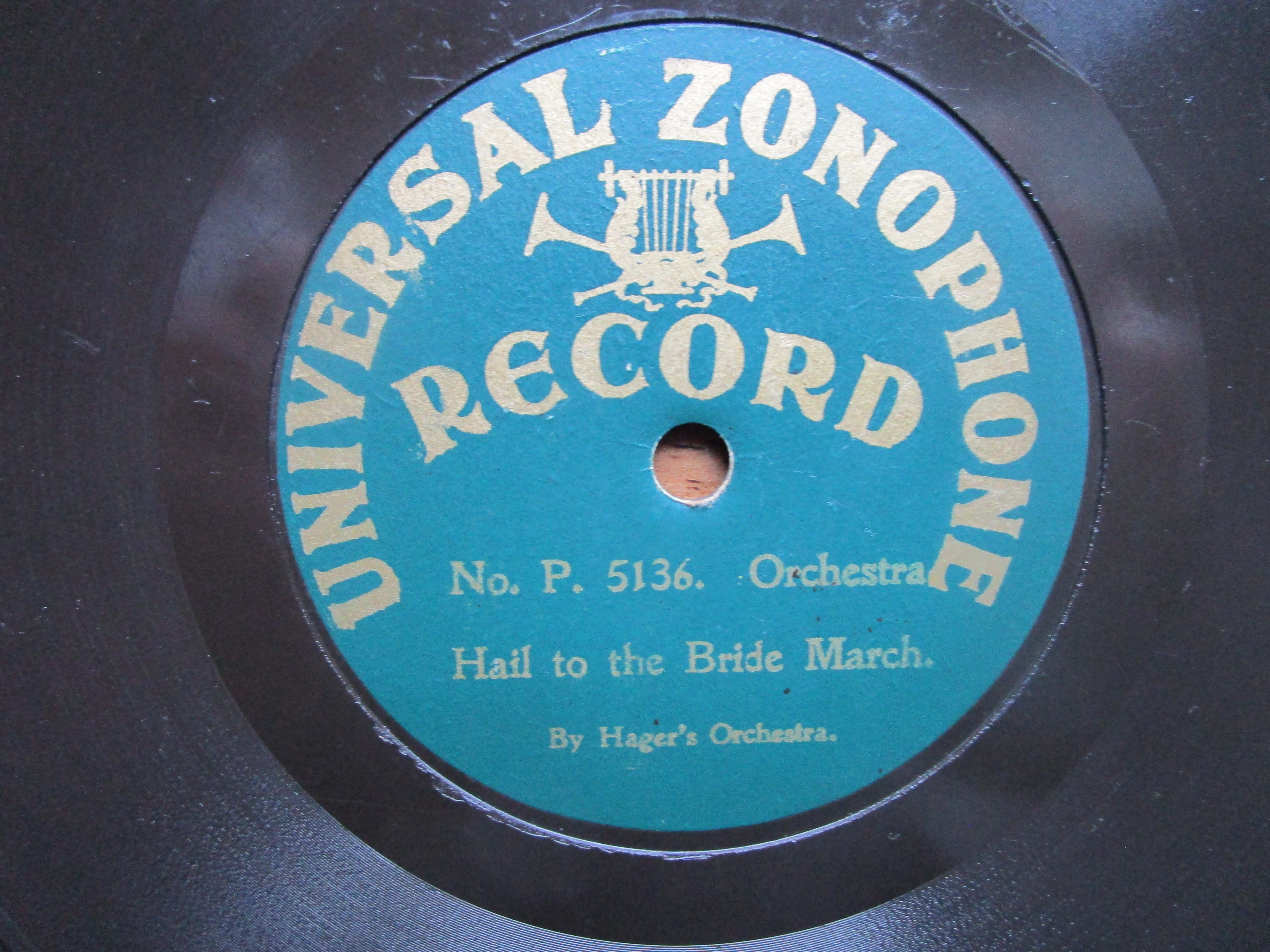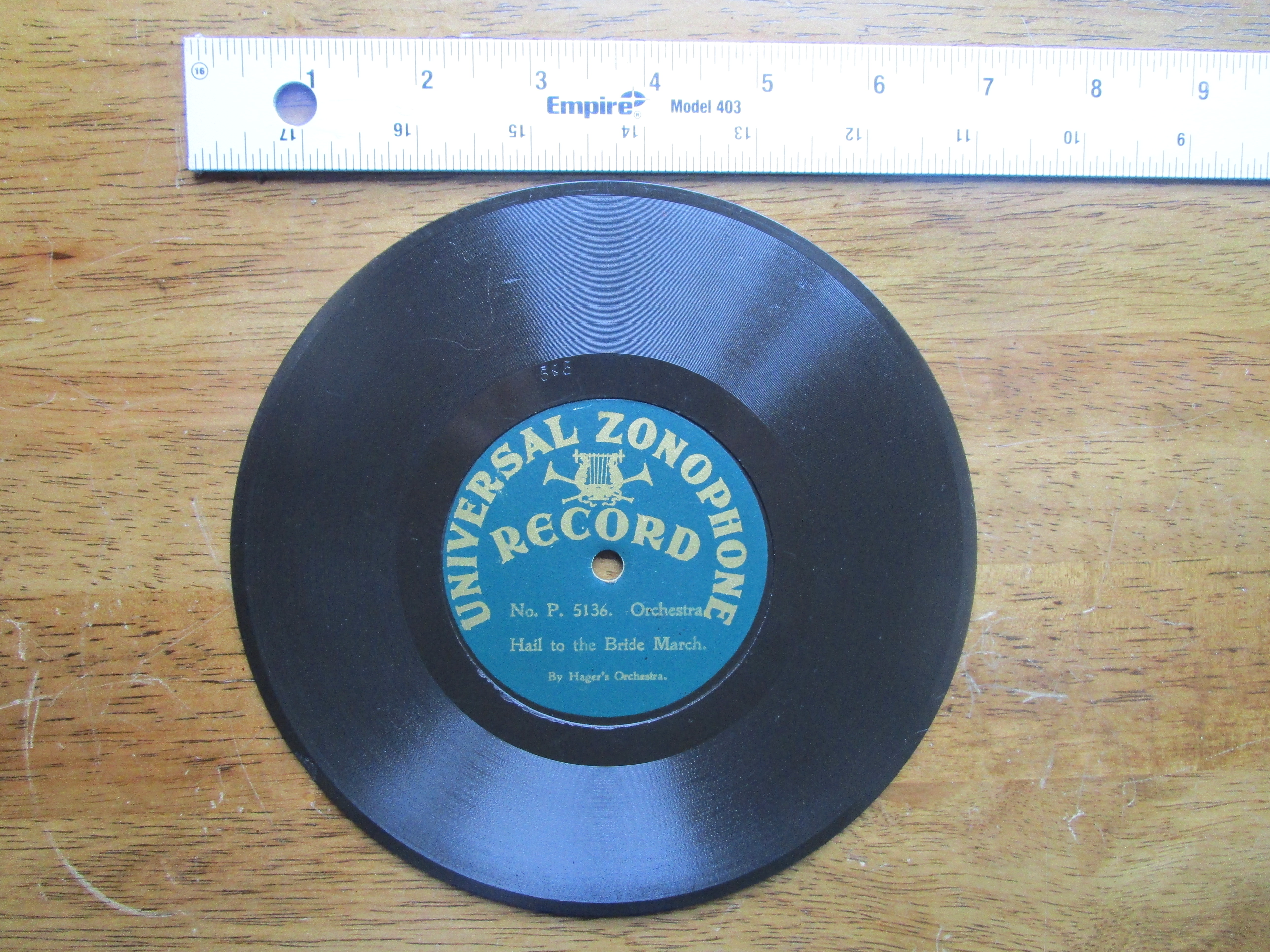 2. SOLD Universal Zonophone $50 (nice long announcement: "TWO STEP...HAIL TO THE BRIDE MARCH...PLAYED BY HAGER'S ORCHESTRA...ZONOPHONE REC-OHHRD" (tiny edge flake not affecting anything)