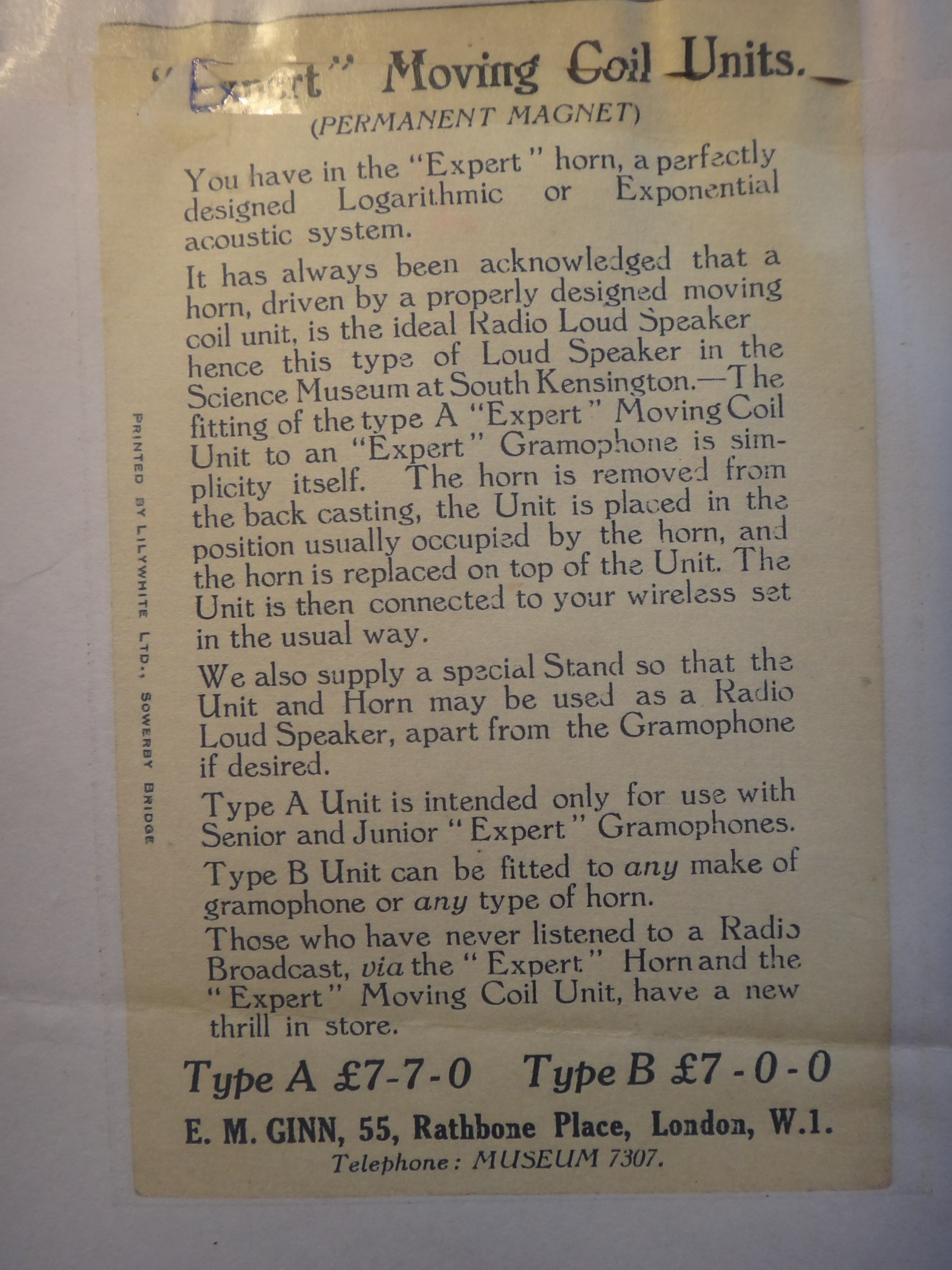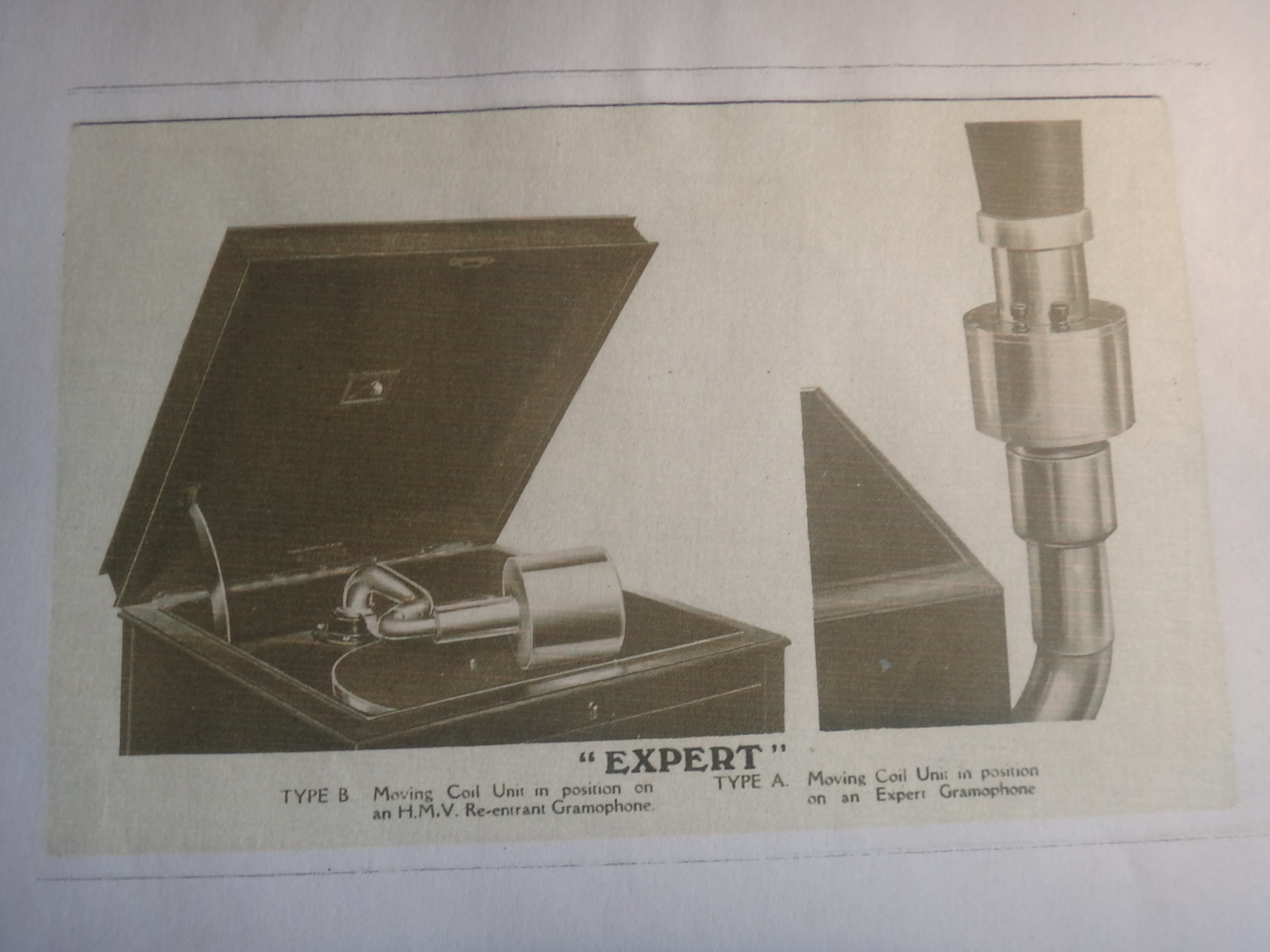 The other method used at the time does not seem to have been employed in this instance as the interposed moving coil would have been visible in the image and resulted in a higher horn position. It would also have been quite inconvenient to have to remove the moving coil to play records which may have a bearing upon the fact that these items are extremely rare---in fact, I have never seen one ! A loudspeaker does seem eminently sensible !