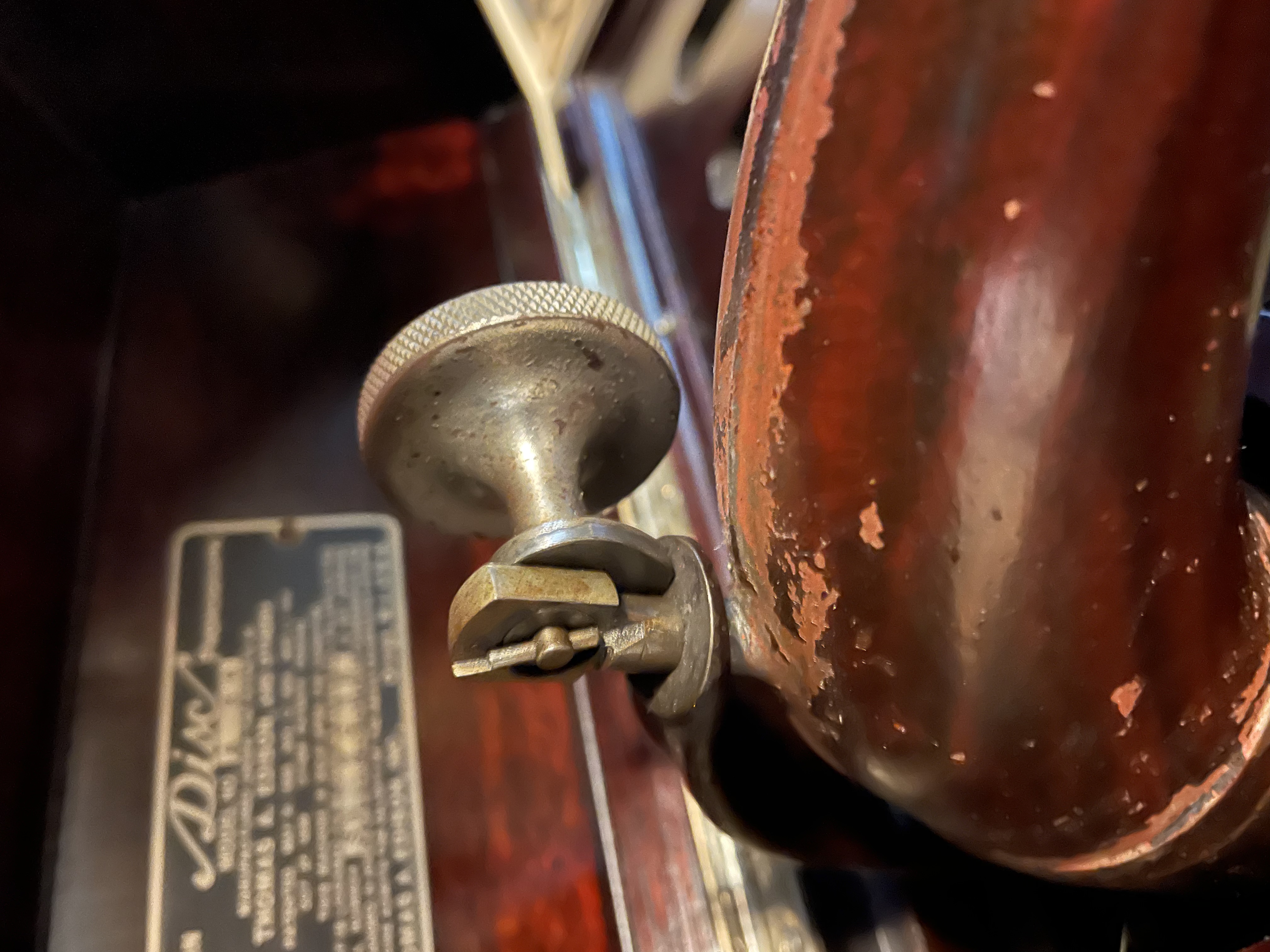 I am wondering what is going on with this reproducer lifting mechanism. I found the remains of a small thumb screw head which seems to have broken off. What is the purpose of that? The lock washer looks suspicious and in the photo I noted what looks like solder or JB Weld.