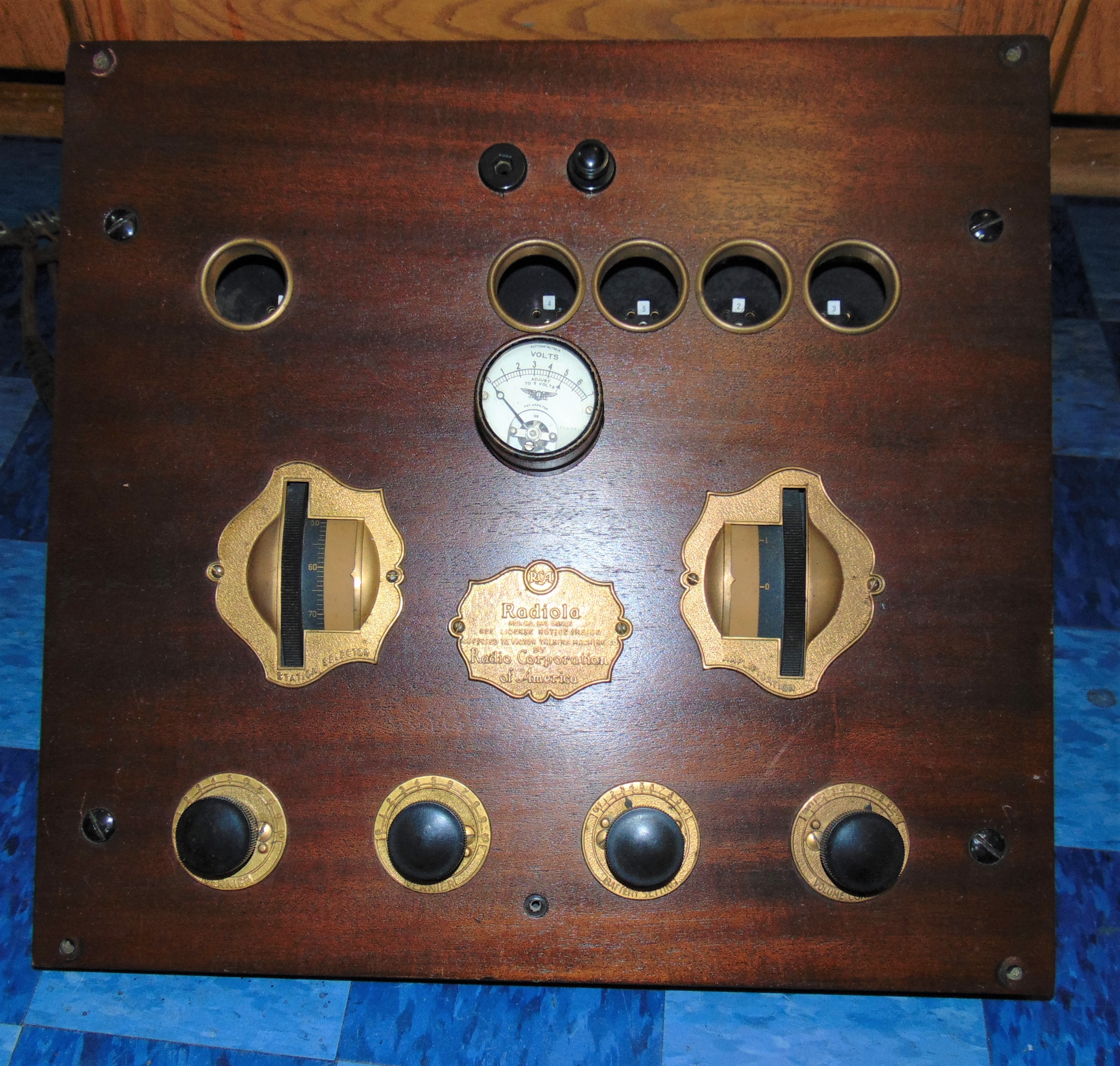This Radiola 20 came out of a 7-30 that I had 6-8 years ago but the legs were cut off and I never came up with a good example to put this in. Since then of course other things have come along and I wouldn't have room for one of those floor hogs so there's no point hanging on to this. I did have a friend of mine go through it and he did say that it worked well for him, but it was a real pain to tune a station in with and it also needs a very long wire antenna and it also needs to be grounded. I don't know what other Victrolas this might fit into, but the wood panel is 16" by 16 ¾". I do not have any tubes for it unfortunately and it didn't come with any. The guy that worked on it used his tubes to test it. There are guys on youtube that have posted videos on Radiola 20's and how to tune them and they seem to work ok once you figure that end of it out. RCA seemed to have sold a lot of them, but they are fairly early and I'm sure are quirky like a lot of those old radios are.