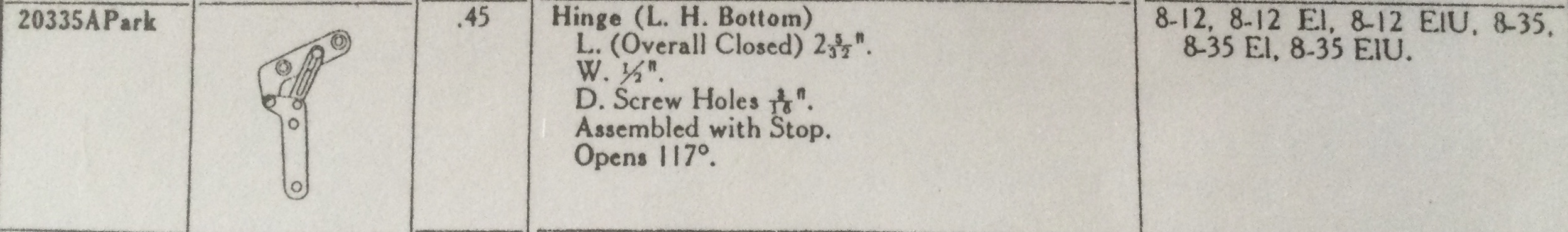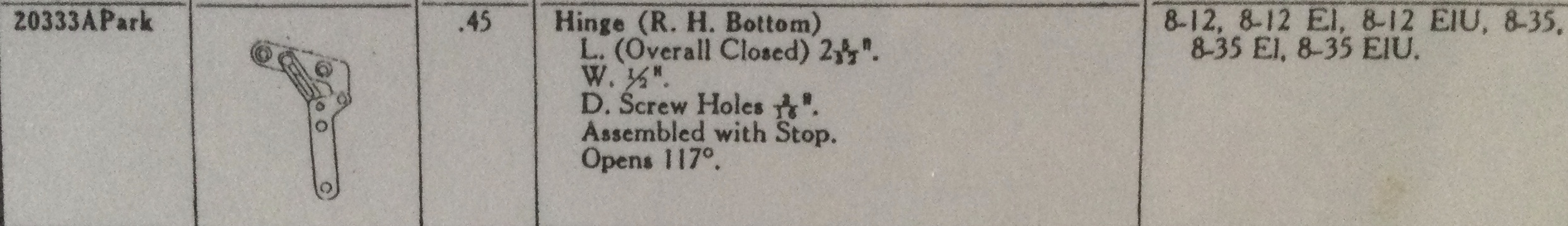 Unfortunately those hinge stops are often broken. Here are the dimensions of the bottom door hinges, they may help us determine if orphans in our parts drawers are what you need. They were used only on the 8-35 and 8-12.