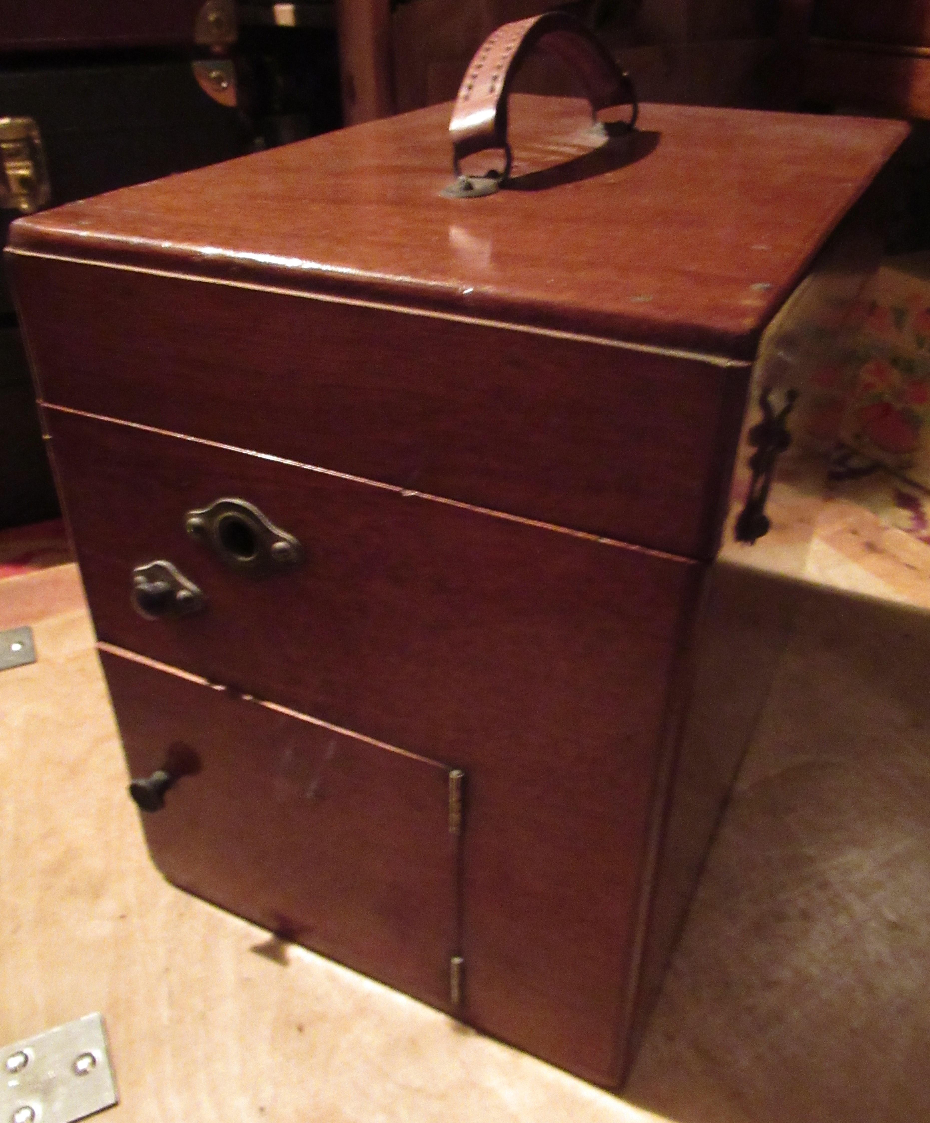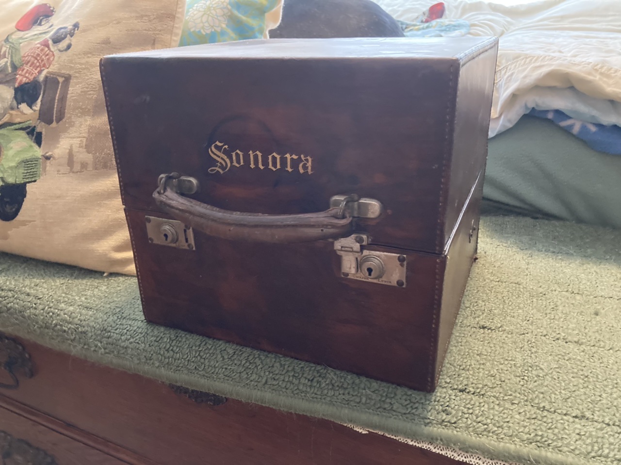 Early Sonora and Decca portables with reflective horns are often called “Trench Phonographs”. I doubt that many were actually in the trenches. My Sonora has a calf skin covering and a wood horn.