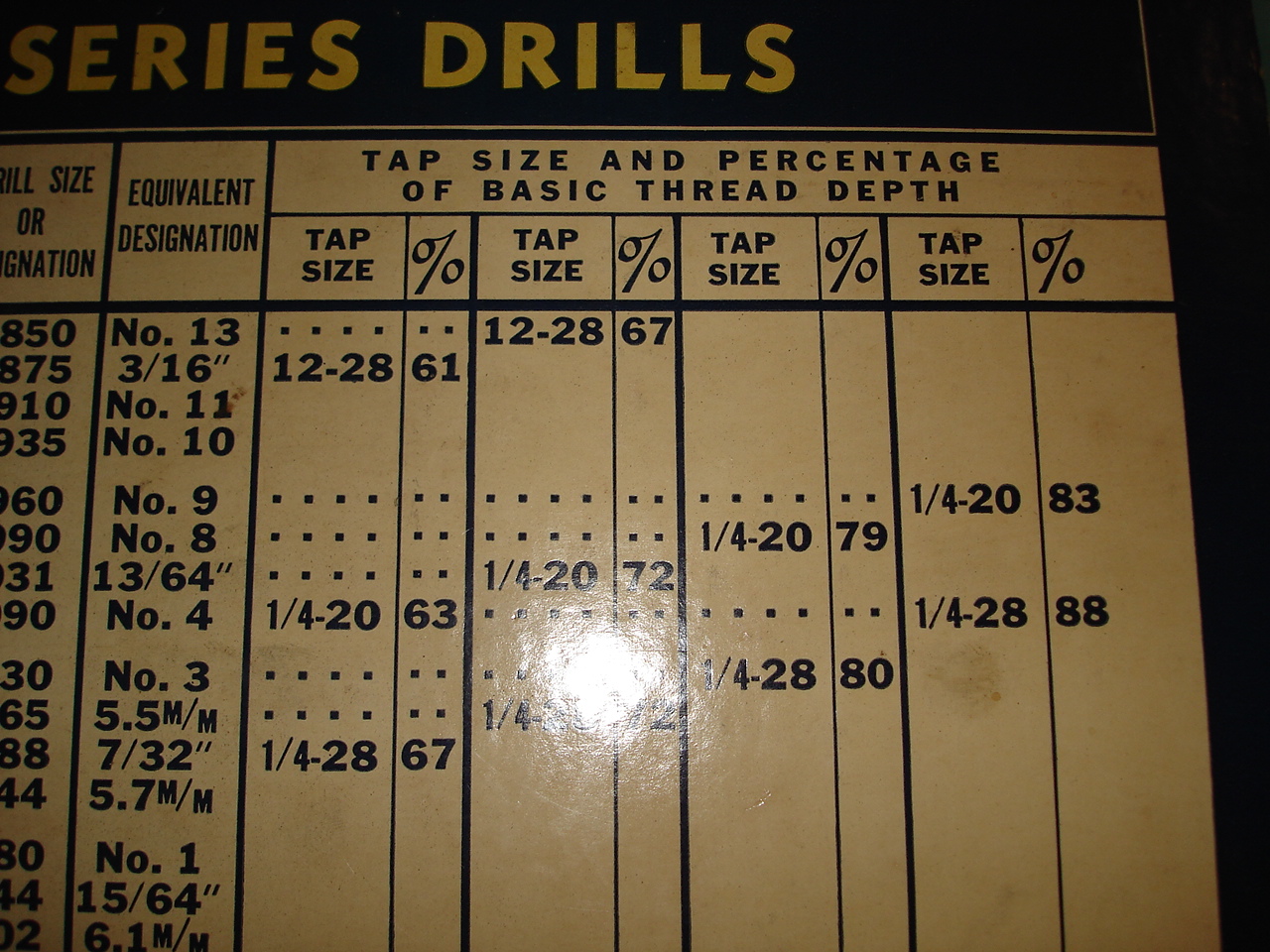 I love those charts. Have them hanging all around my shop. My favorite shows optional tap drill sizes for any given thread, along with a percentage of thread engagement resulting from each drill size. Good to know, when tapping very tough material where full thread engagement may end up with a broken tap.