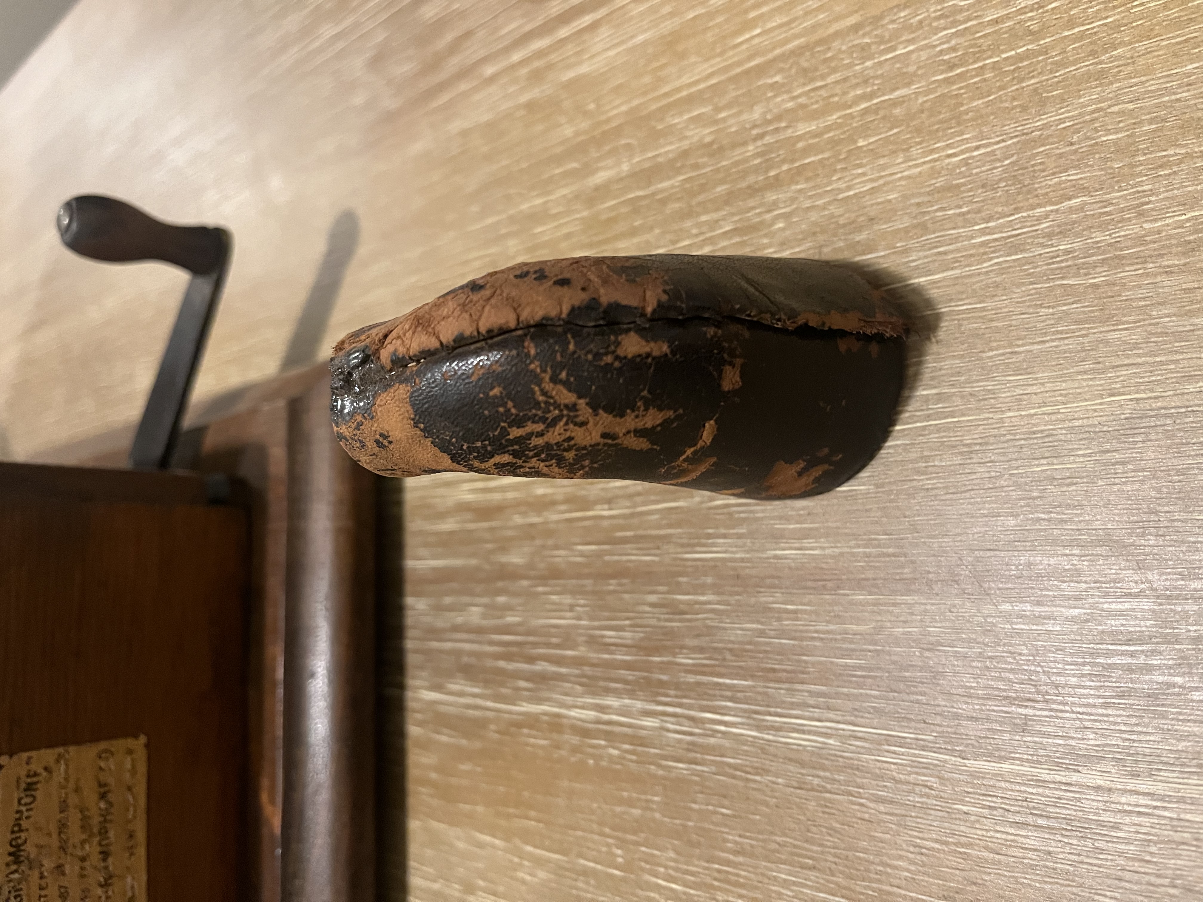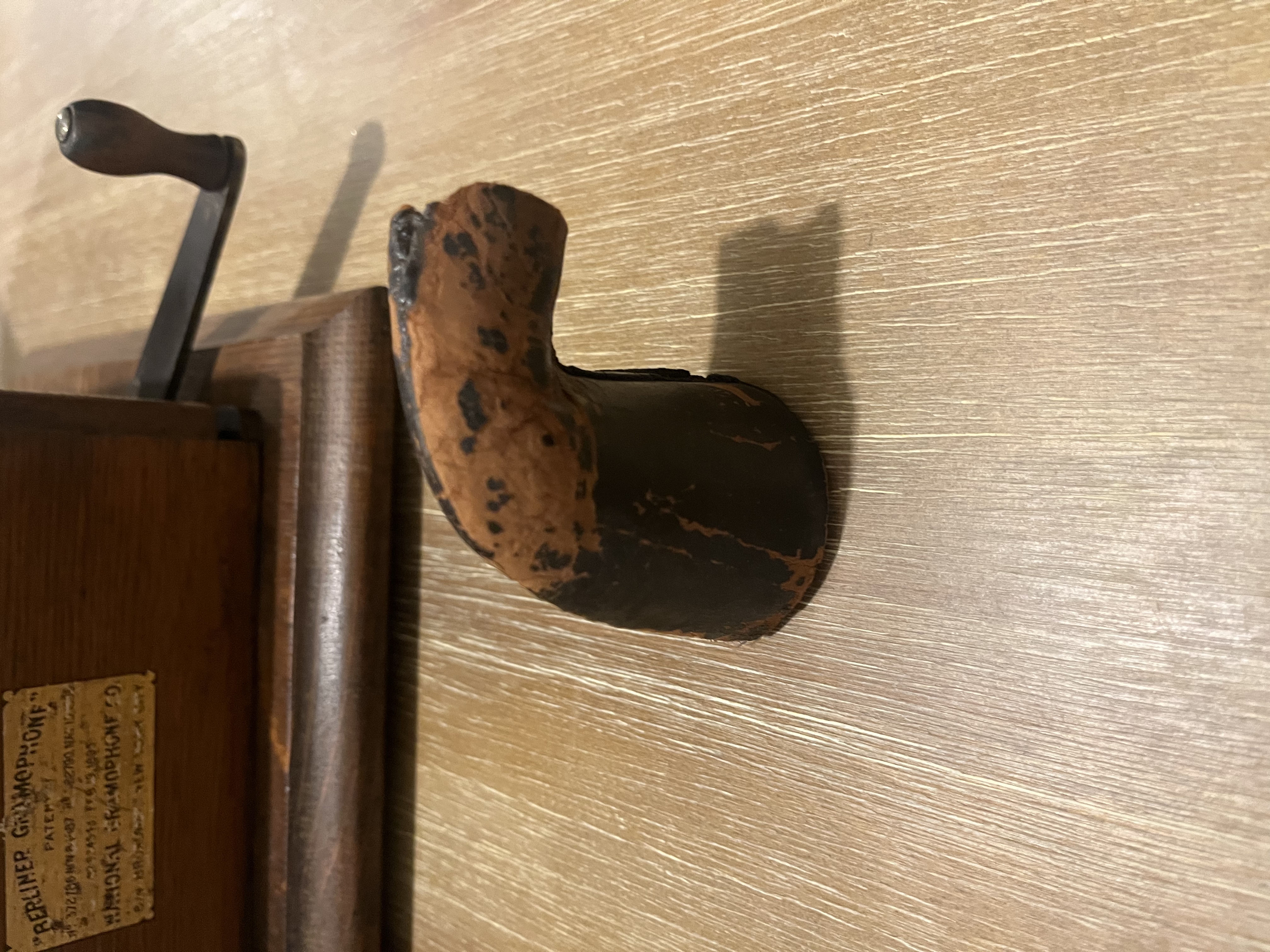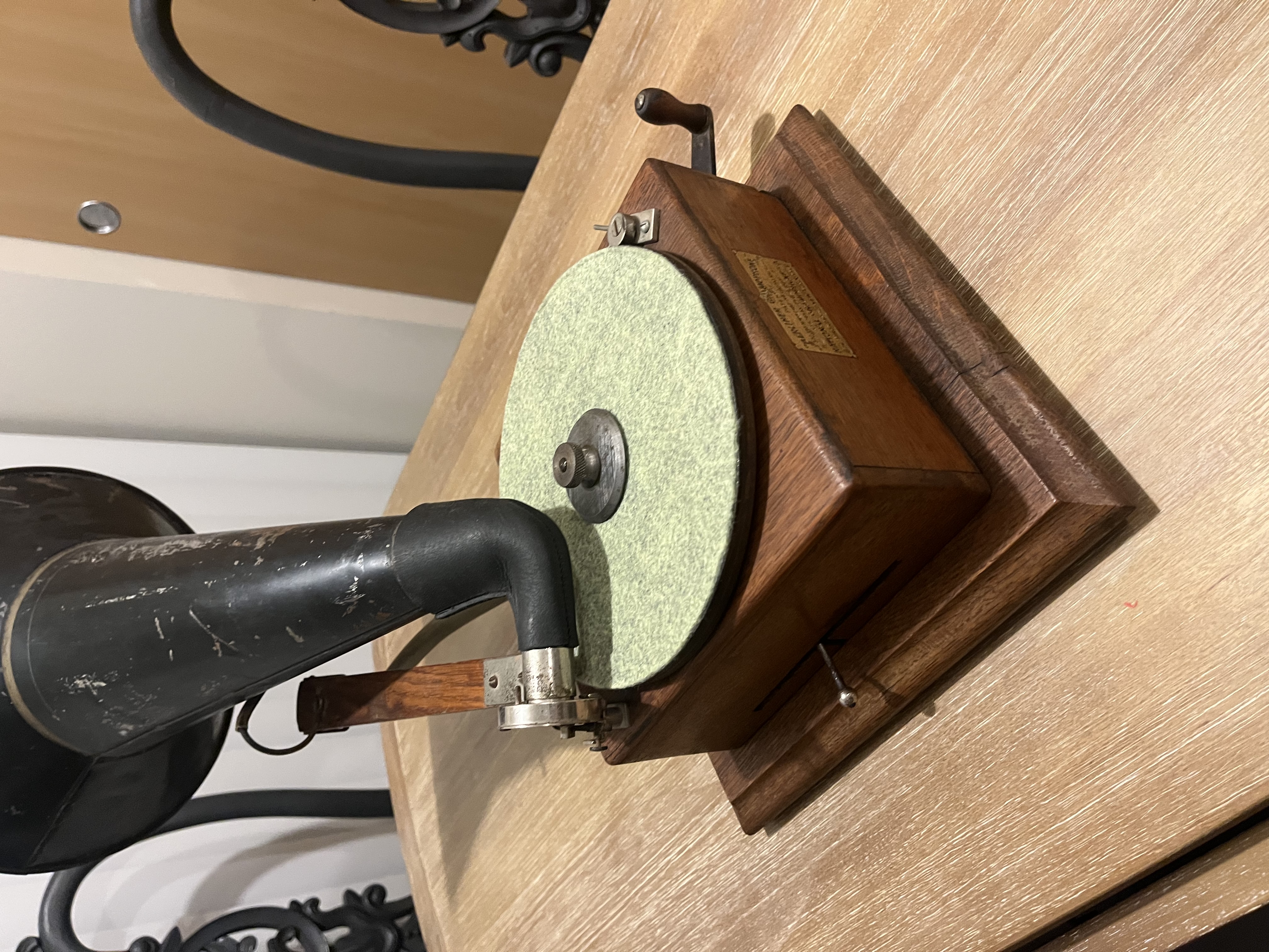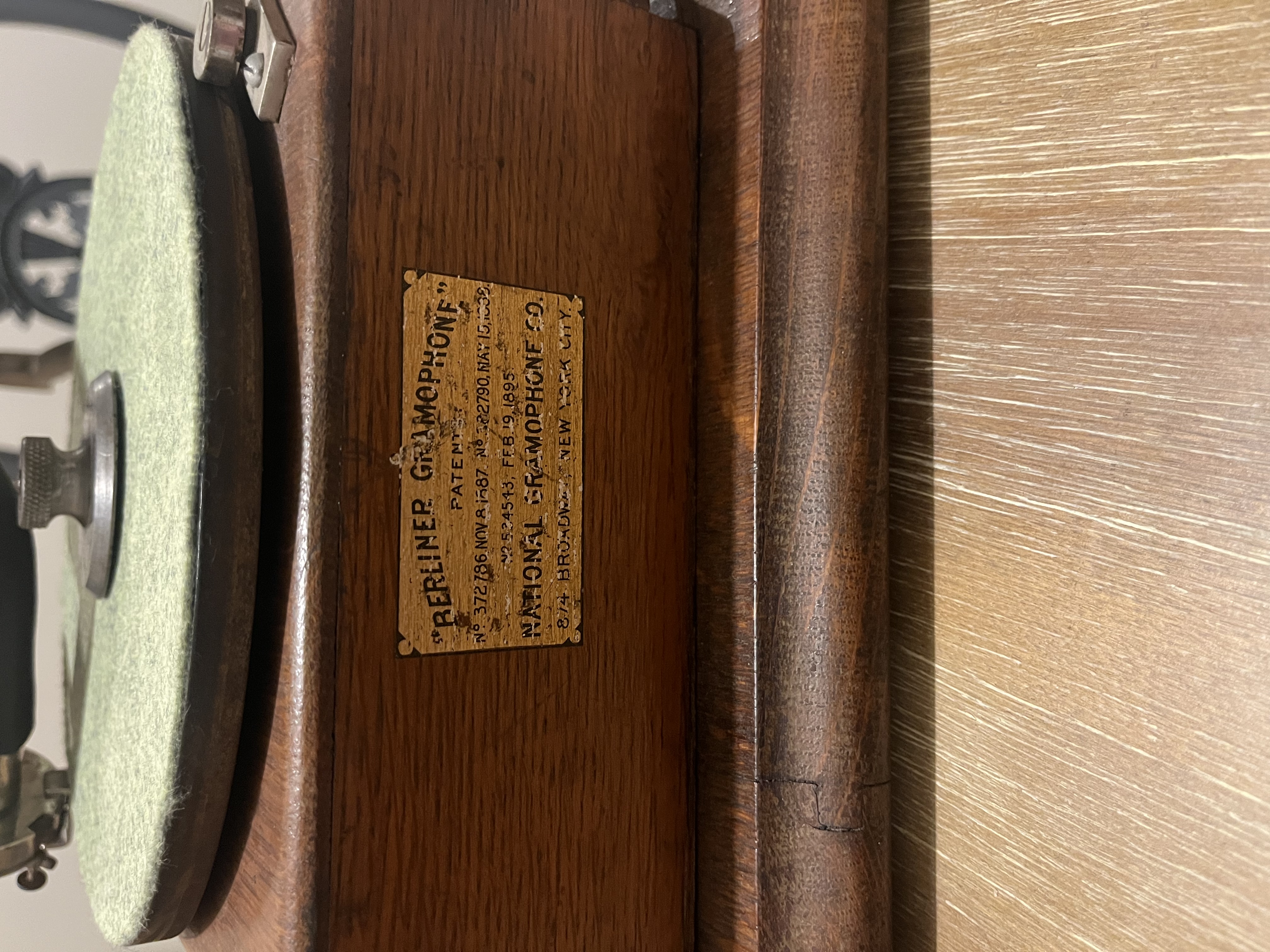 For sale is a Berliner ratchet wind in fantastic condition. It is all original besides the felt. It has a brand new fiber gear installed. The motor runs clean and smooth. Comes with the records show . Some are originals and some are reproductions. Has the Original leather elbow which is fragile and a newer leather one that I use when playing it. Please contact me with any interest. $8900