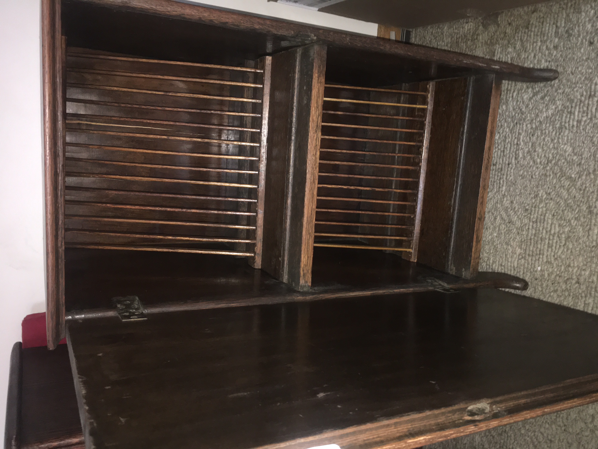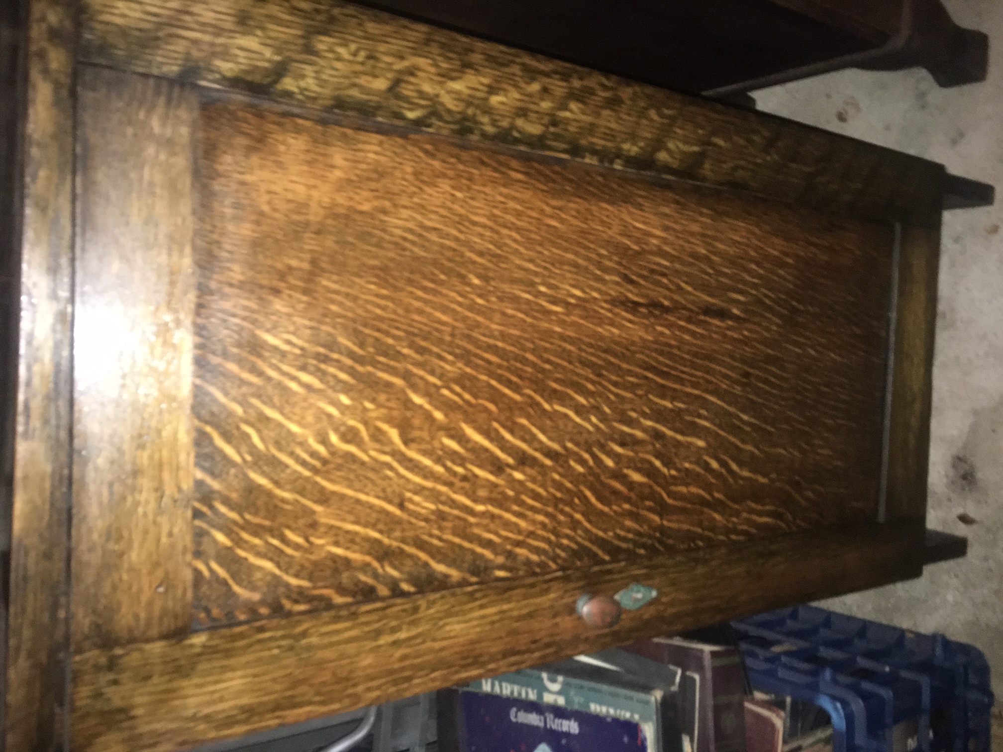 -Early Oak Disk Record Cabinet. Single door with decorative applique. Original interior records not included. 18w x 15 D x 36T I think it would look great with a Victor M on it. $250