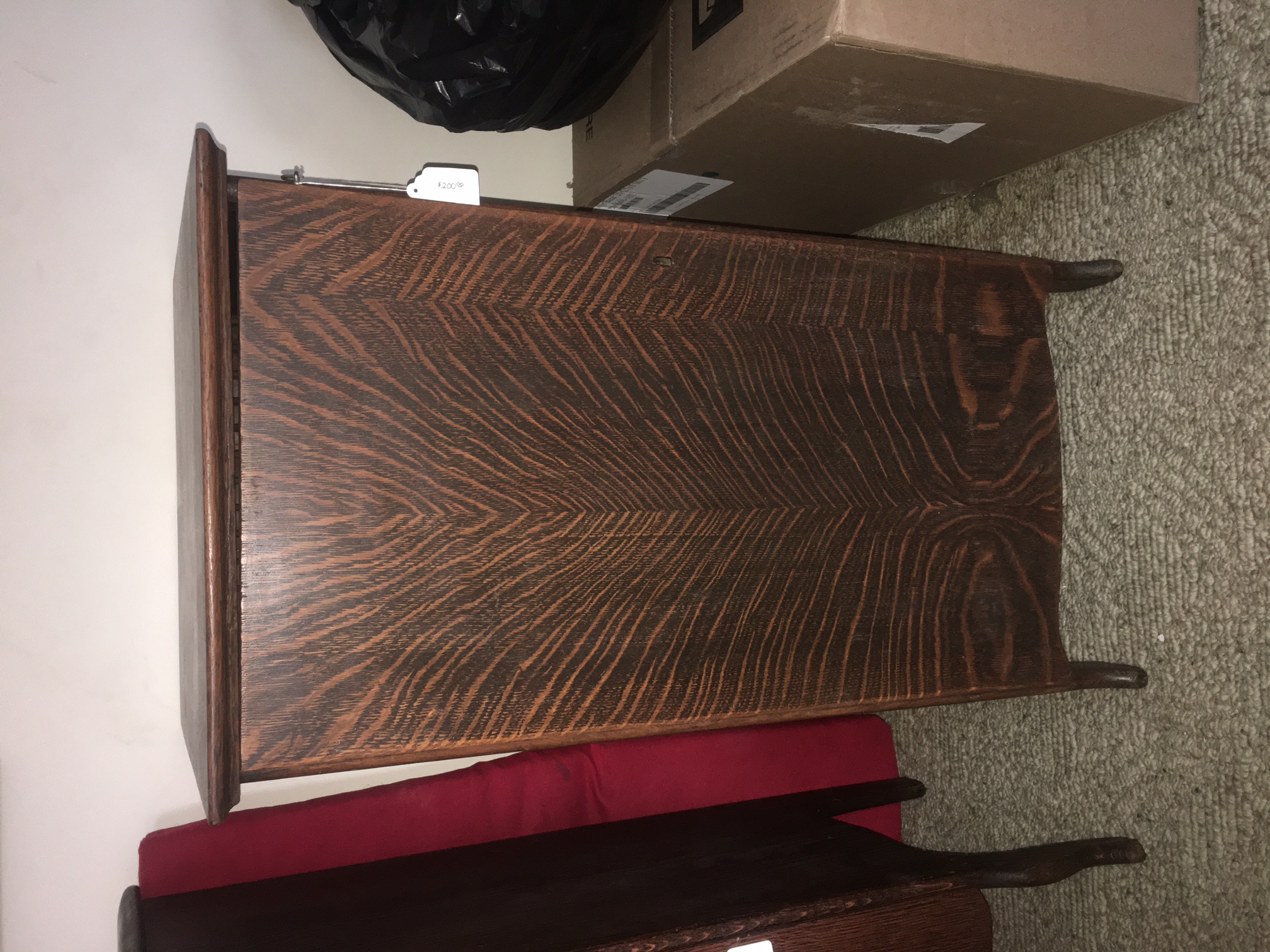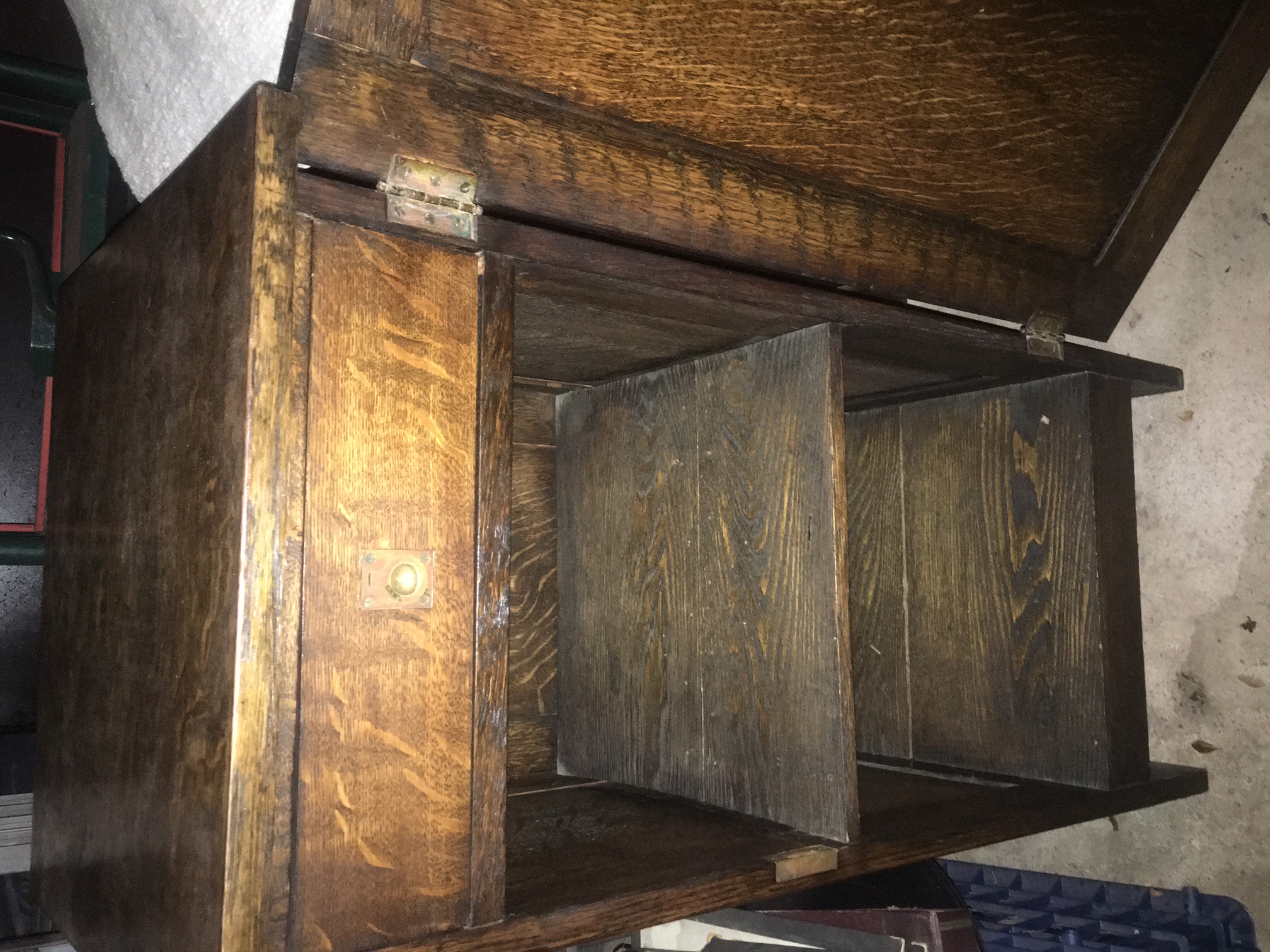 -Single door, 18 x18 top 34” tall. Has one shelf and an internal drawer. Quarter sawn on all four sides. It looks like it may be English. $100