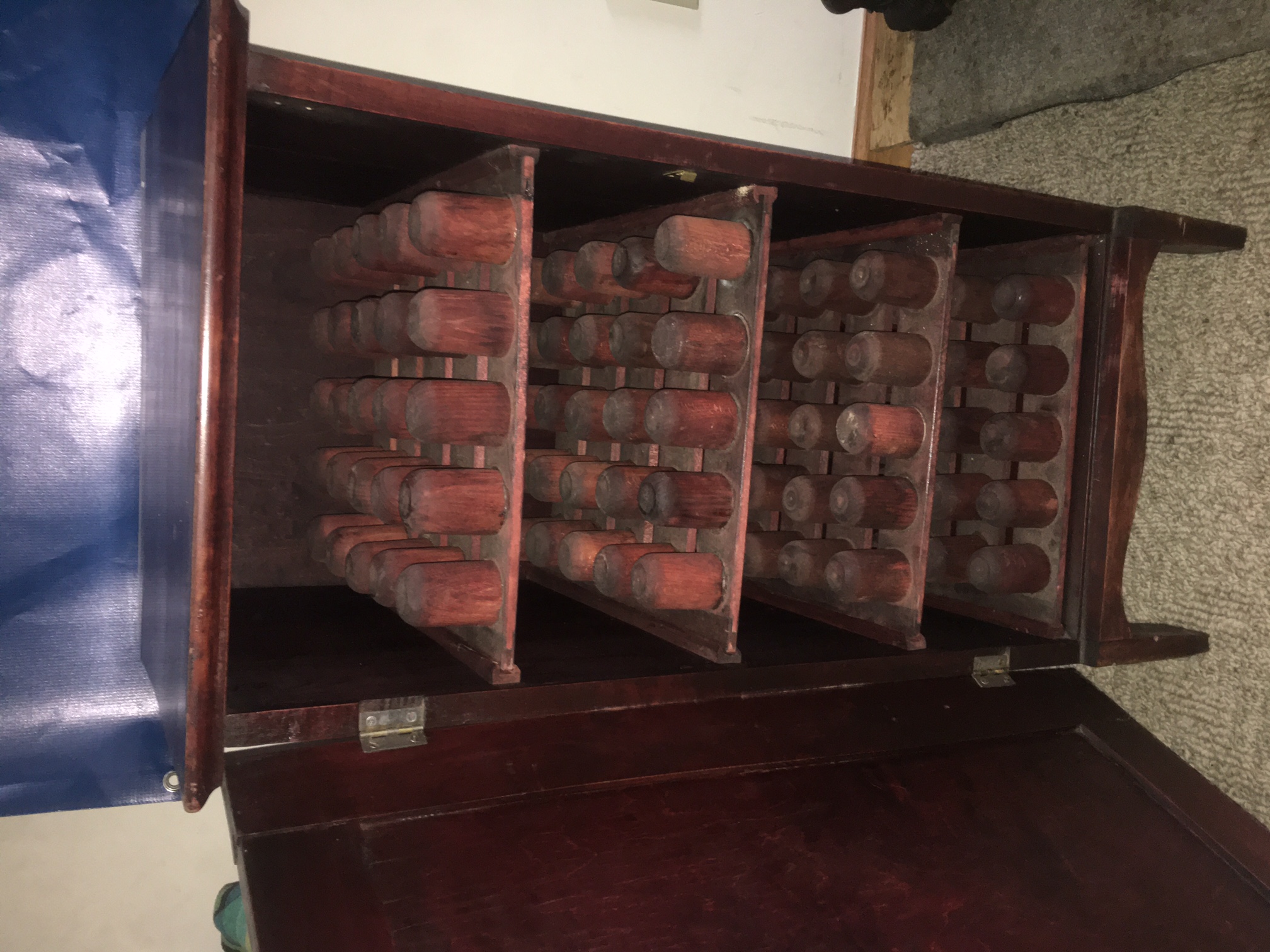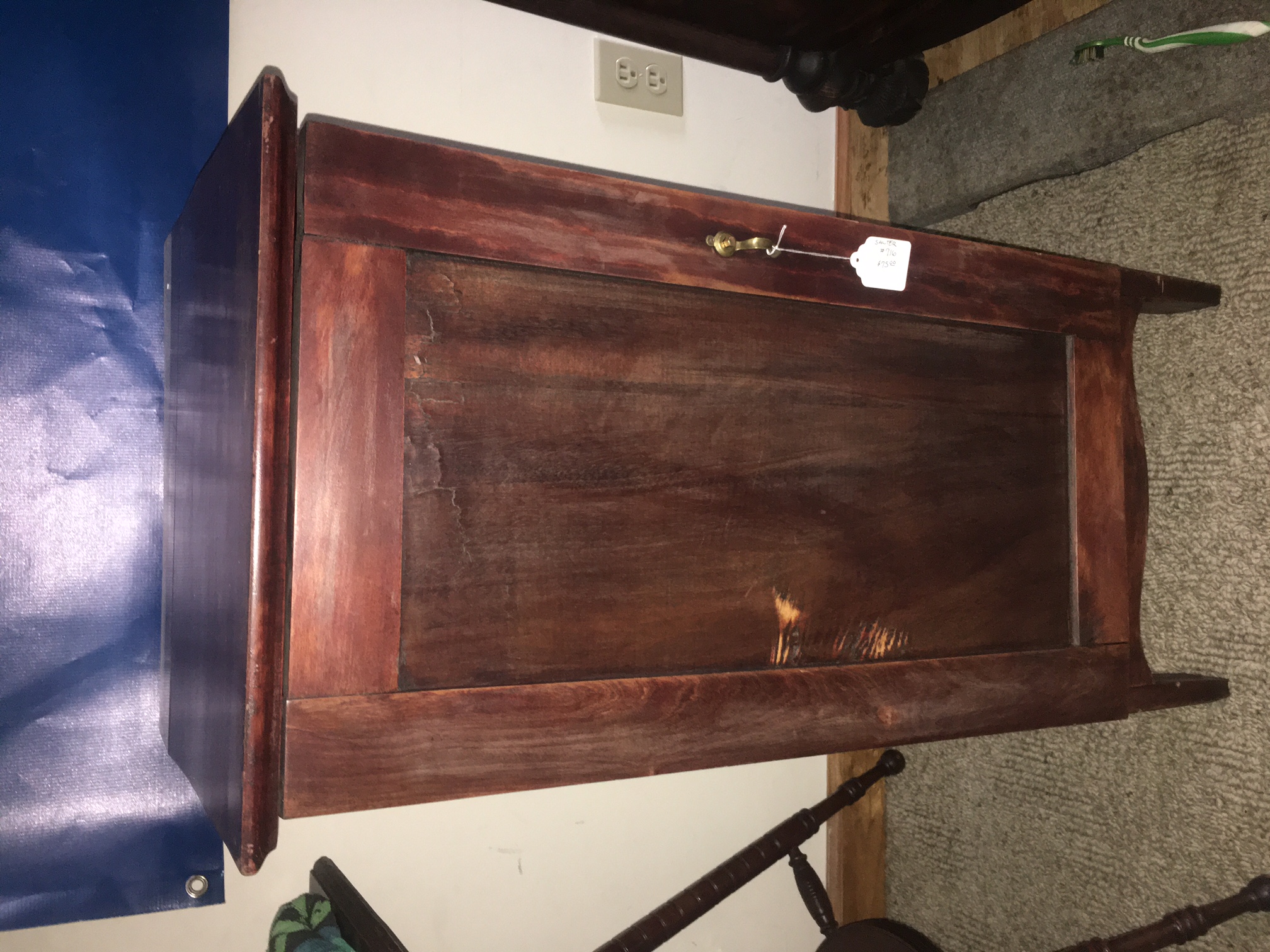 -Mahogany Single door Cylinder Cabinet. Look like a Salter. There is very solid repair to one of the slides. Wooden pegs. Top is 17” x 17” x34 tall. $75