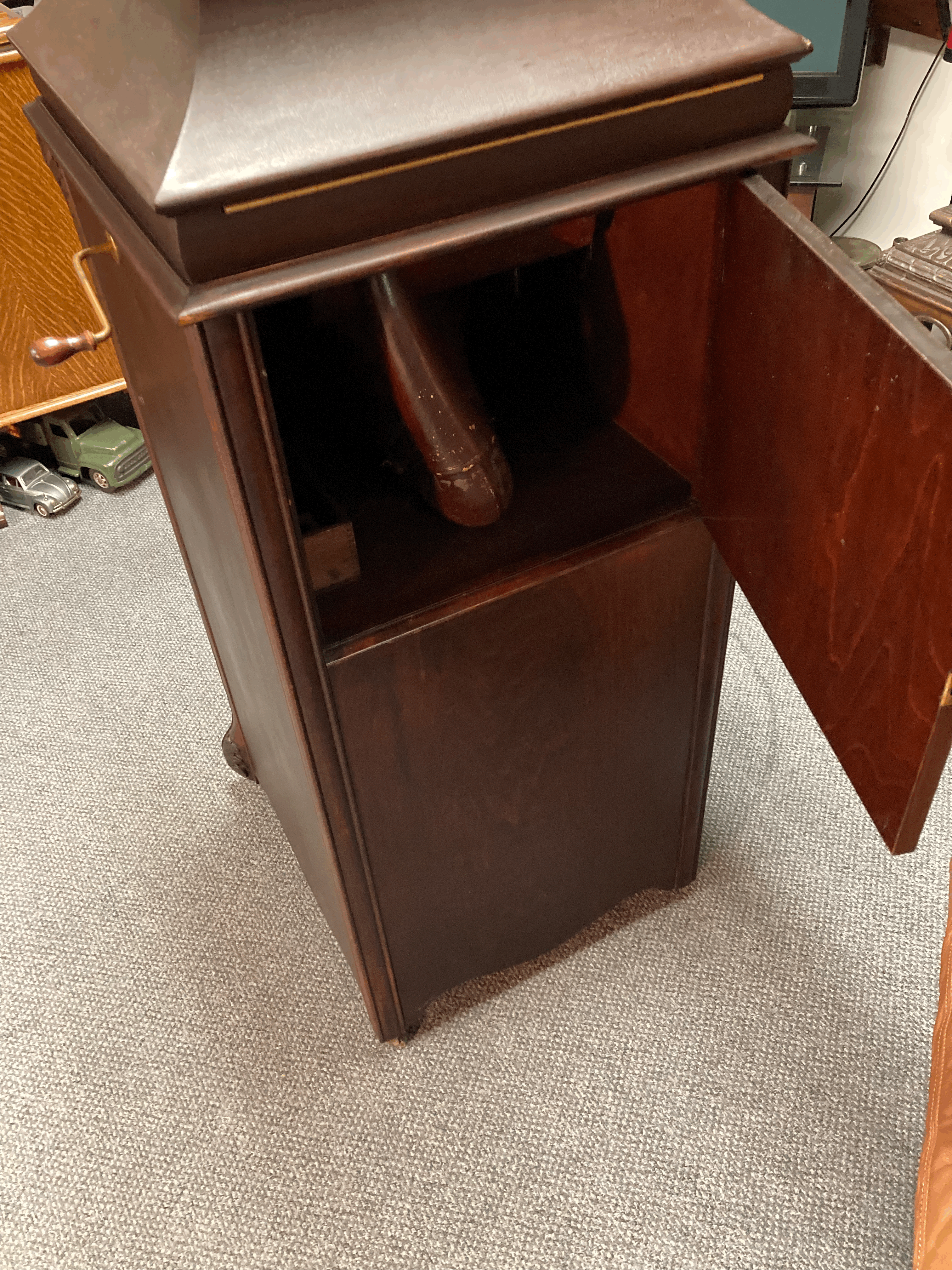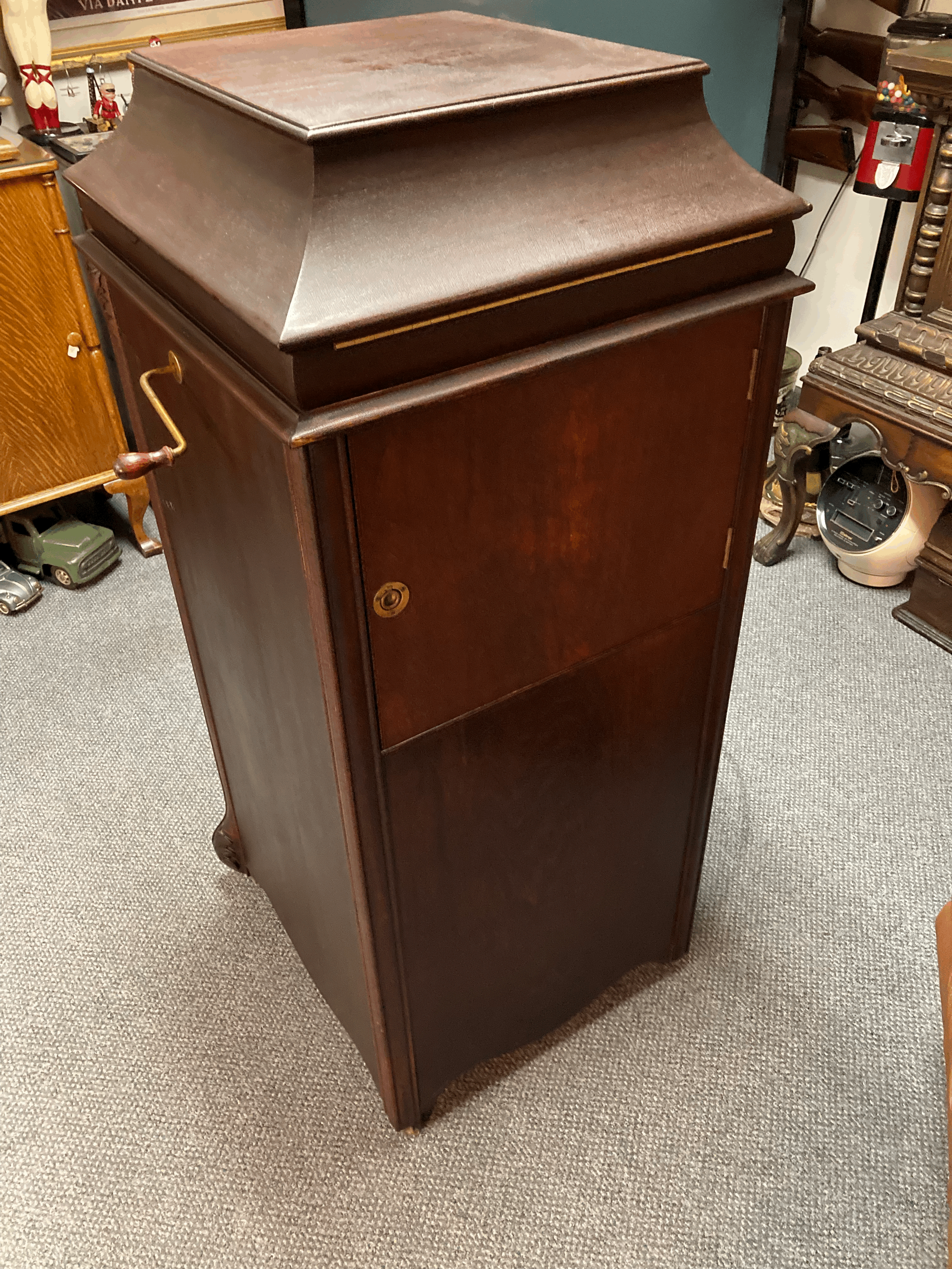 I am selling a very nice mahogany Edison Amberola 1-B. It plays very nicely. The finish on the mechanism and cabinet are original. When purchased it was missing the cylinder clips. I replaced with "egg crate" type dividers similar to ones found in the very early Amberola 1-A. It is missing the slide adjuster for the auto stop. This is a matching number Amberola where the serial number in the ID tag matches the serial number on the mechanism.