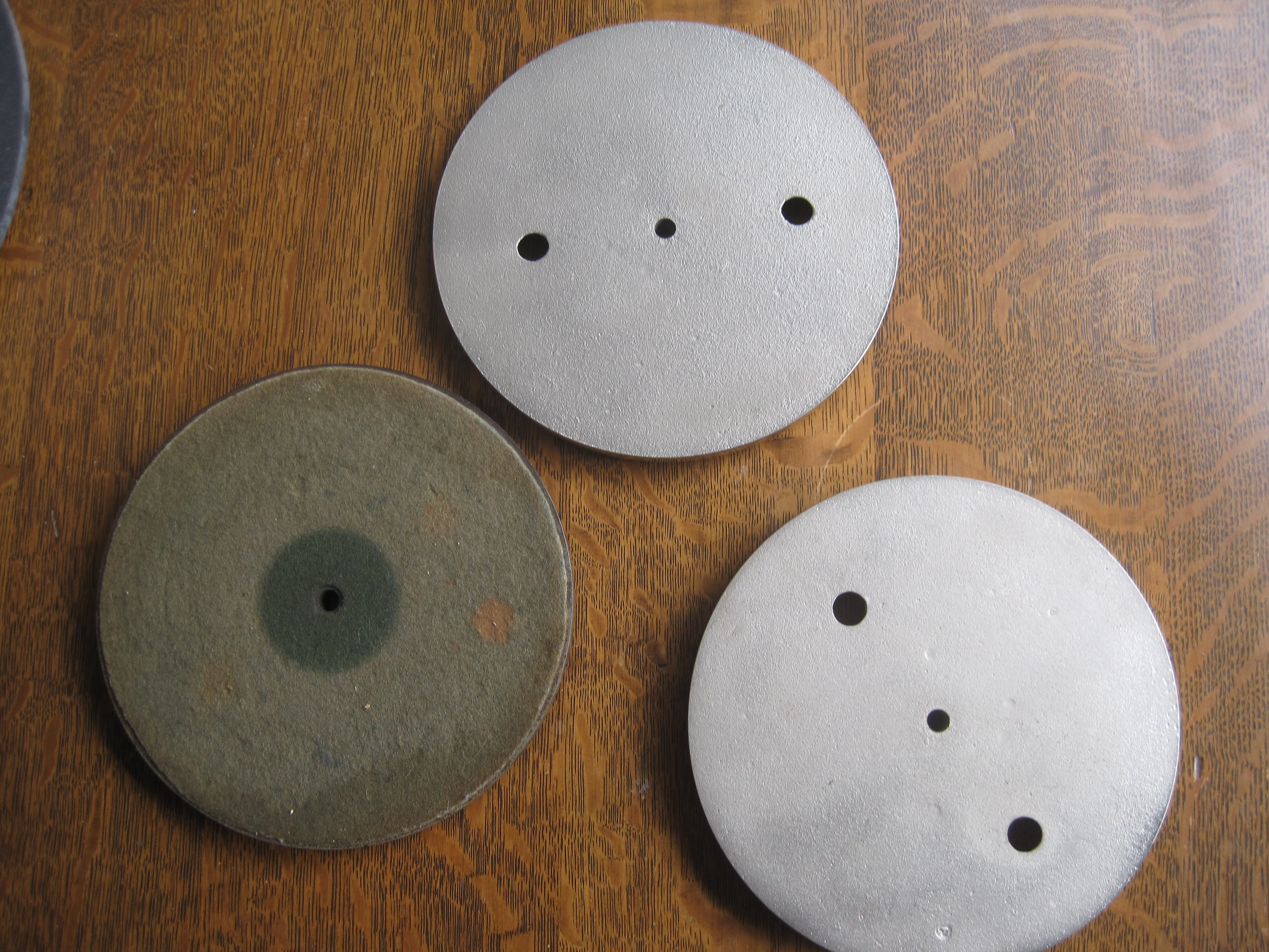 Offered up three that I had available. Have one left. In the photos it is the one at the top. This turn table came off a Victor C. With no felt, rusty no nickel plating left was sent to the plater with instructions to only polish the rim and bead blast everything else. This was not followed as they tried to polish the back side and for unknown reasons decided to grind on the boss. Spindle hole is 5/16 and the slot width is for a 3/32 drive pin. Works as intended. Price is 60.00 plus shipping