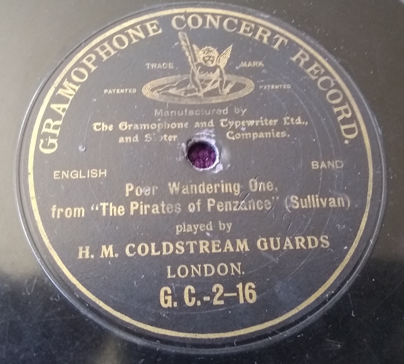 Here is a record from The Gramophone and Typewriter Company, with what was later to become the image for Angel classical records. It is the H.M. Coldstream Guards band playing a selection from Gilbert and Sullivan's The Pirates of Penzance, Poor Wandering One.
