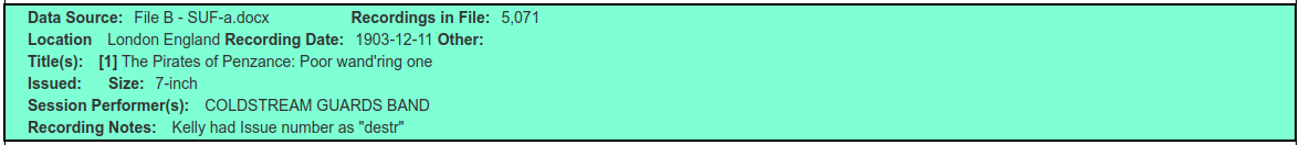 The single hit I got was by entering "Coldstream Guards" into the Artist field and "Penzance" into the Title field. This search produced a record for a 7" disk, same artist and same tune, rather than for the 10" one I was seeking.. A search with "Poor Wandering One" rather than "Penzance" produced nothing.