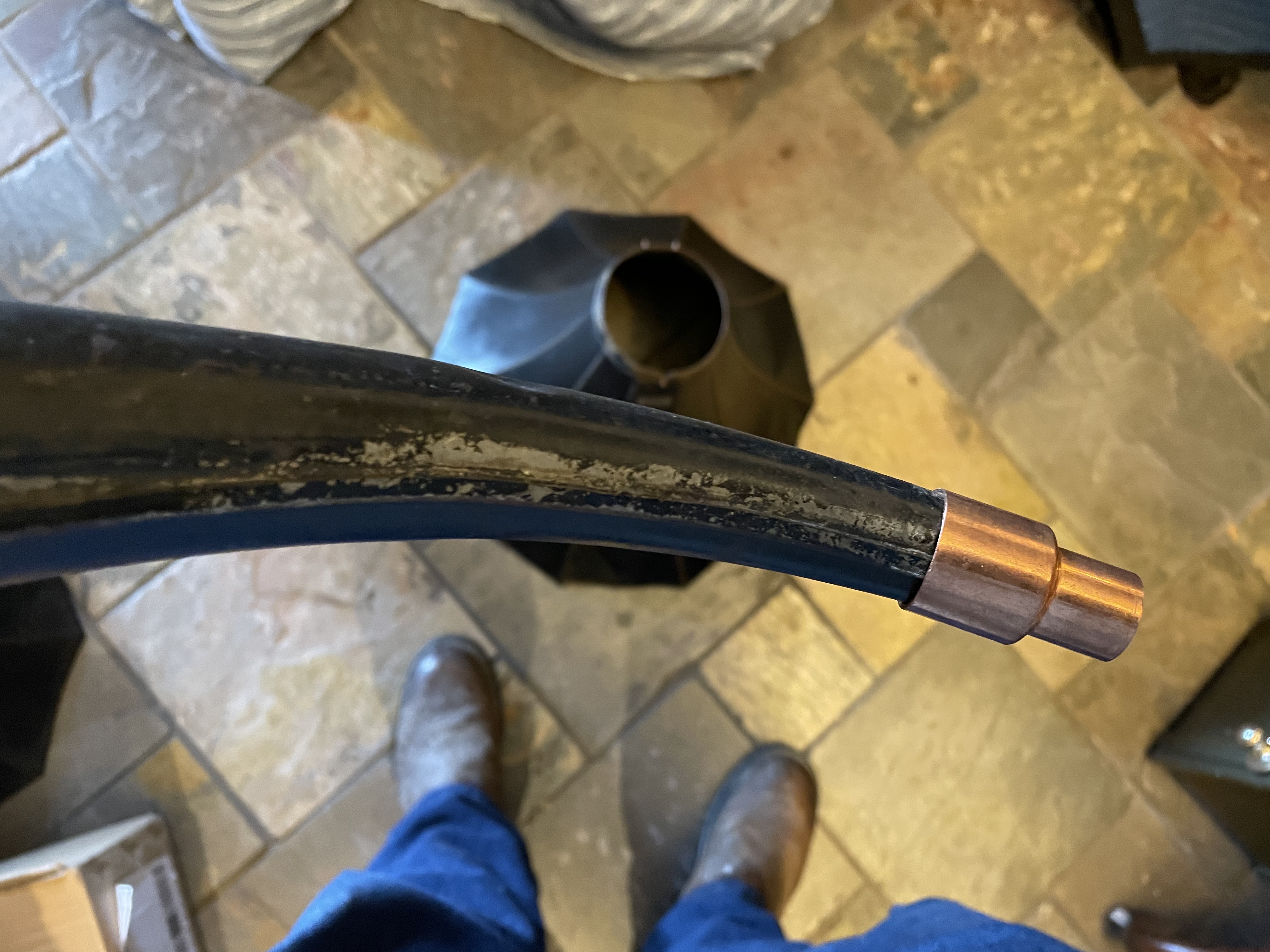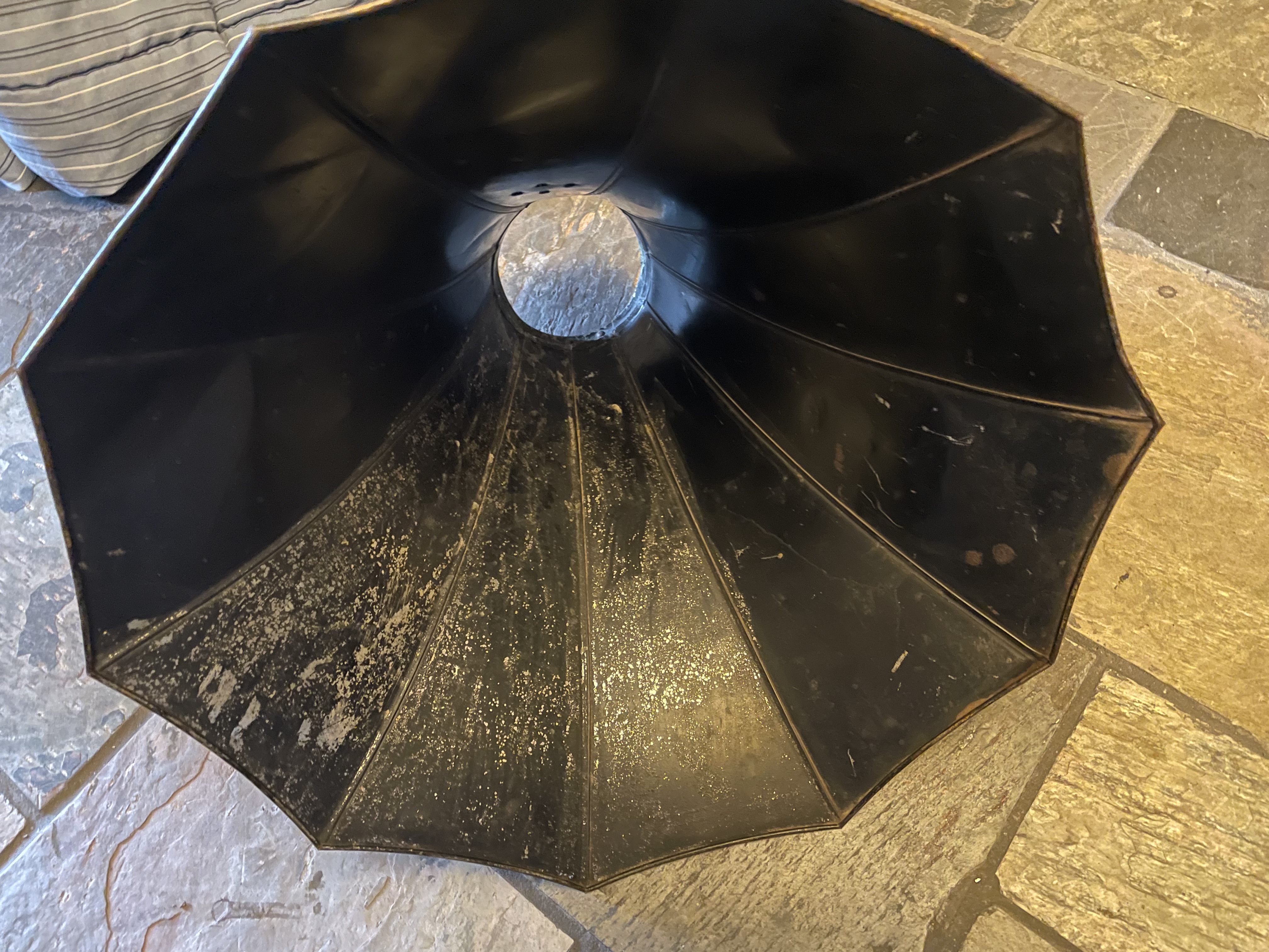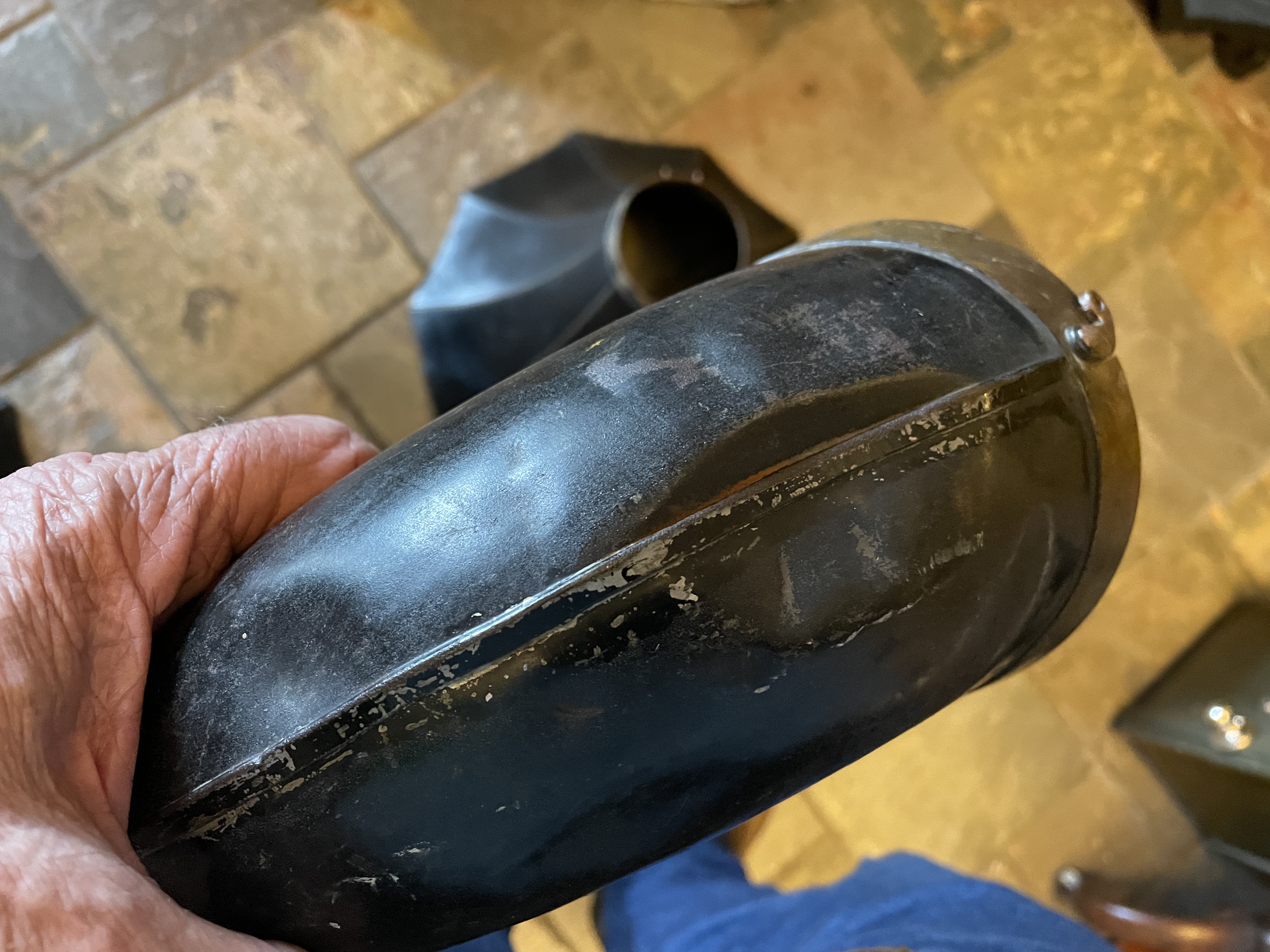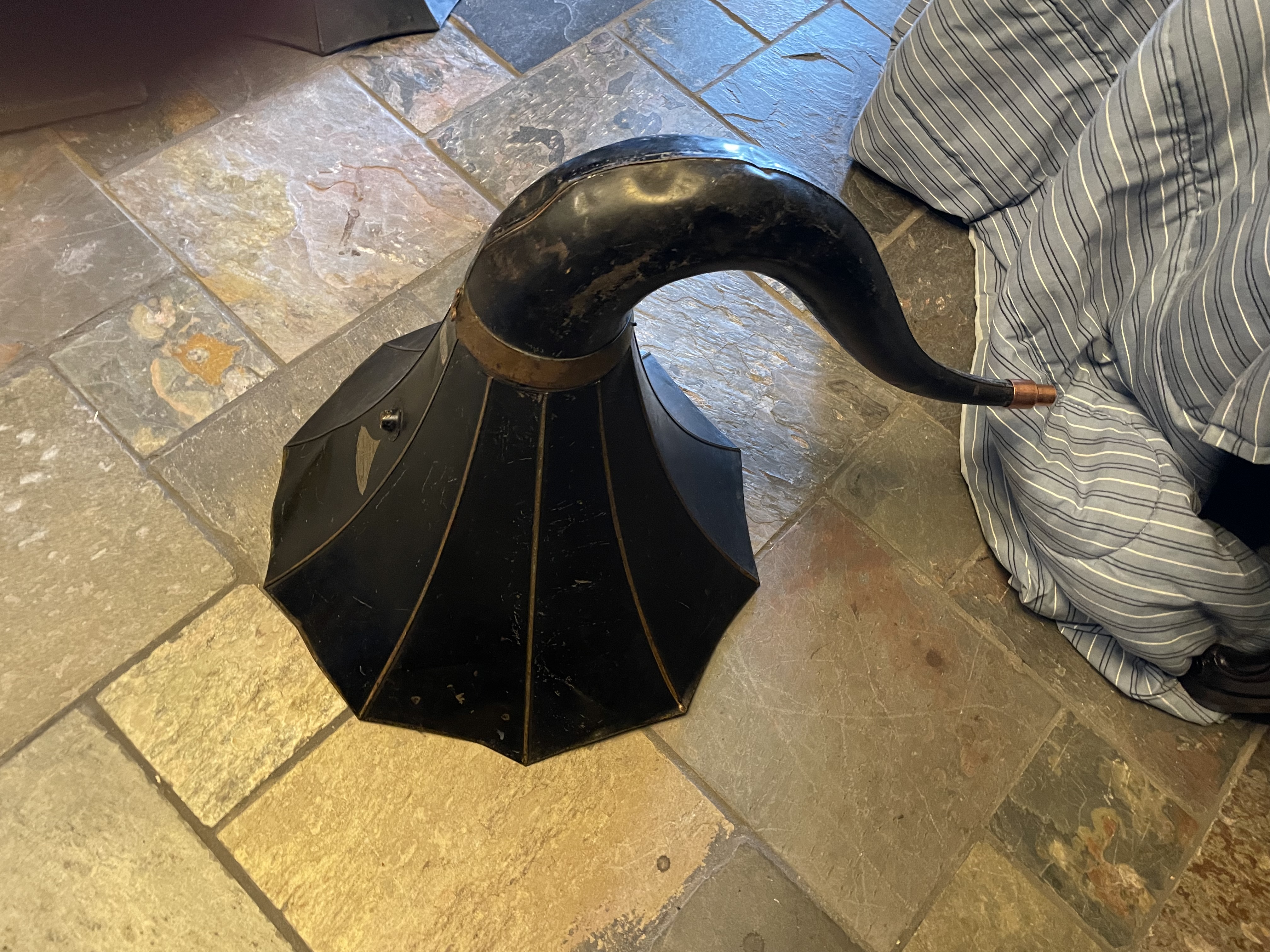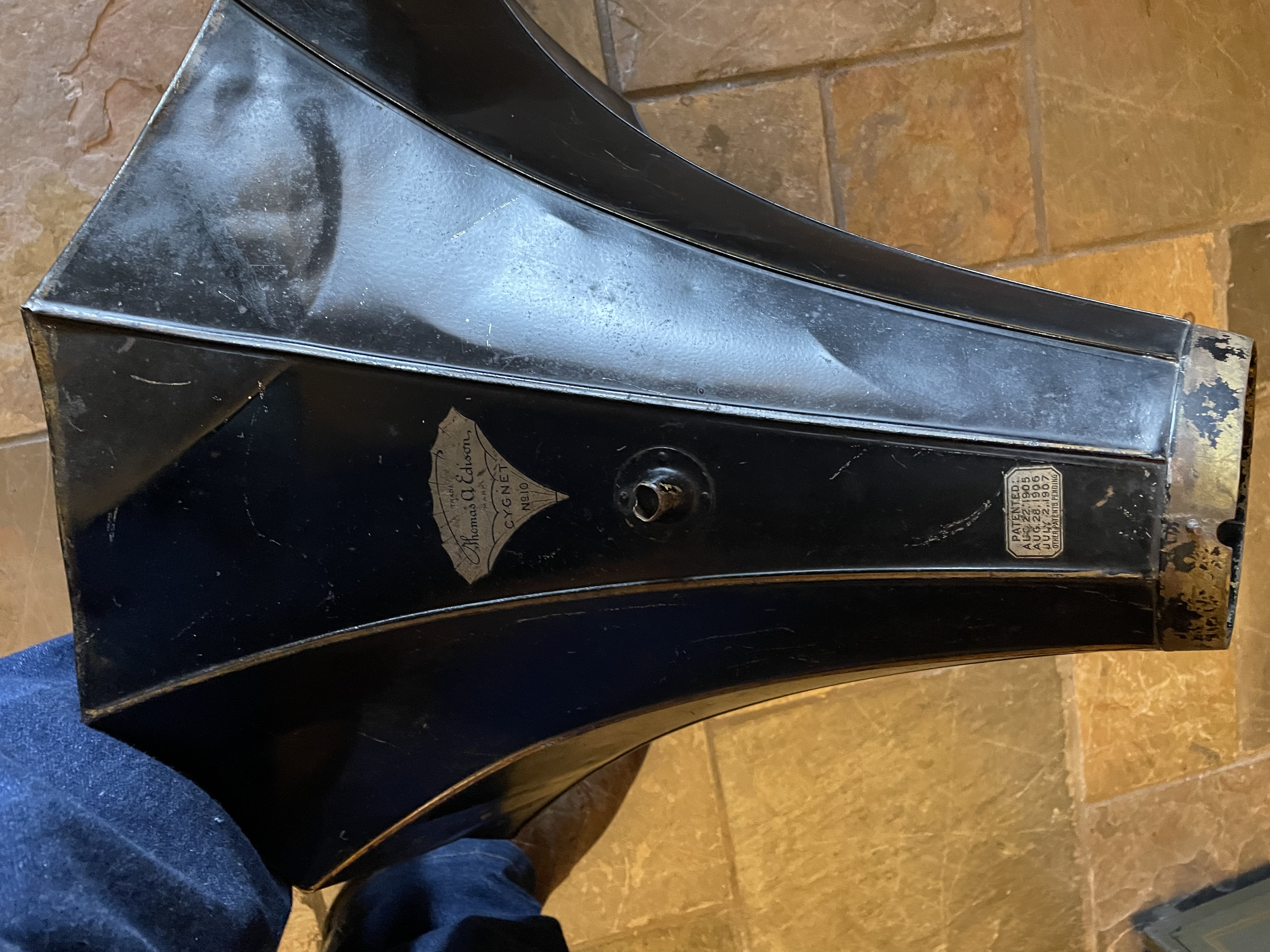 So here is the story which i hope the pictures tell There is paint loss on the inside of the bell , it has some pretty good dents on the elbow and some bends on the bell. The half ball hanger connection is missing on the bell,(but i may have one to provide ), the small end is missing but has a new add on piece that is not attached. With the rubber connector on the horn you can not tell it is missing The last issue is that the small clip that holds elbow to the horn is missing the little knob. The good thing is that it is solid with no extra holes or rust issues I think that with a little effort , straightening and paint it could be a nice horn for the price of the elbow
