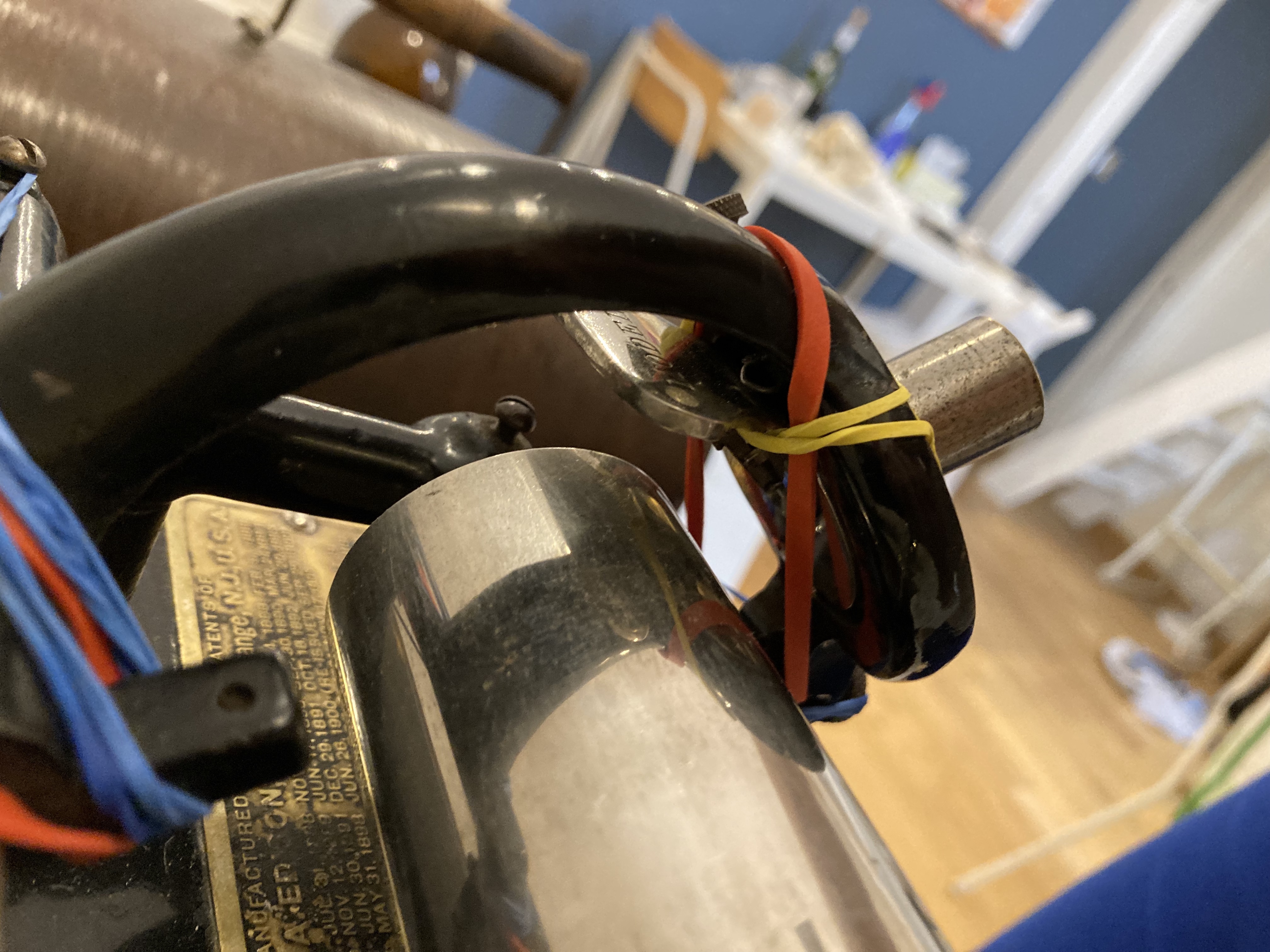 Finally, I'll wind the spring motor to wake it up. At first I'll start with the carriage in an up position and give it a few cranks, maybe five, and let it run down and repeat. Each time I walk by the machine I'll increase the number of turns on the crank. You're soon develop a feel as you approach the completely wound spring motor. Just be patient and go slowly and you'll be fine.