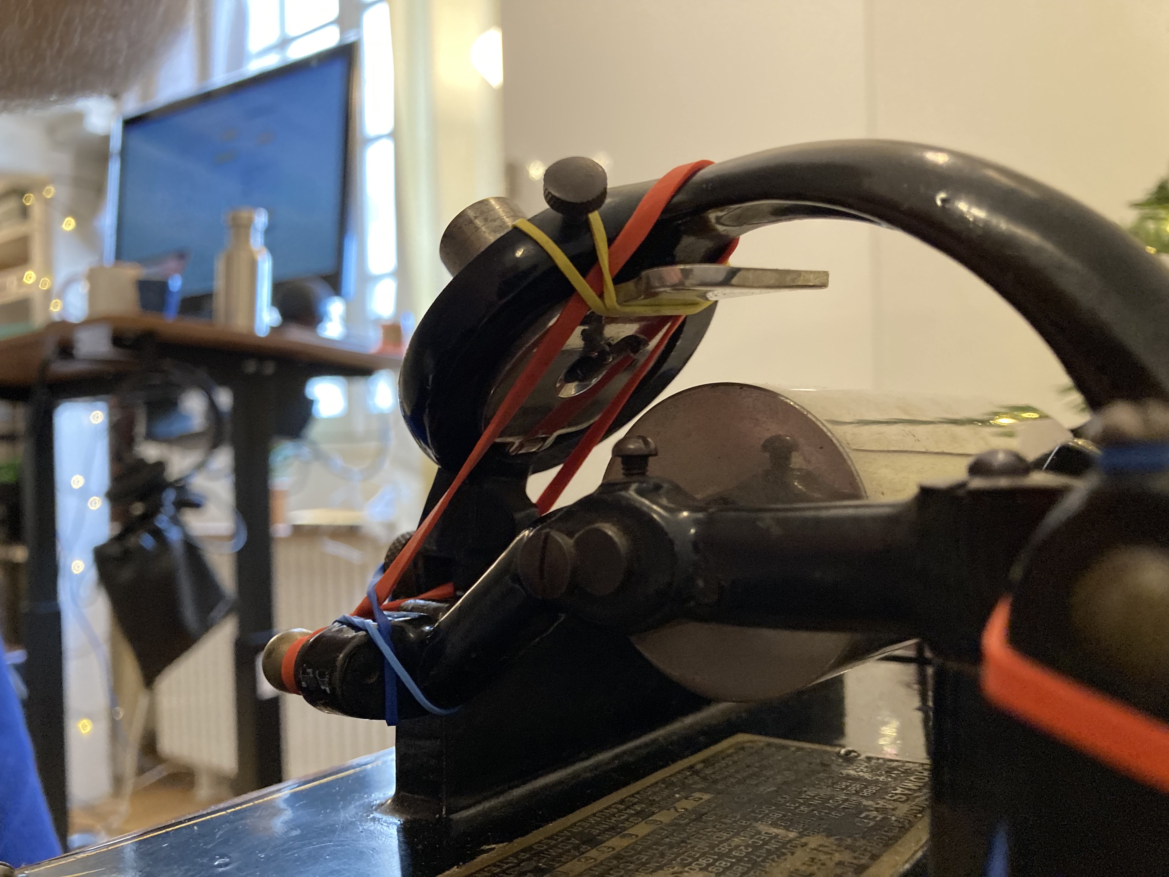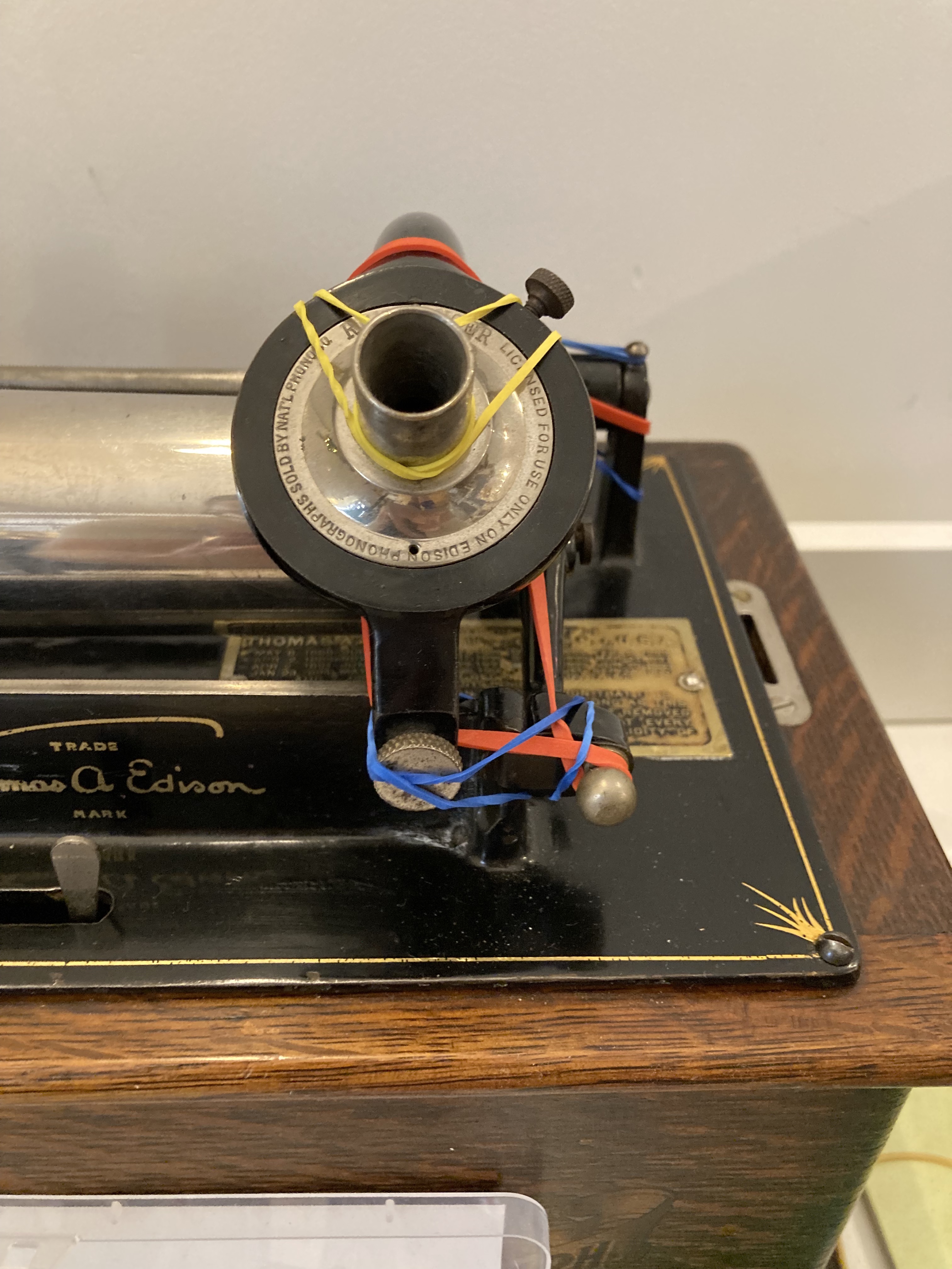 Ok, and one more question! I've been very strategic about rubber banding the reproducer in place (see attached photos). It once was digging into and damaging a 2-minute wax cylinder after a similar carry-on plane journey. After some adjusting and cleaning dust off the stylus, it played like normal. Although I'm not sure that's what fixed it... maybe the crank wasn't wound enough? What usually causes the stylus to dig into a wax cylinder (if I've already confirmed that the cylinder is the correct size for the machine).