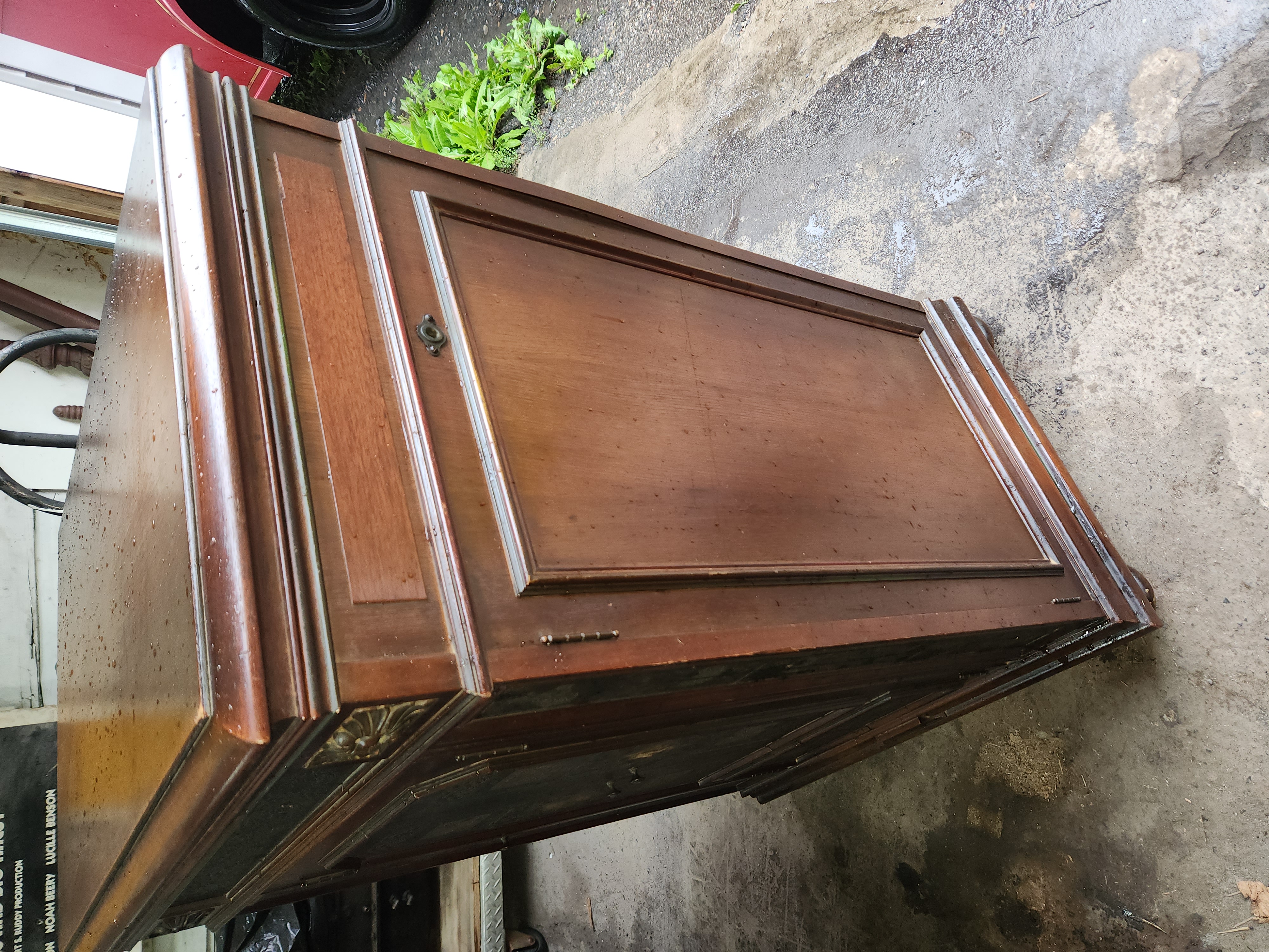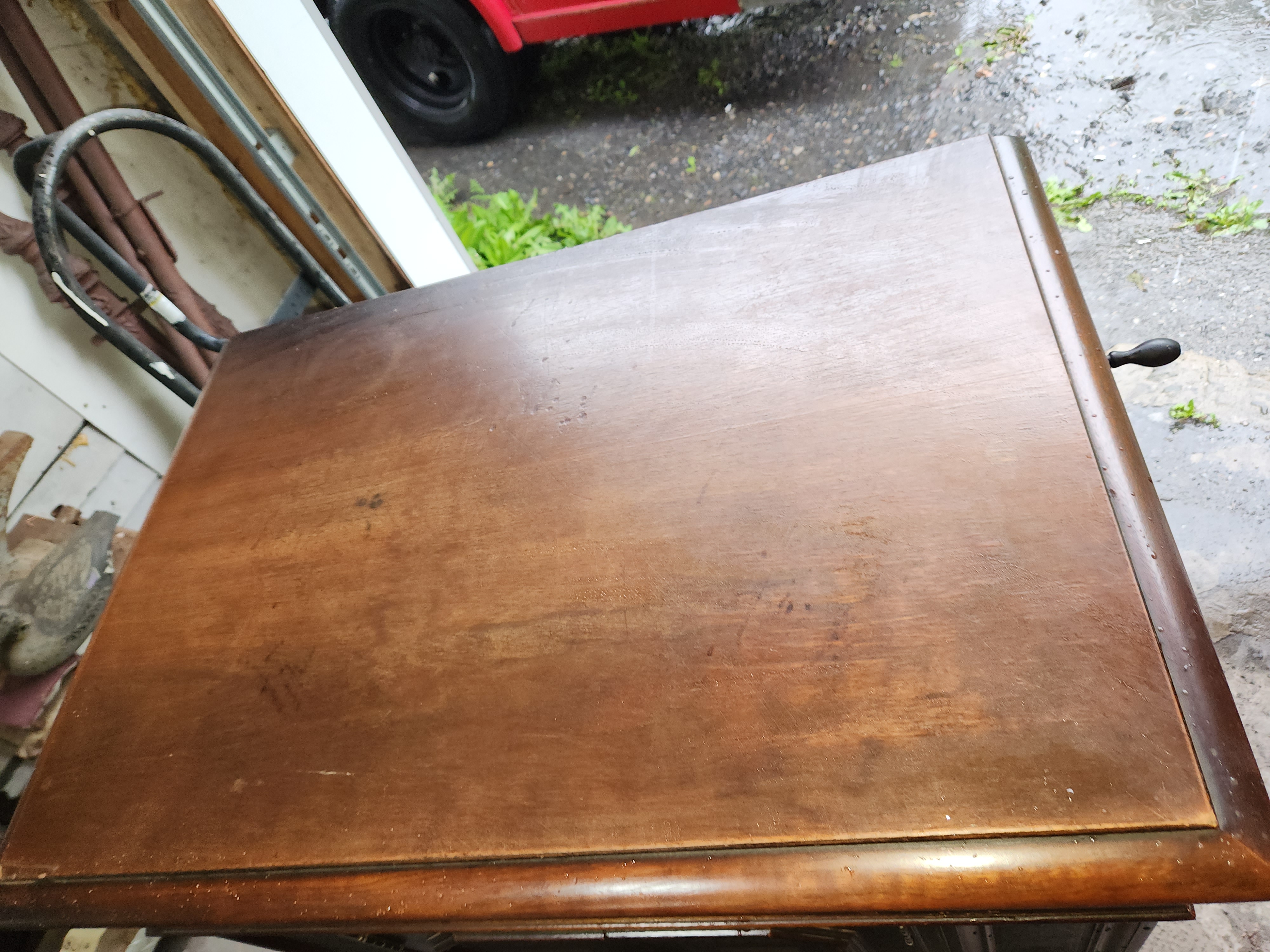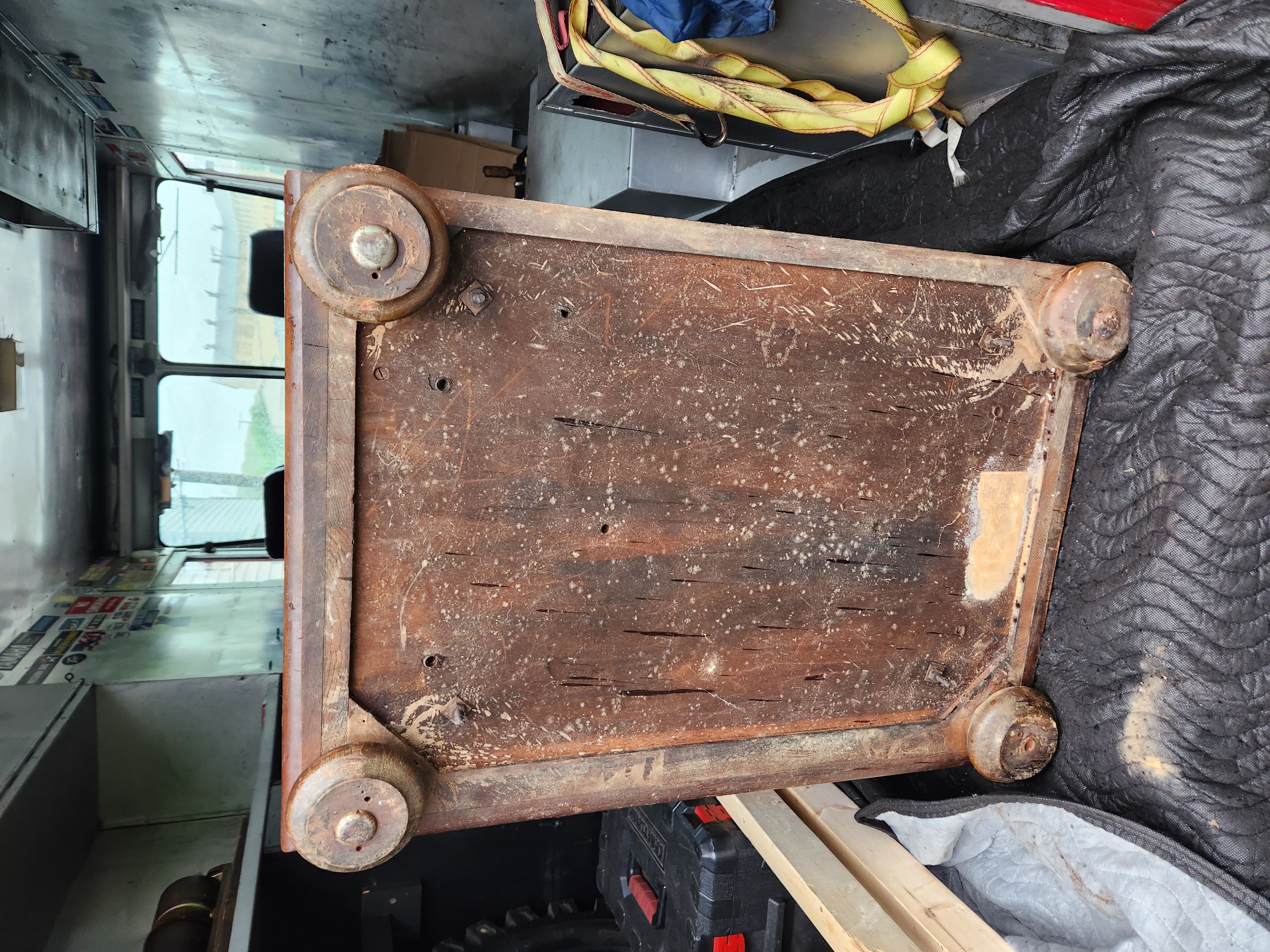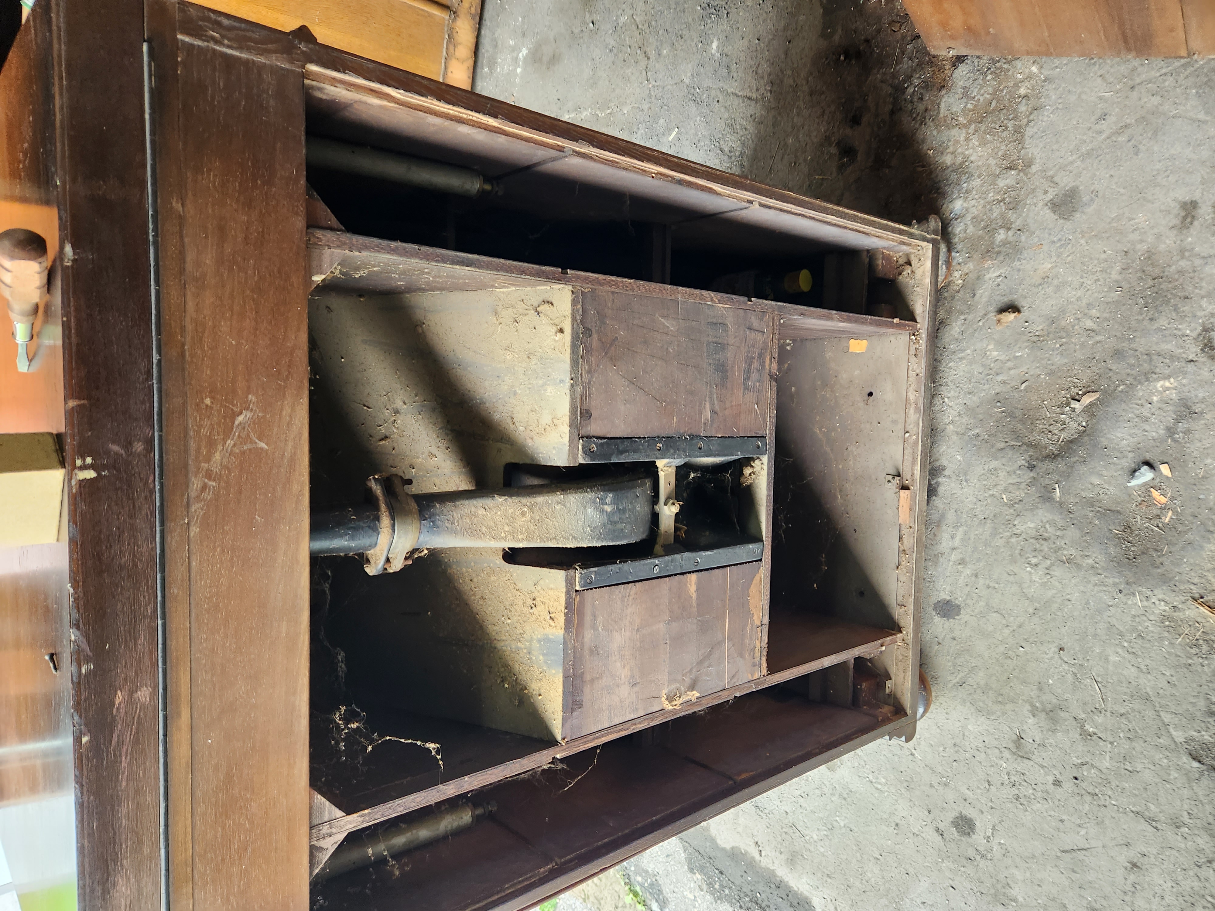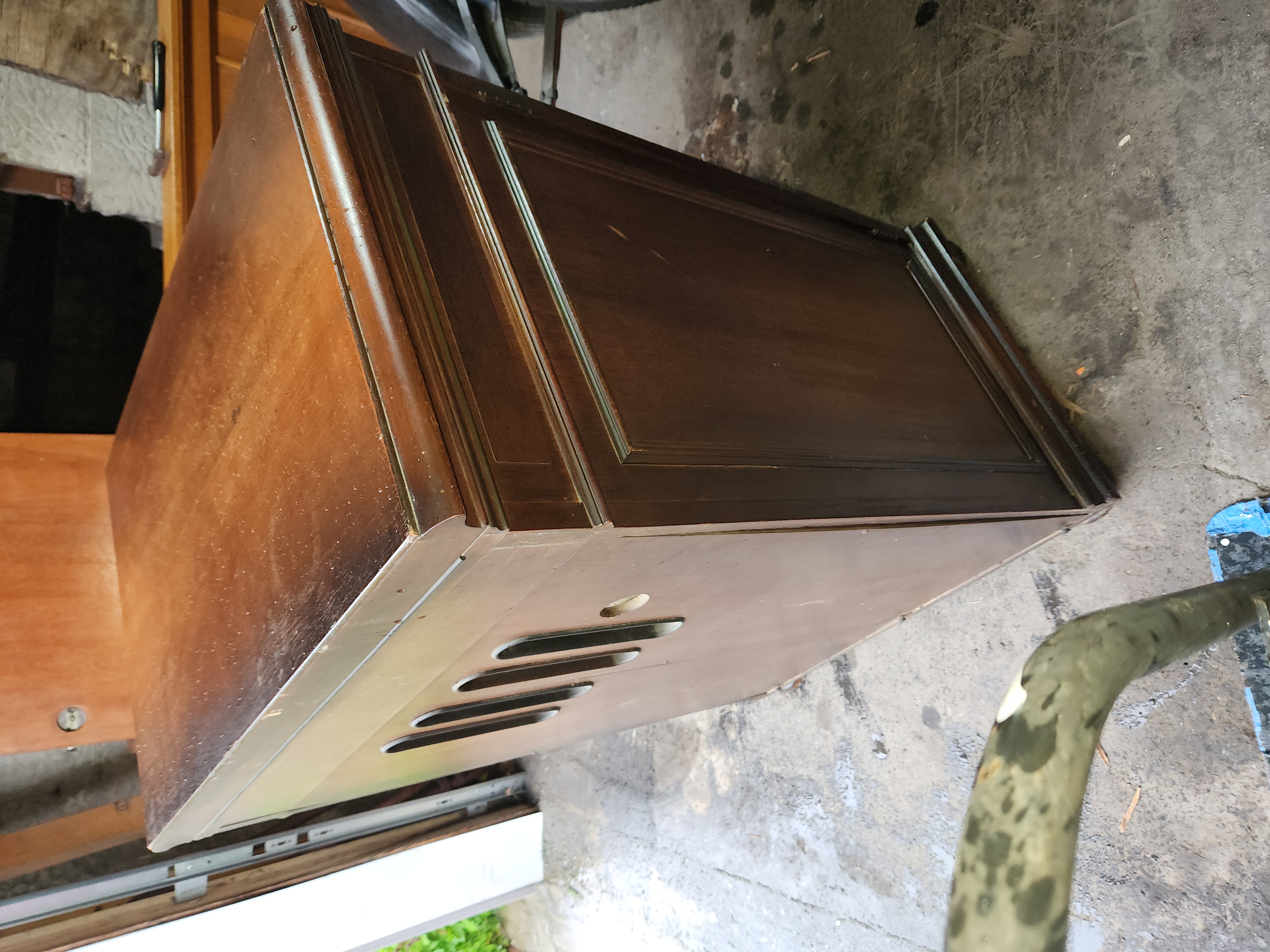 Should be a fairly easy and quick project. Located Roseto Pennsylvania 18013. I am 10 minutes from rt80 and the PA NJ border. 570-856-1387 Lid is a bit banged up with missing spot of veneer. Loose piece trim back side edge. The tone arm bracket is cracked where set screw goes through,its still sturdy and a simple collar should sure that up. I think the tonearm ball bearings are missing. Missing motor board and speed indicator screws, also one knob. Speed regulating system will need to be properly adjusted. Leather panels need to be cleaned and some rubbing in center but that should be easy to color back in. watch video here https://www.youtube.com/watch?v=ky2tQdW-XTo