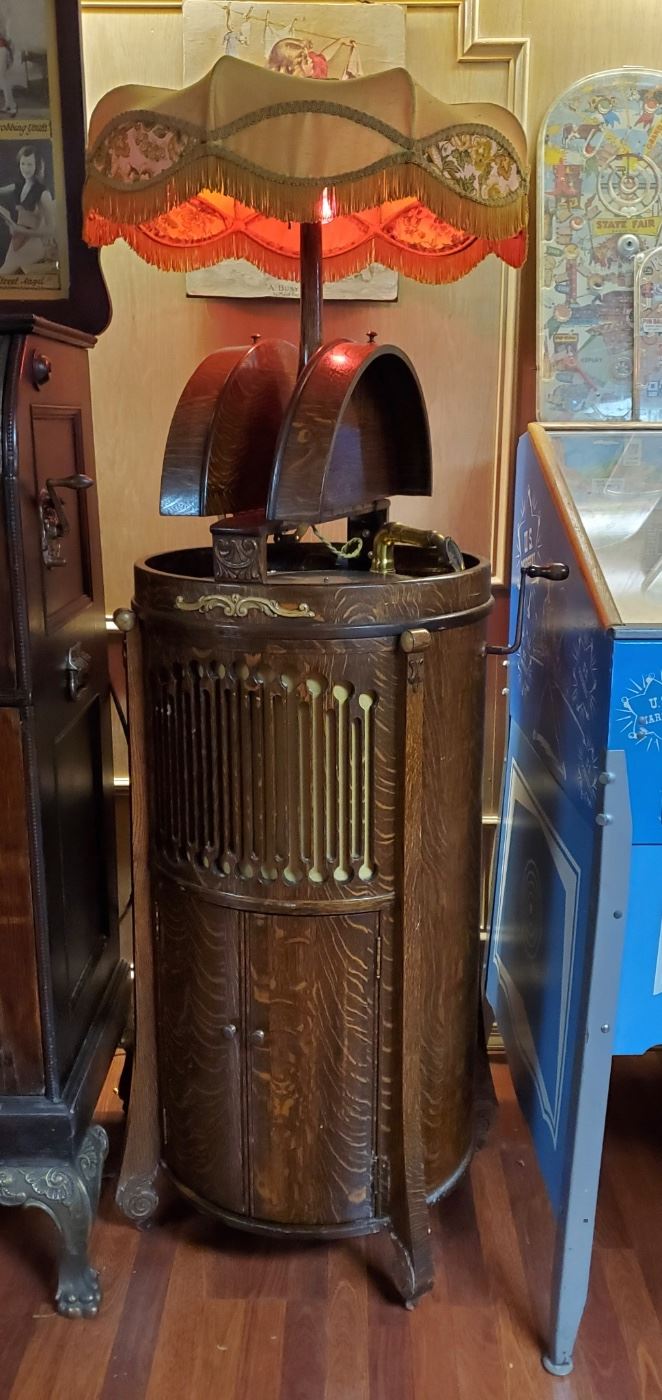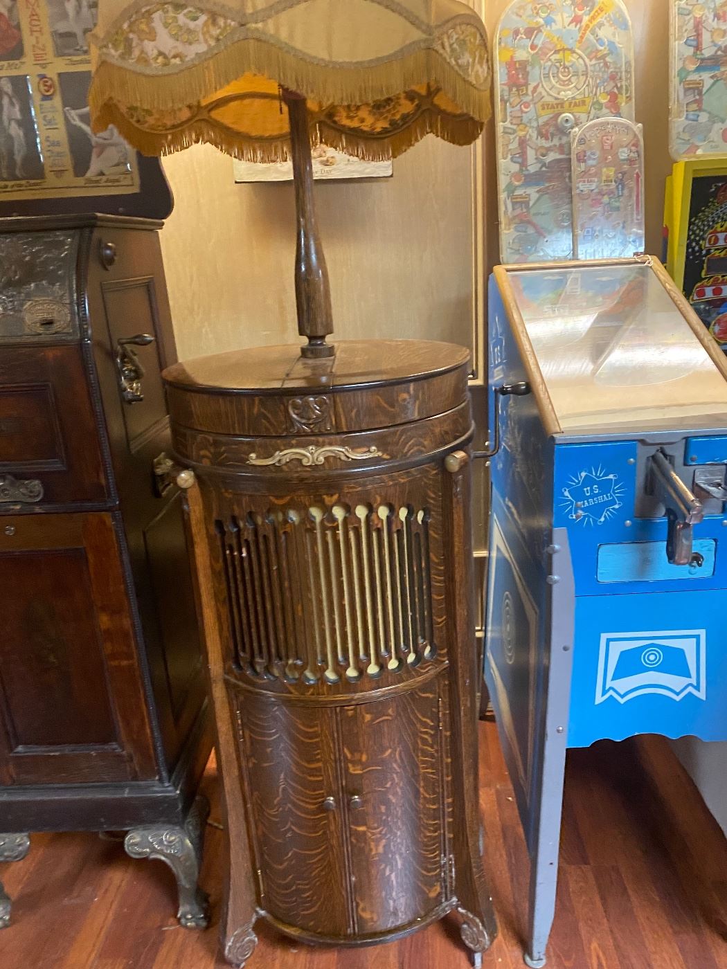 I don't know much about them.. but I haven't seen one in oak AND with the lampshade. That cabinet is really nice...