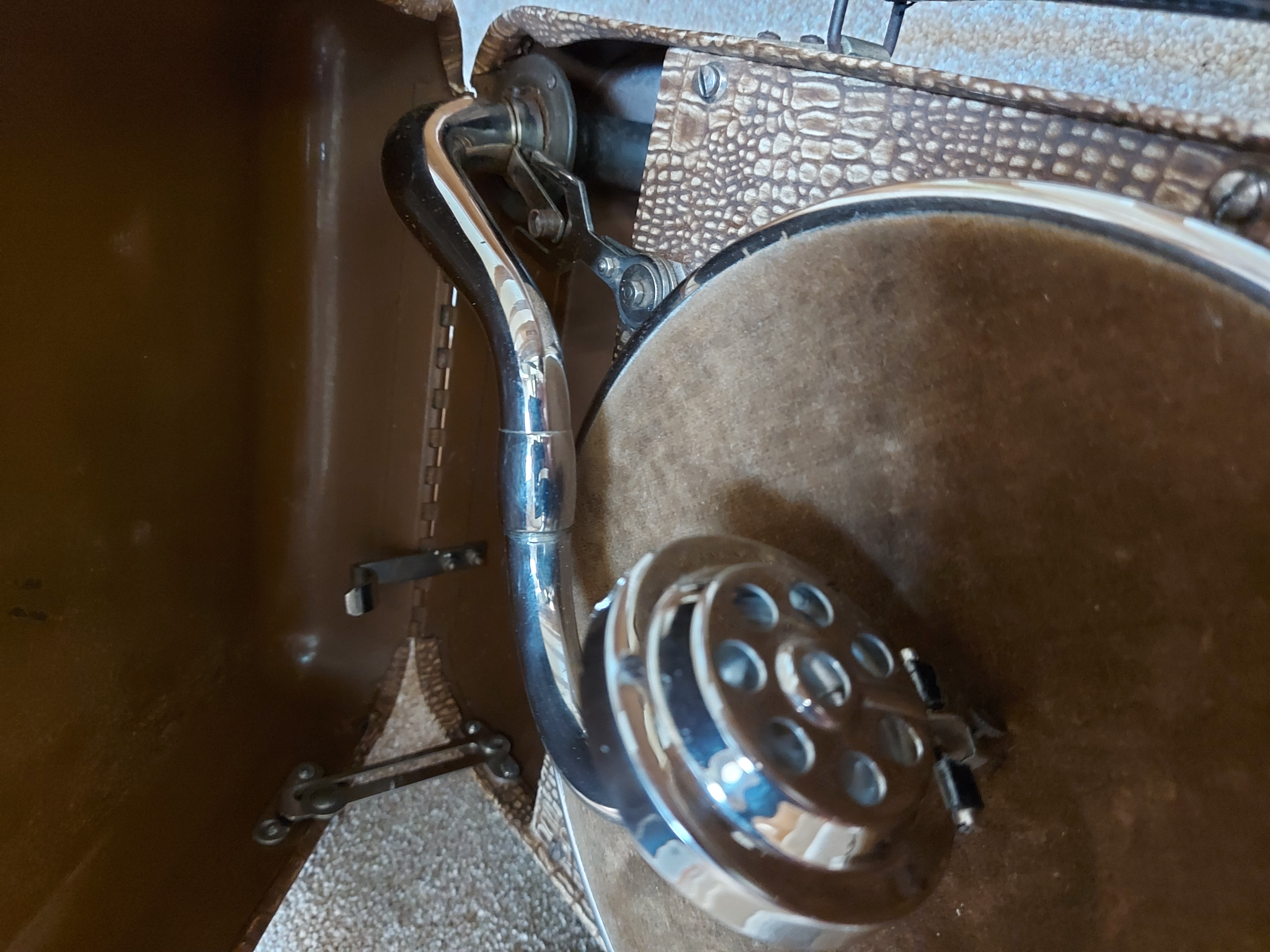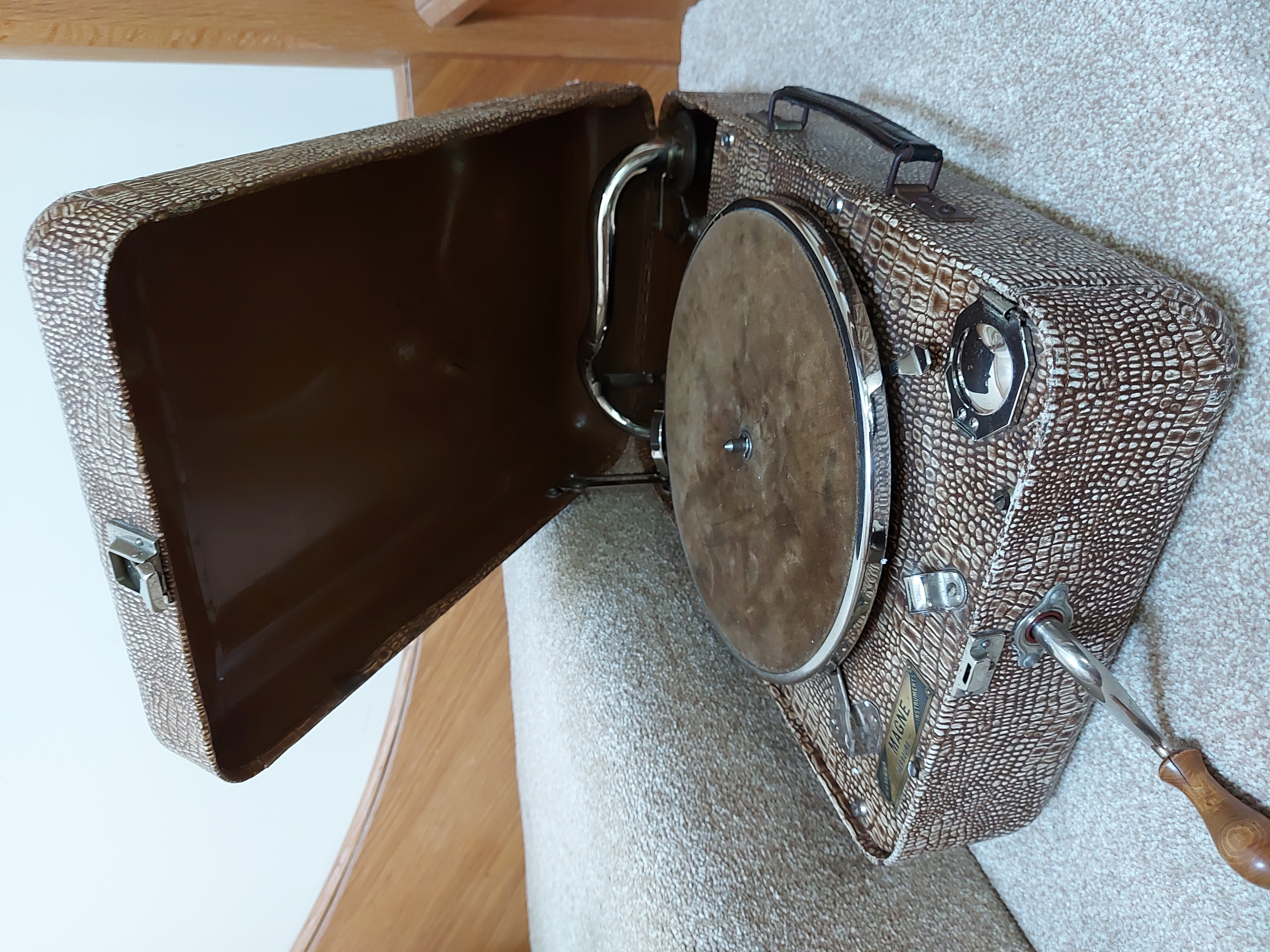 The 10050 was not, as far as I'm aware, ever sold in the UK. The machine is a rigid steel case covered in faux lizard skin rexine. It's very well made and although the case is metal it has an independent and full length steel internal horn which I've attempted to show inside.
