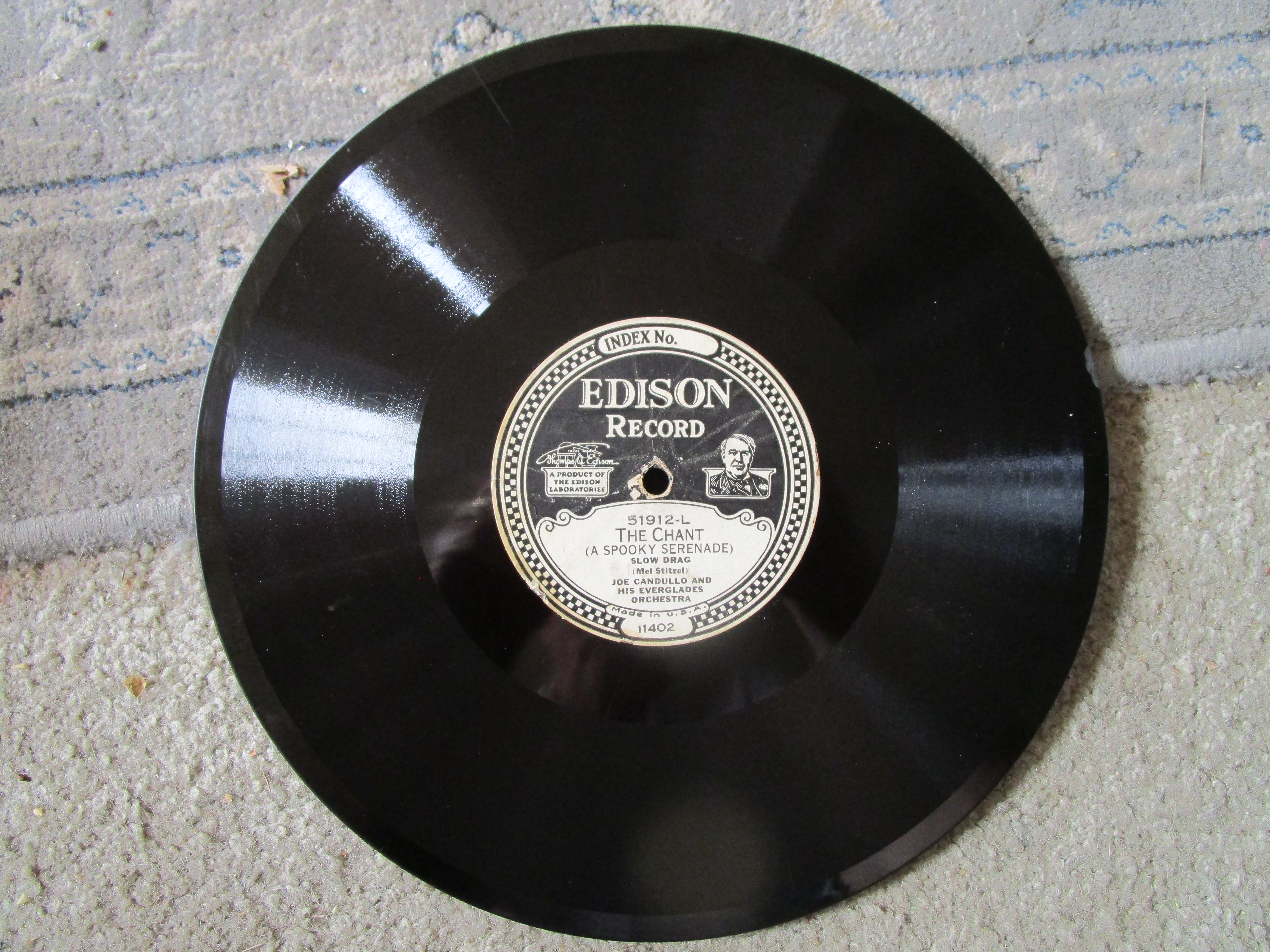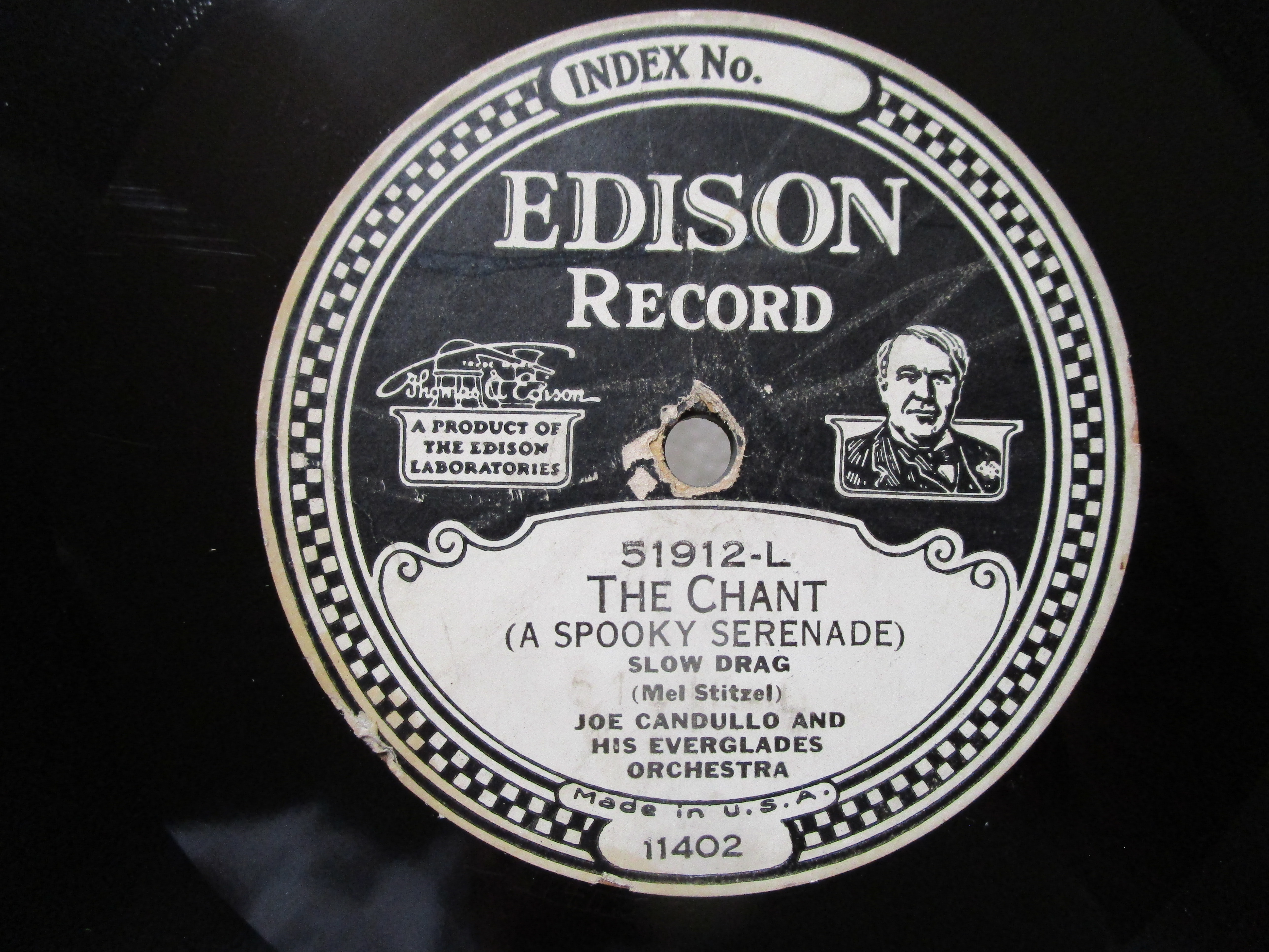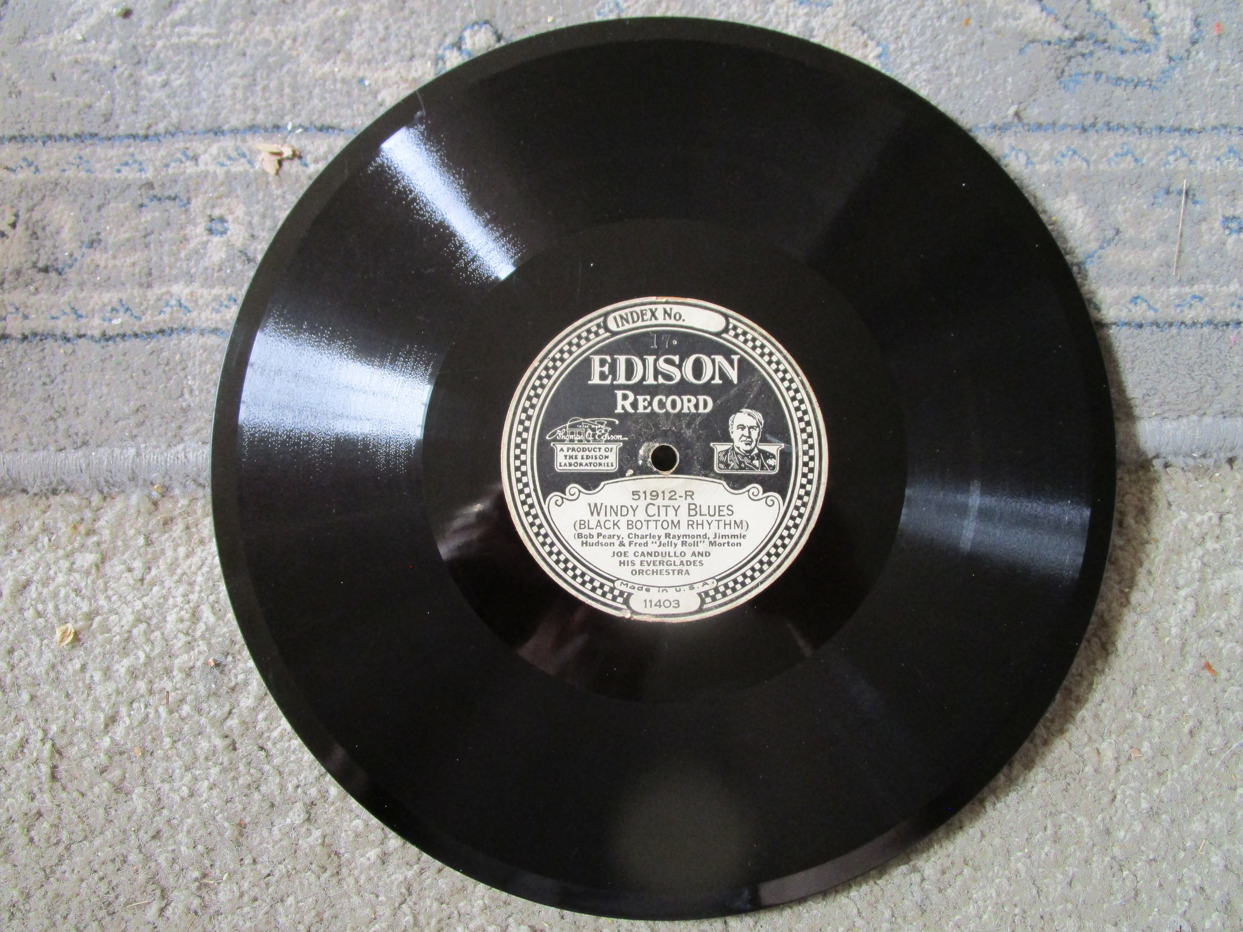 1. 51912 - "WINDY CITY BLUES (BLACK BOTTOM RHYTHM)" -AND- "THE CHANT (A SPOOKY SERENADE) SLOW DRAG" by JOE CANDULLO AND HIS EVERGLADES ORCHESTRA - $125 (tiny edge flake, few scattered light scuffs and a very light scratch. Affects nothing. "Chant" side) (one tiny little light scratch on skating area. Affects nothing. "Windy City Blues" side). I have maintained a white knuckle grip on this particular Edison Diamond Disc for many years as it's the ONLY one I've ever found in more than 35 years of searching for and collecting Edison Diamond Discs. Both sides play nicely.