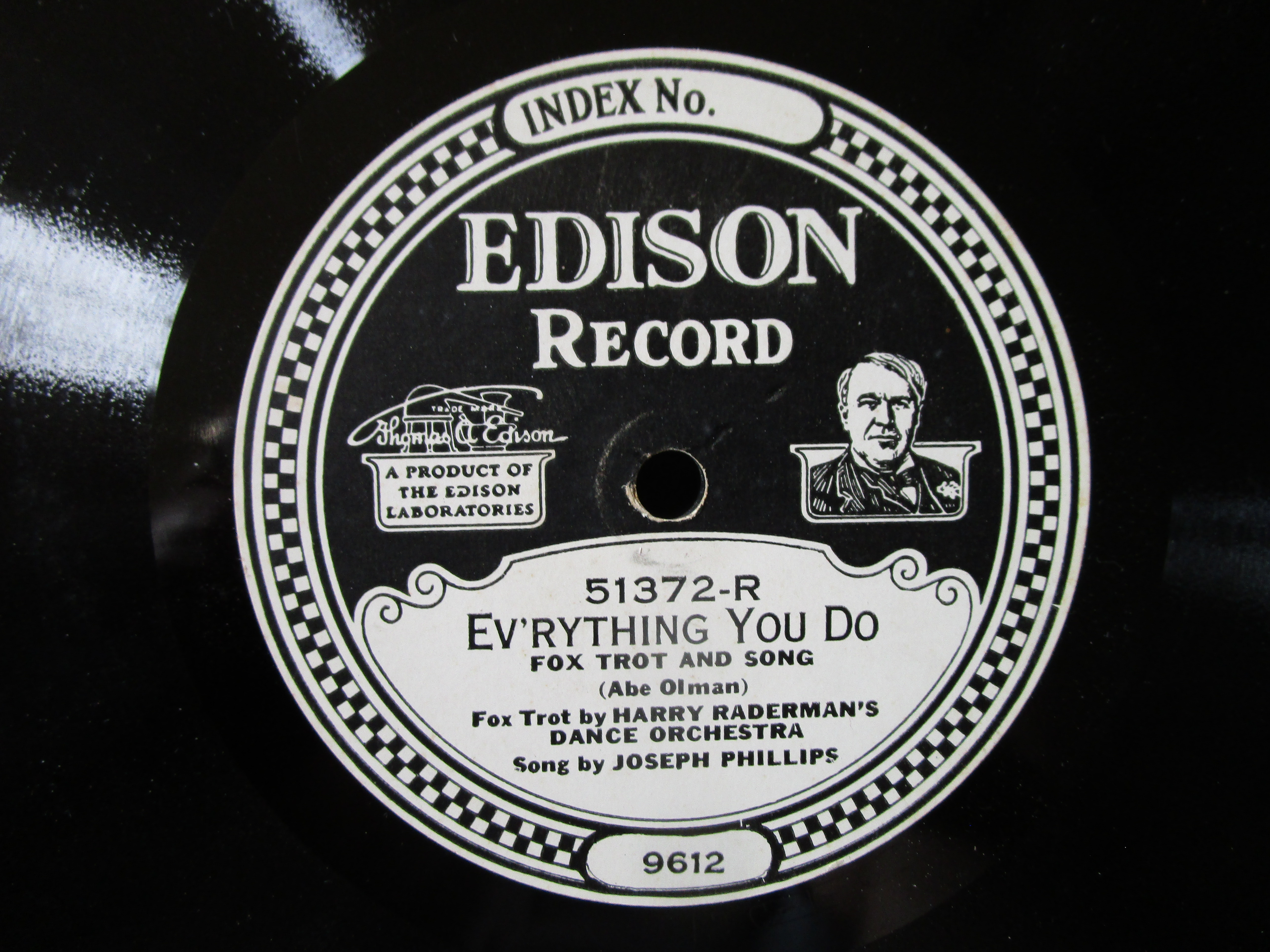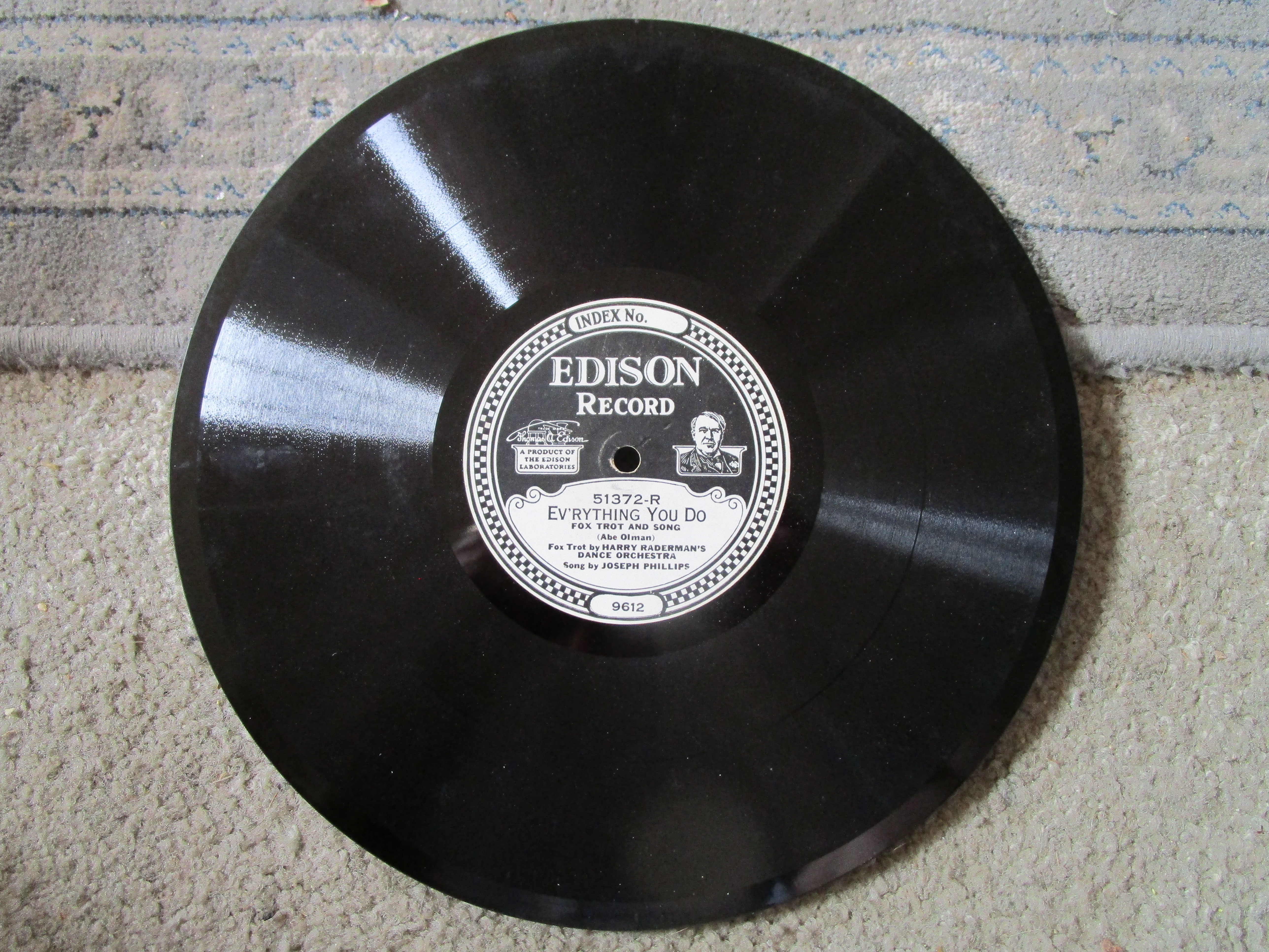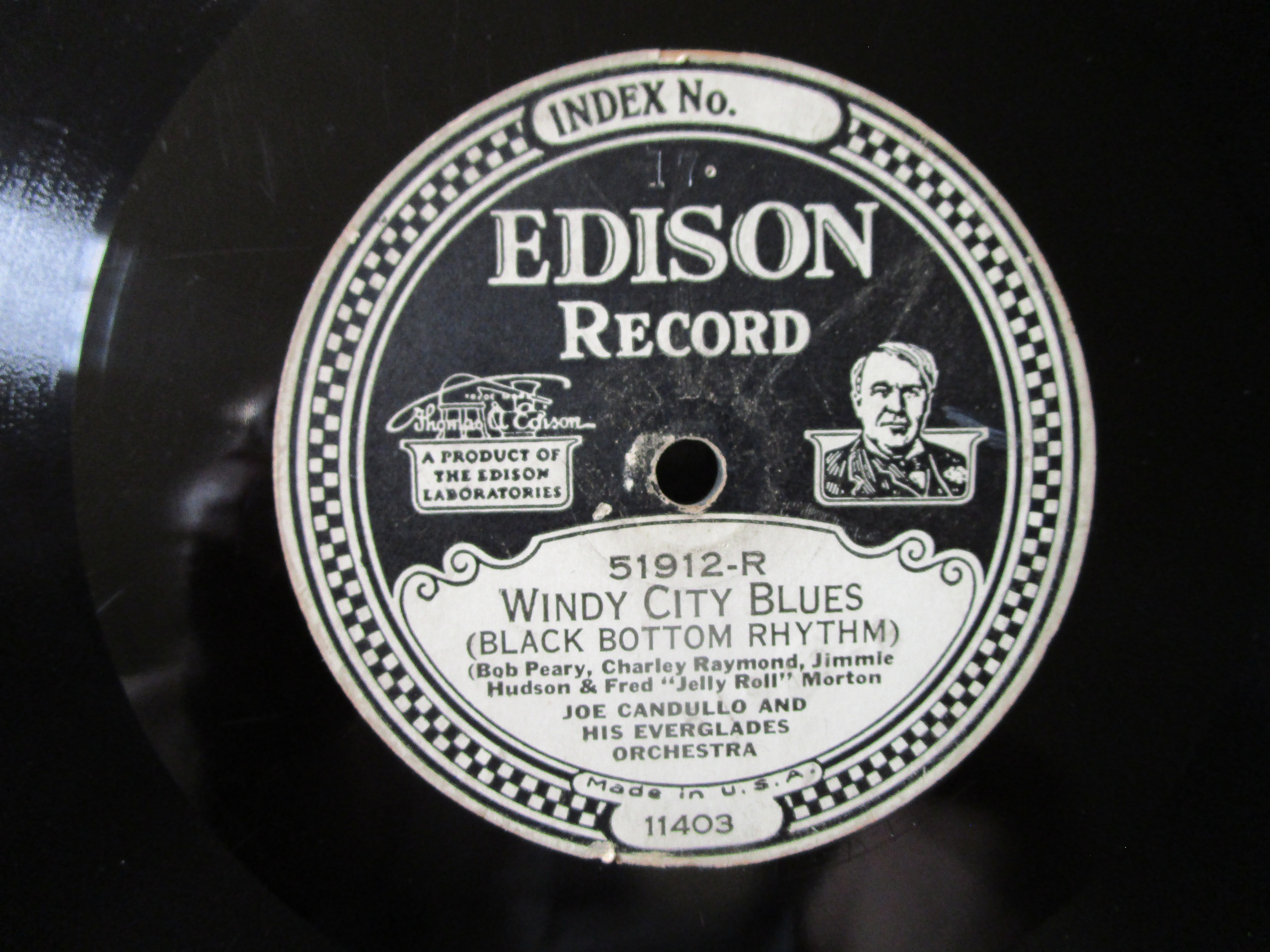 1. 51912 - "WINDY CITY BLUES (BLACK BOTTOM RHYTHM)" -AND- "THE CHANT (A SPOOKY SERENADE) SLOW DRAG" by JOE CANDULLO AND HIS EVERGLADES ORCHESTRA - $125 (tiny edge flake, few scattered light scuffs and a very light scratch. Affects nothing. "Chant" side) (one tiny little light scratch on skating area. Affects nothing. "Windy City Blues" side). I have maintained a white knuckle grip on this particular Edison Diamond Disc for many years as it's the ONLY one I've ever found in more than 35 years of searching for and collecting Edison Diamond Discs. Both sides play nicely.