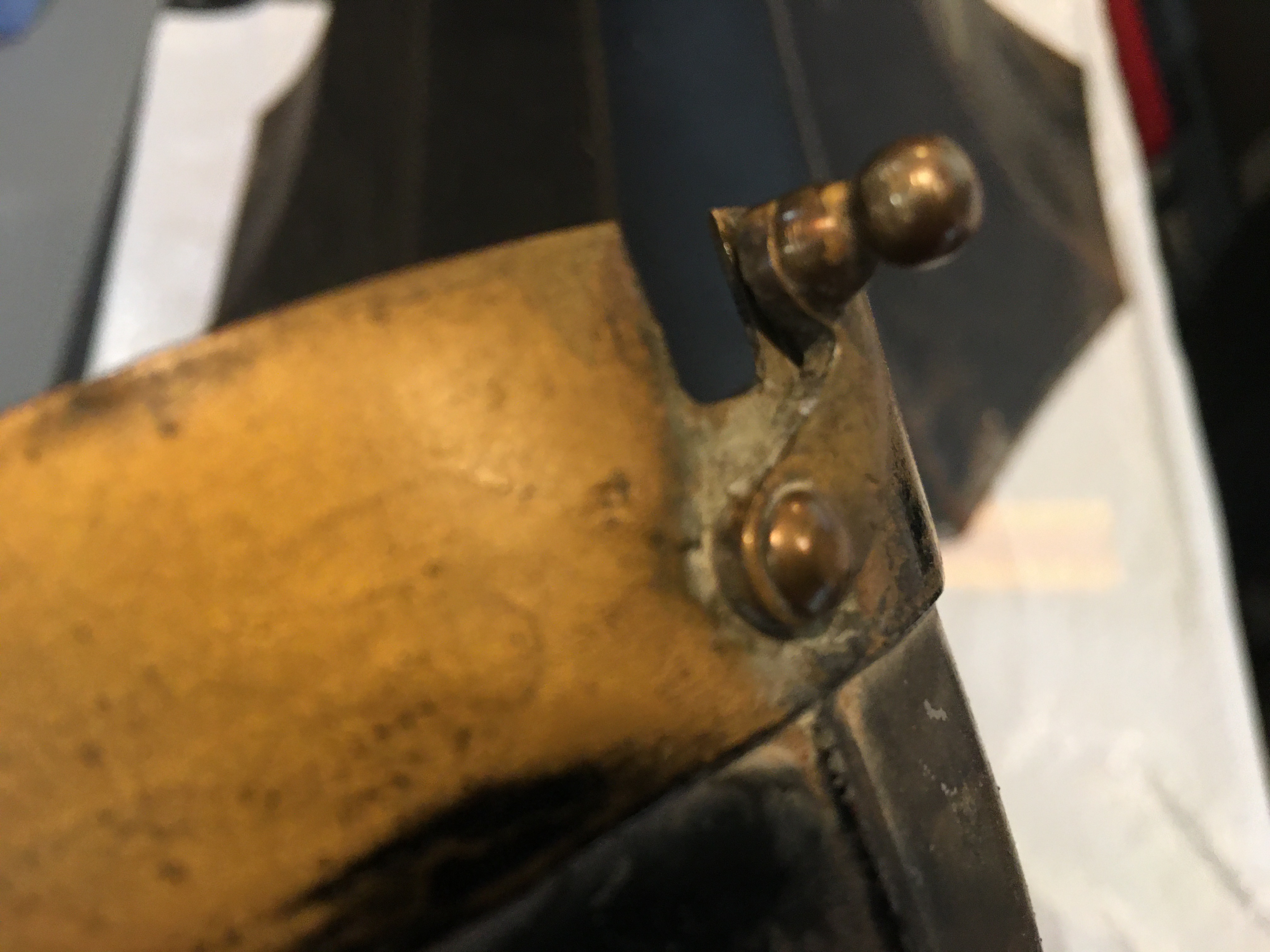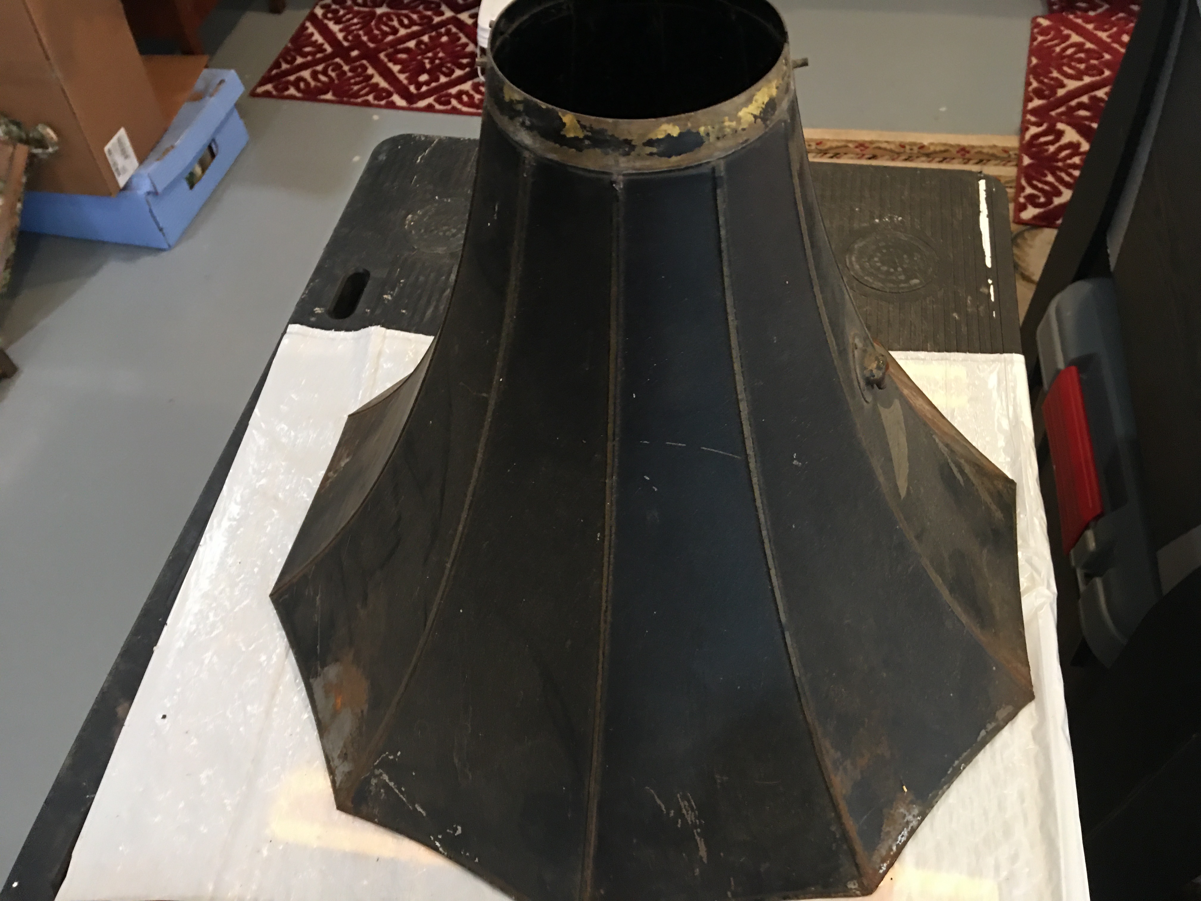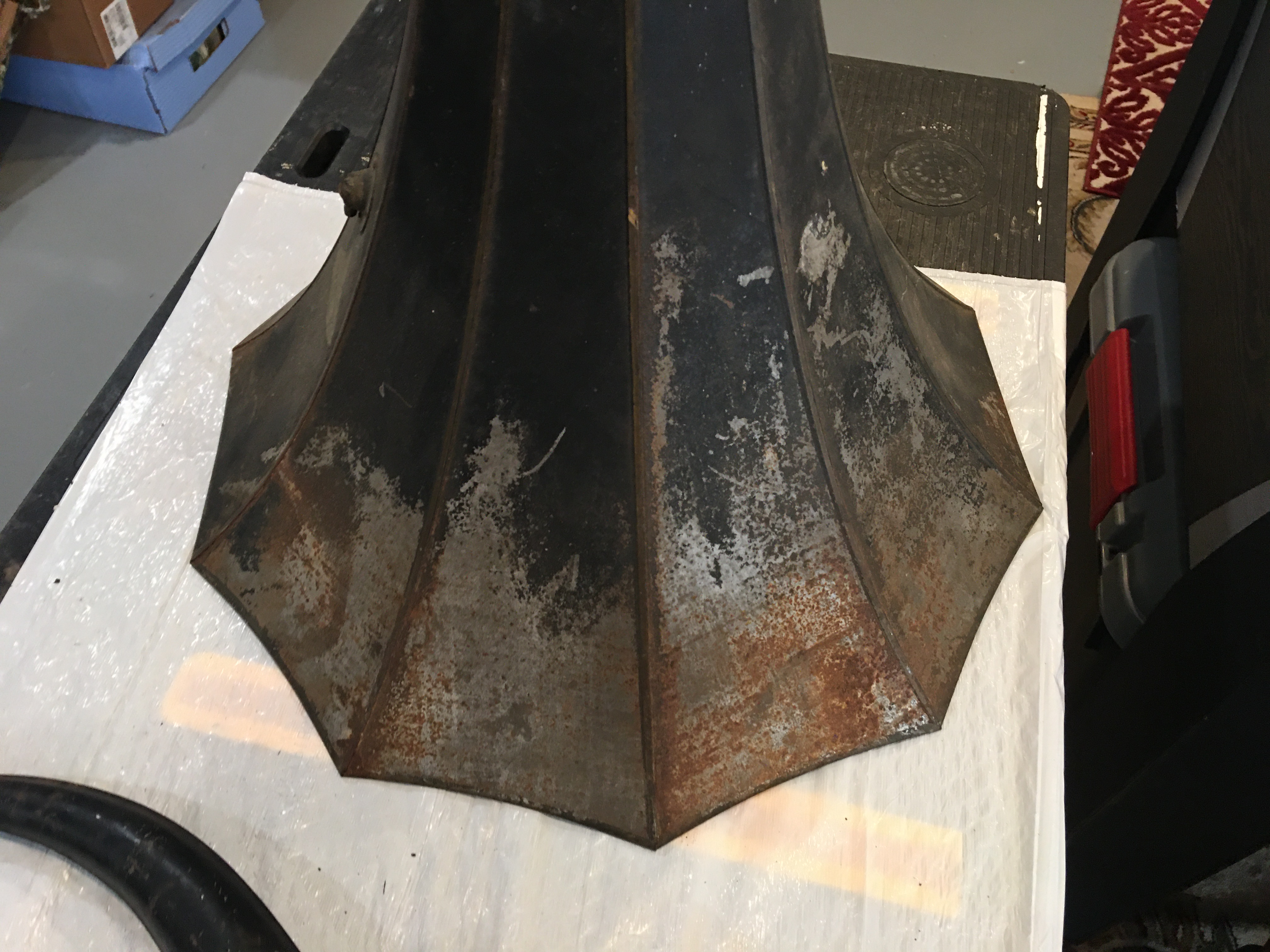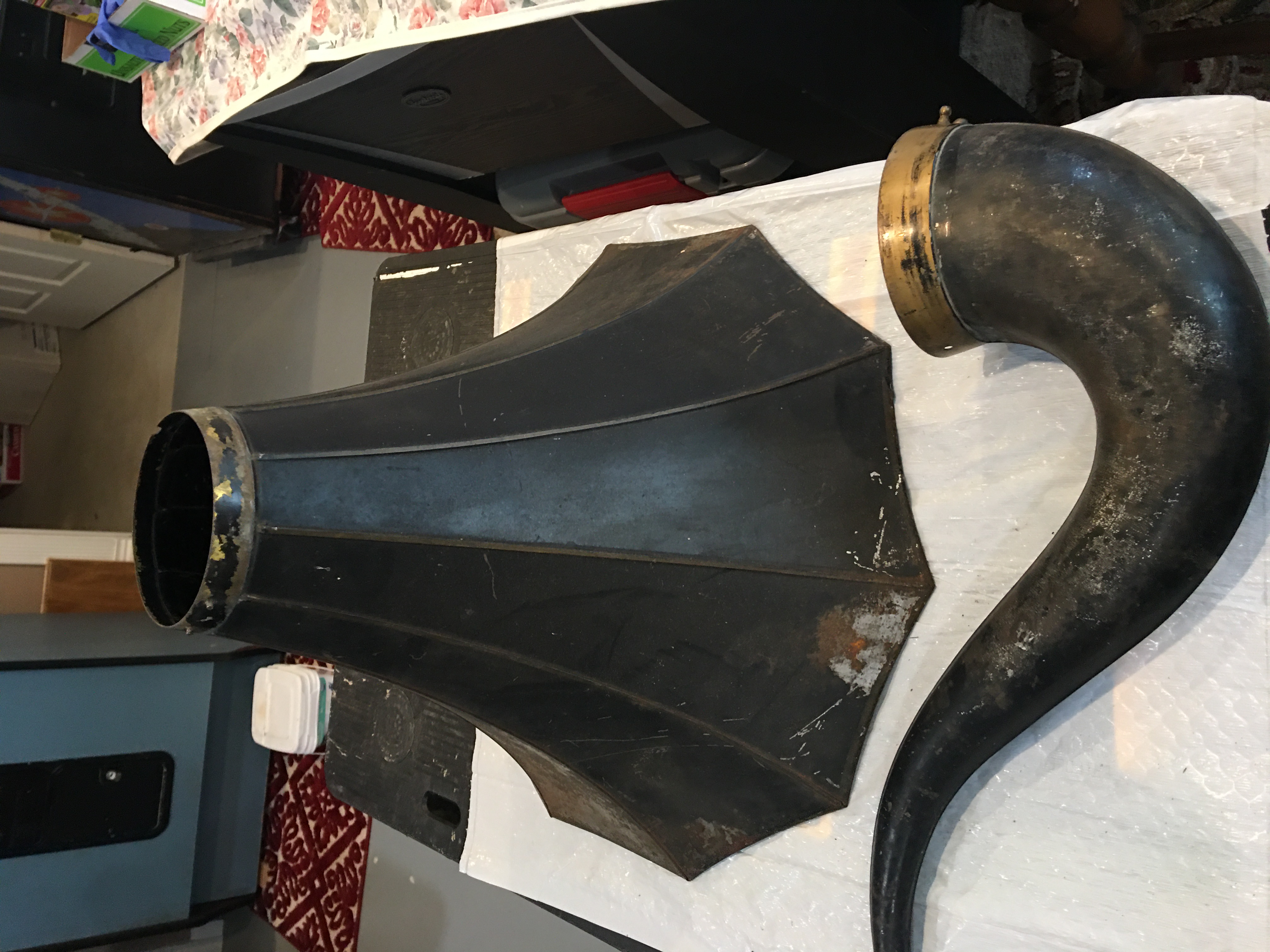 Edison Cygnet Horn. Needs refinish. Someone "repaired" the locking lever on the curved portion of the horn i.e. resoldered. They didn't get the position quite right and I can't get it to lock to the bell. Will need to have solder melted and locking lever repositioned. $225