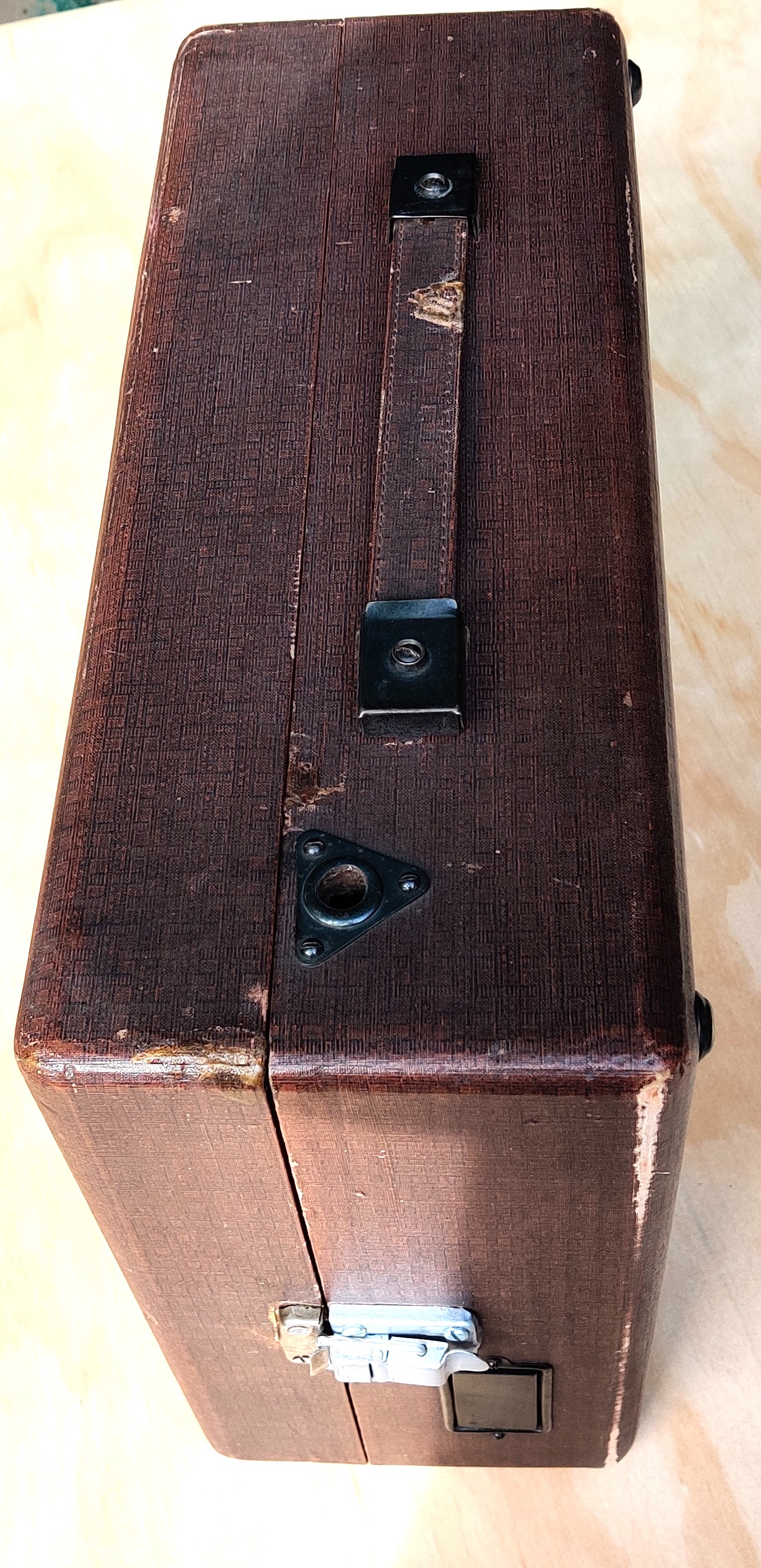 A real curiosity, this! There are a few "Columbia" style fittings as found on the Japanese models, i.e, the record rack in the lid (also found on the British Columbia 112A), the auto brake, the lid closing mechanism and the "wings" on the sides of the internal horn. The trade mark is very akin to that on the British "Dulcetto" portables, though differently coloured. Hmm......